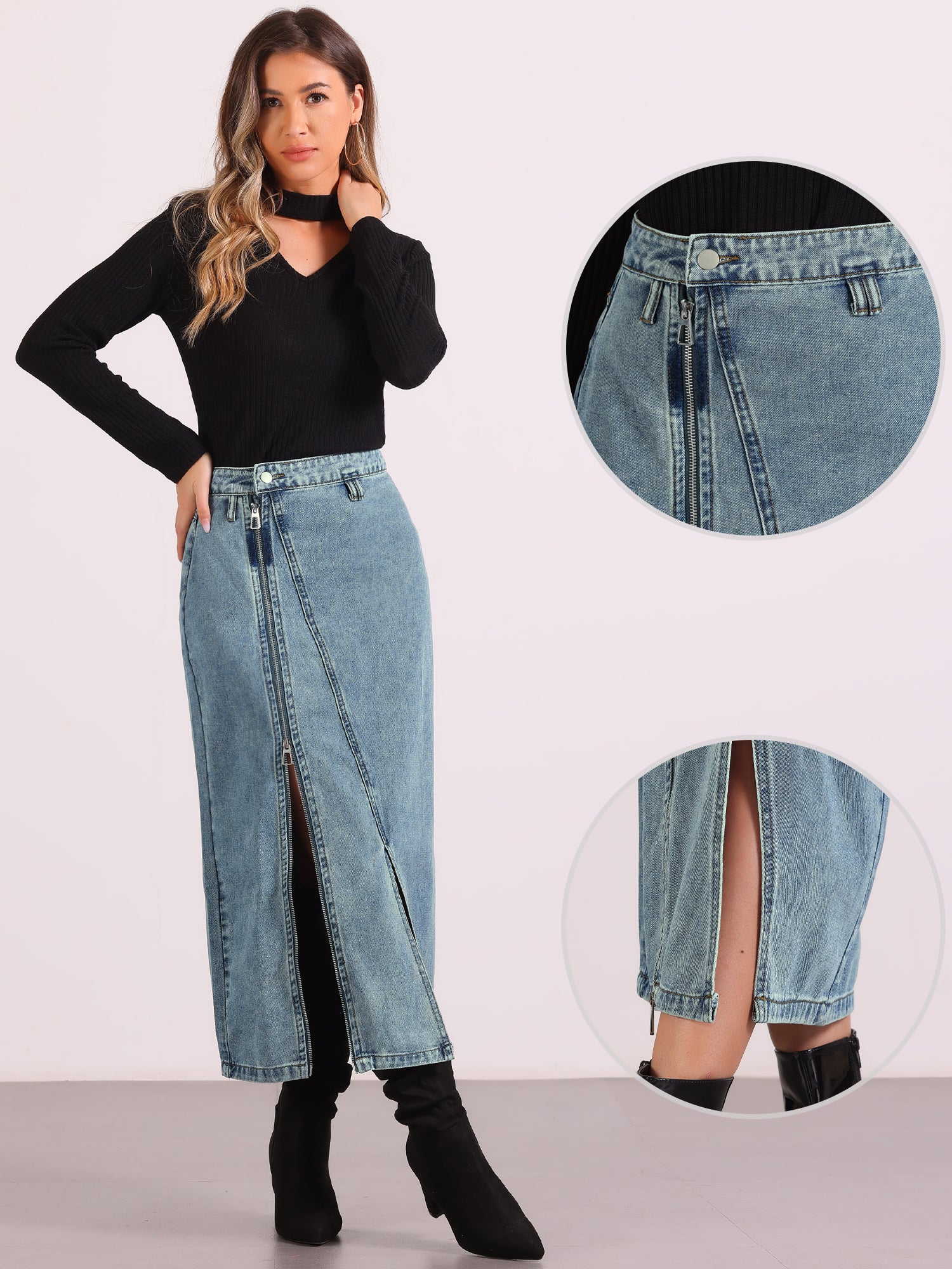 Women's Denim Zipper Front Split Long Skirts with Pockets
