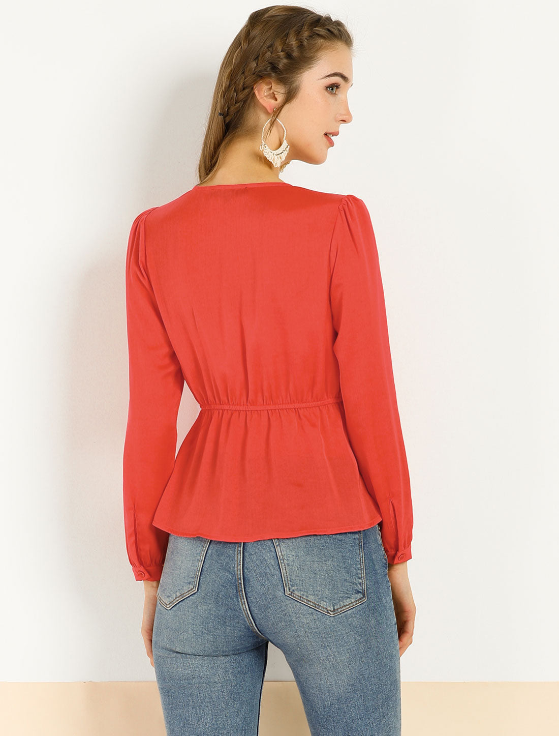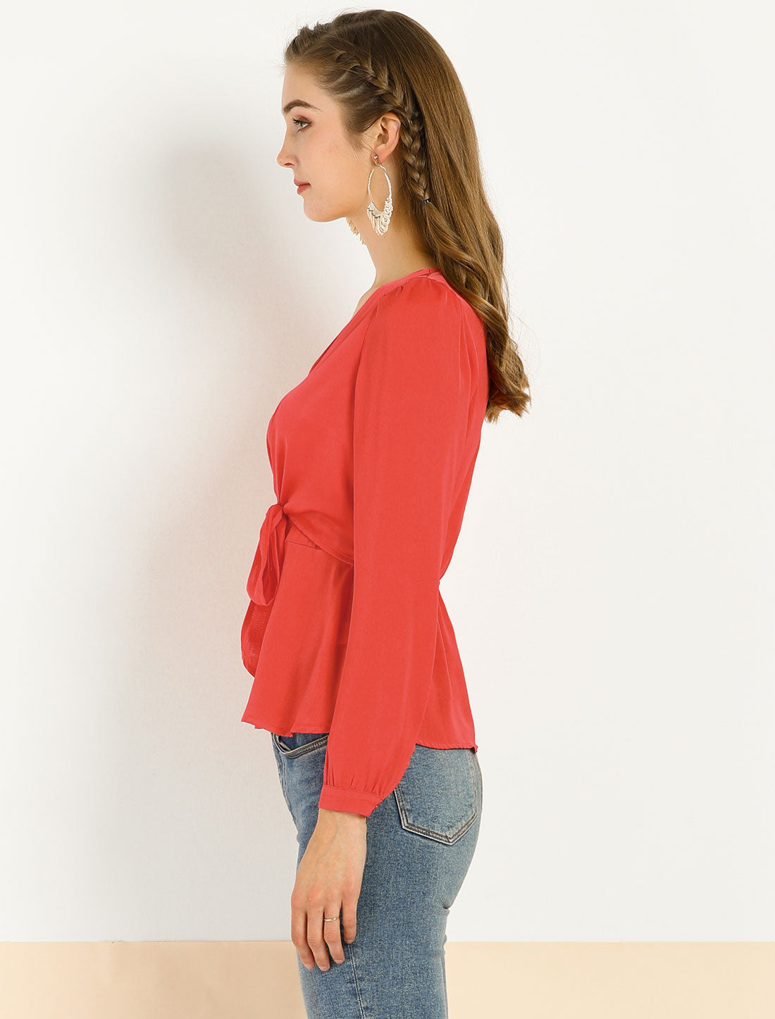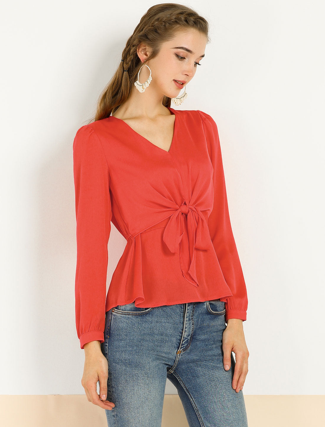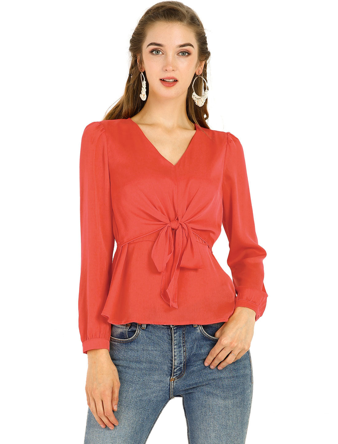Women's Elegant Bow Tie Waist Blouse V Neck Pelum Top
