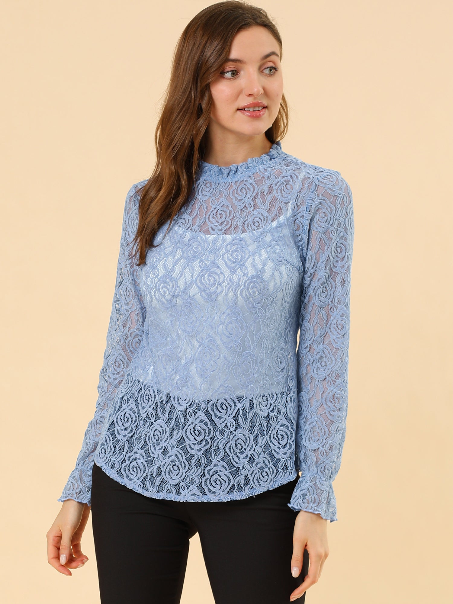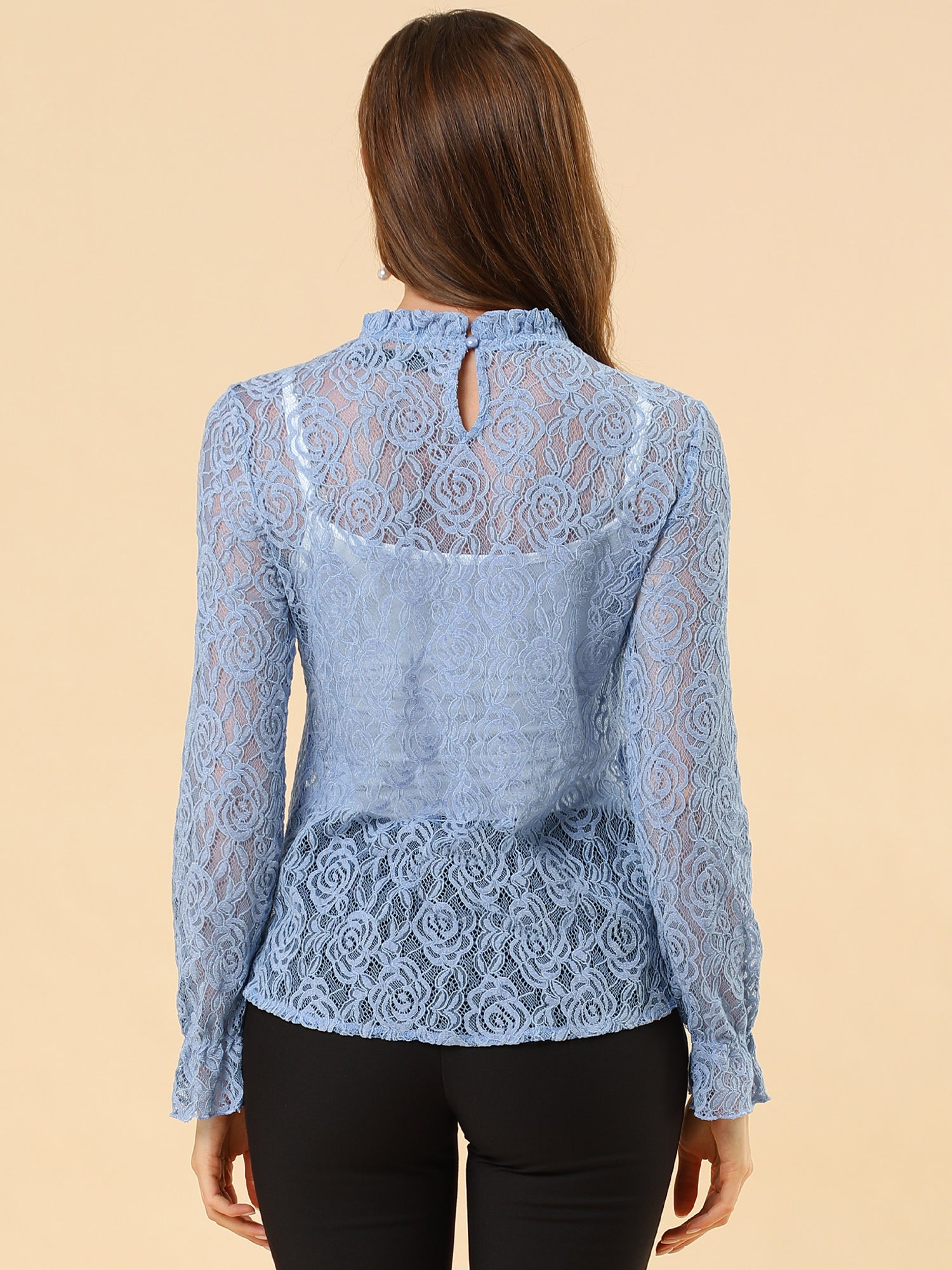 Women's Elegant See Through Top Ruffle Frill Neck Long Sleeve Floral Lace Blouse