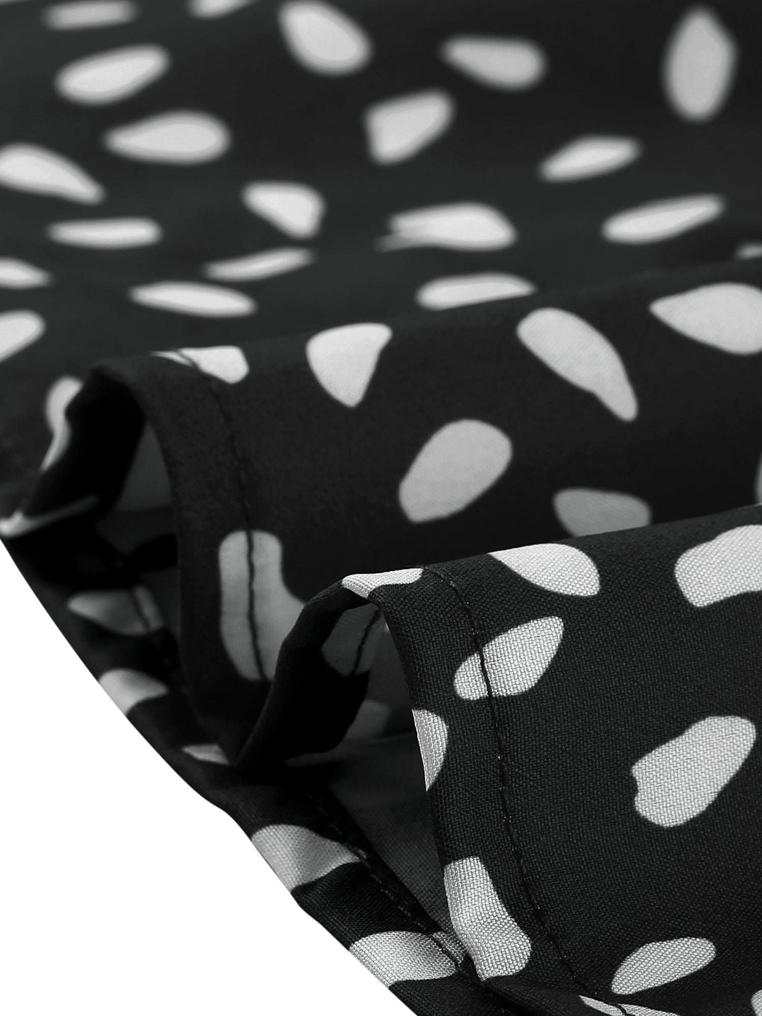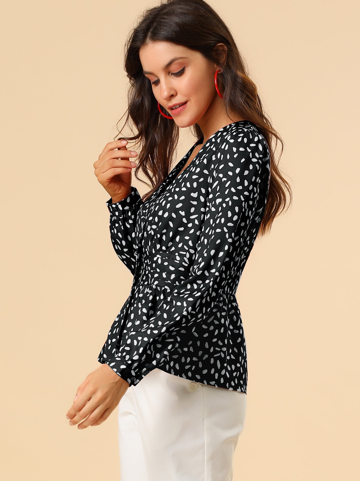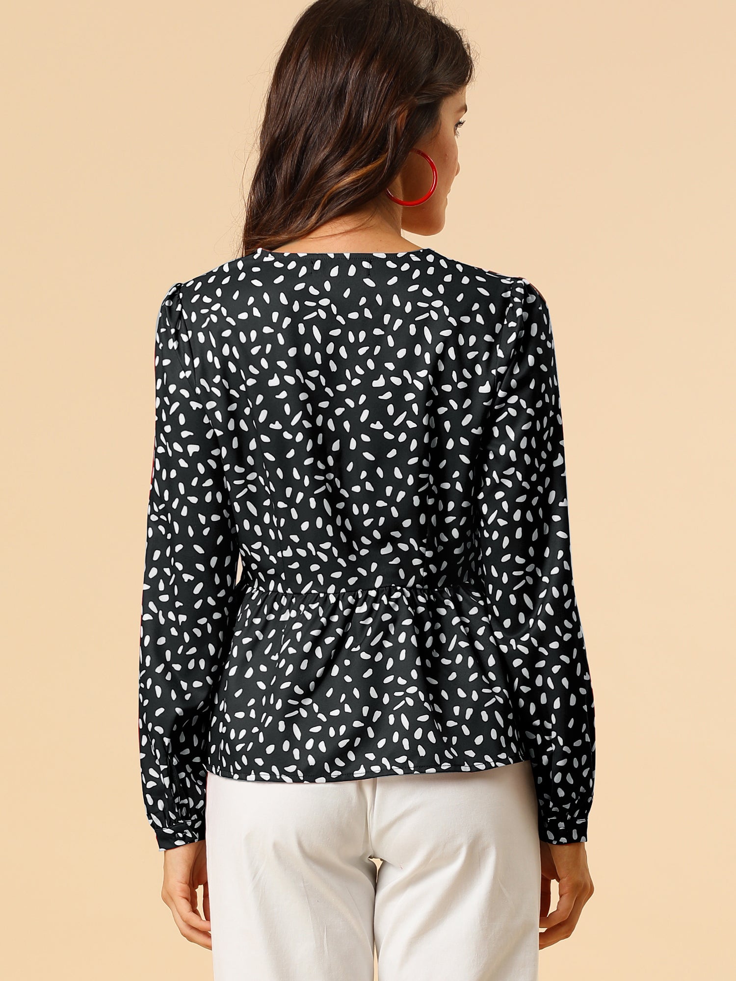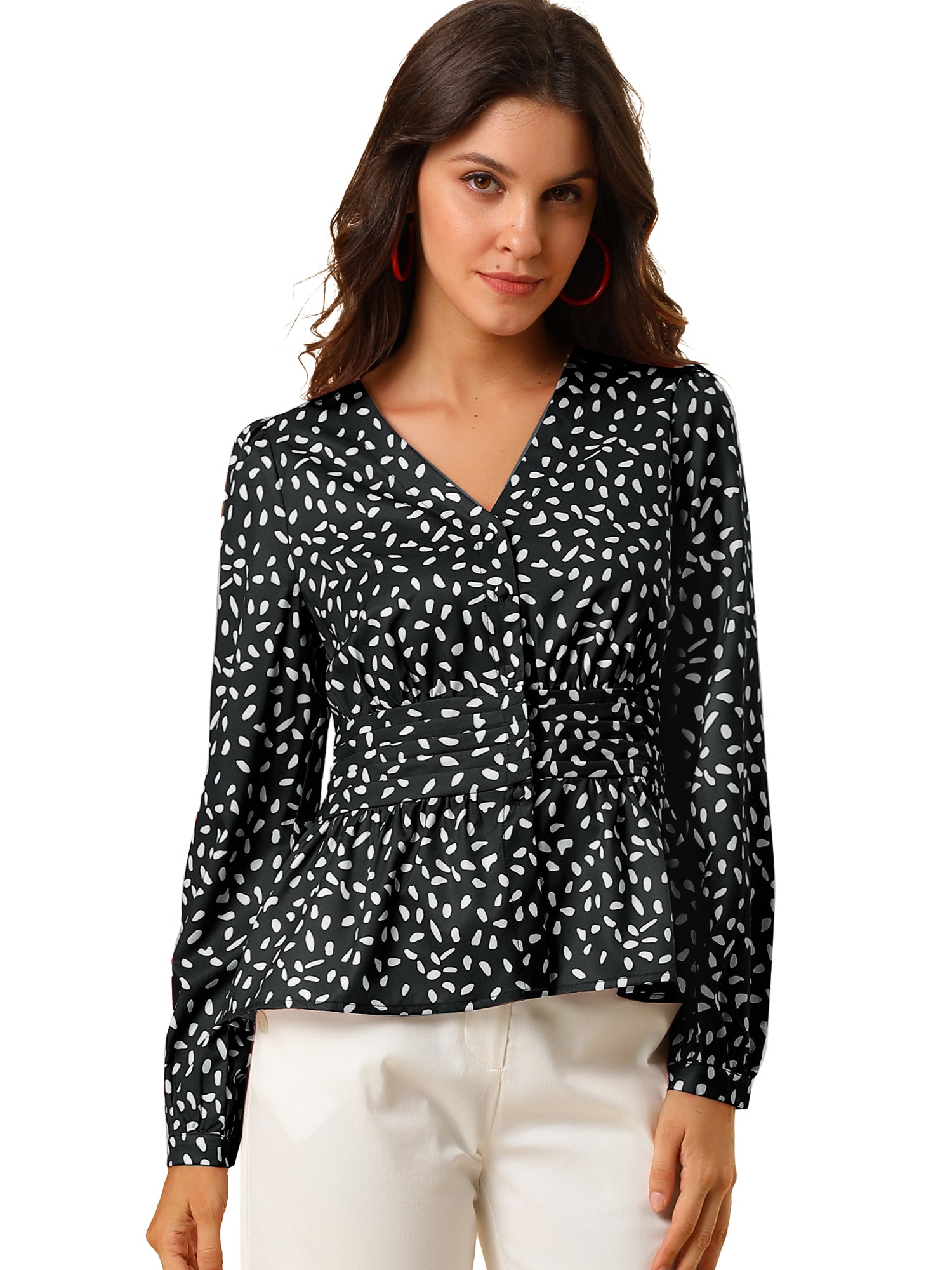Women's Elegant V Neck Dots Print Smocked Ruffled Hem Button Peplum Blouse