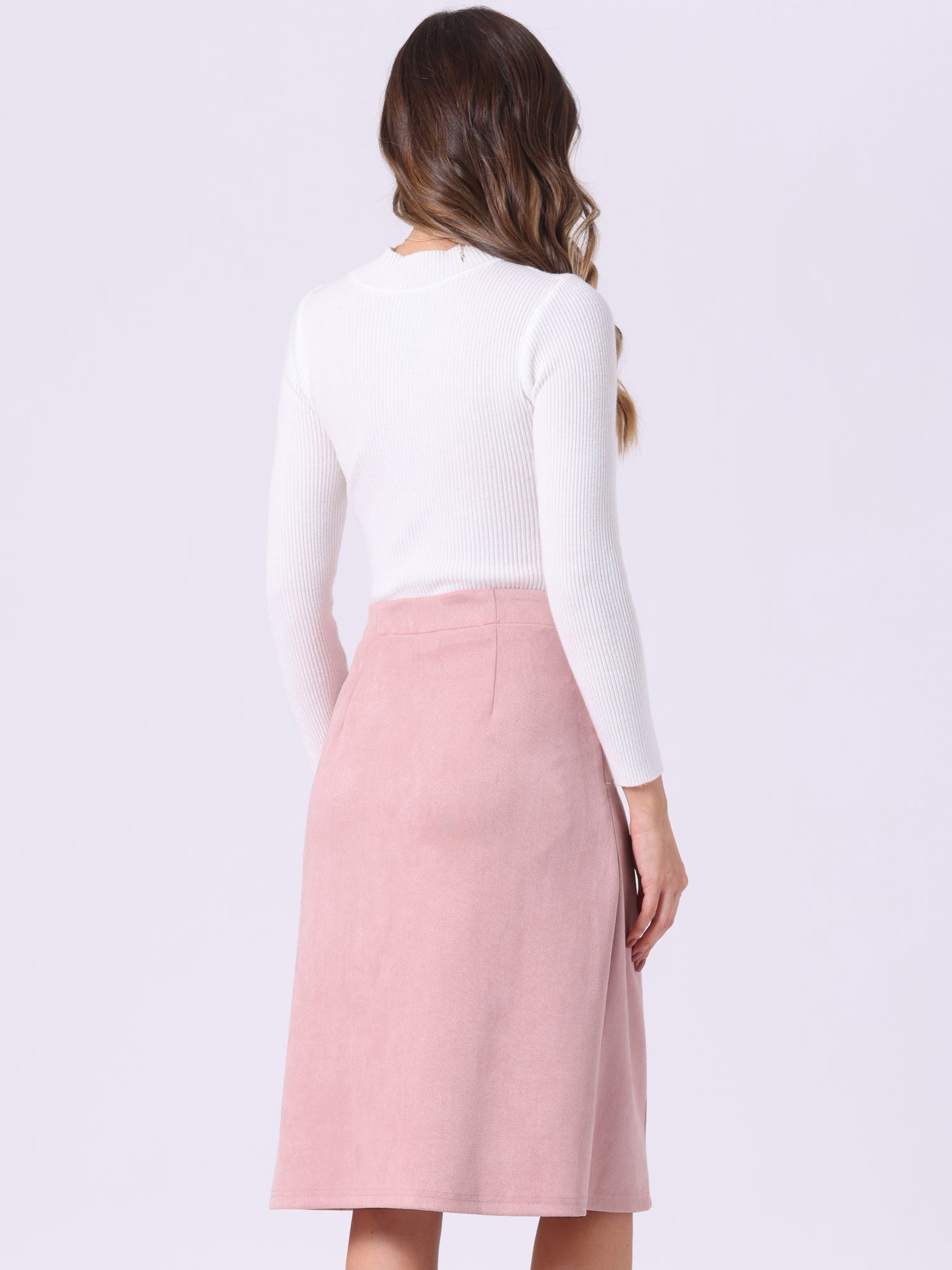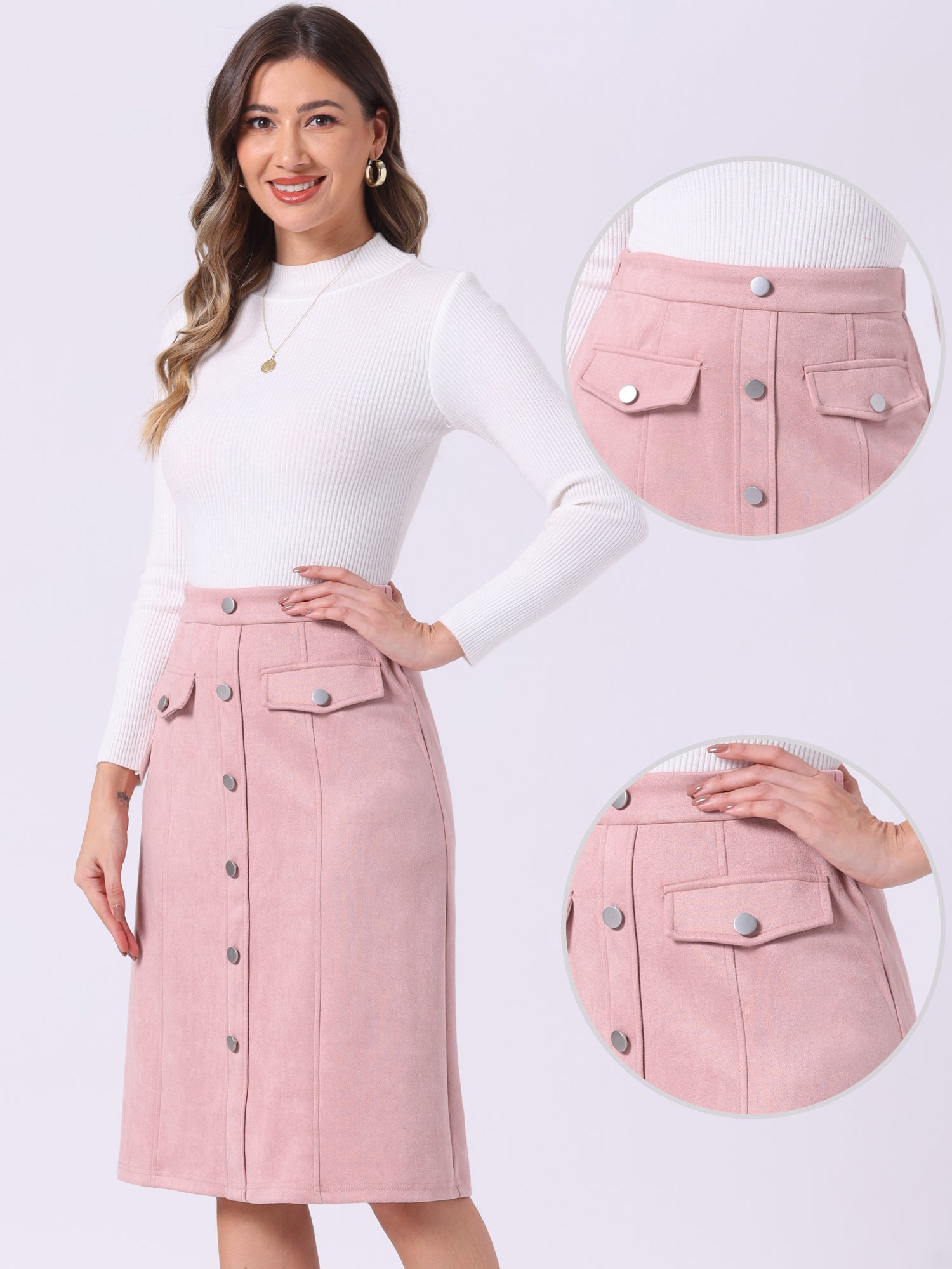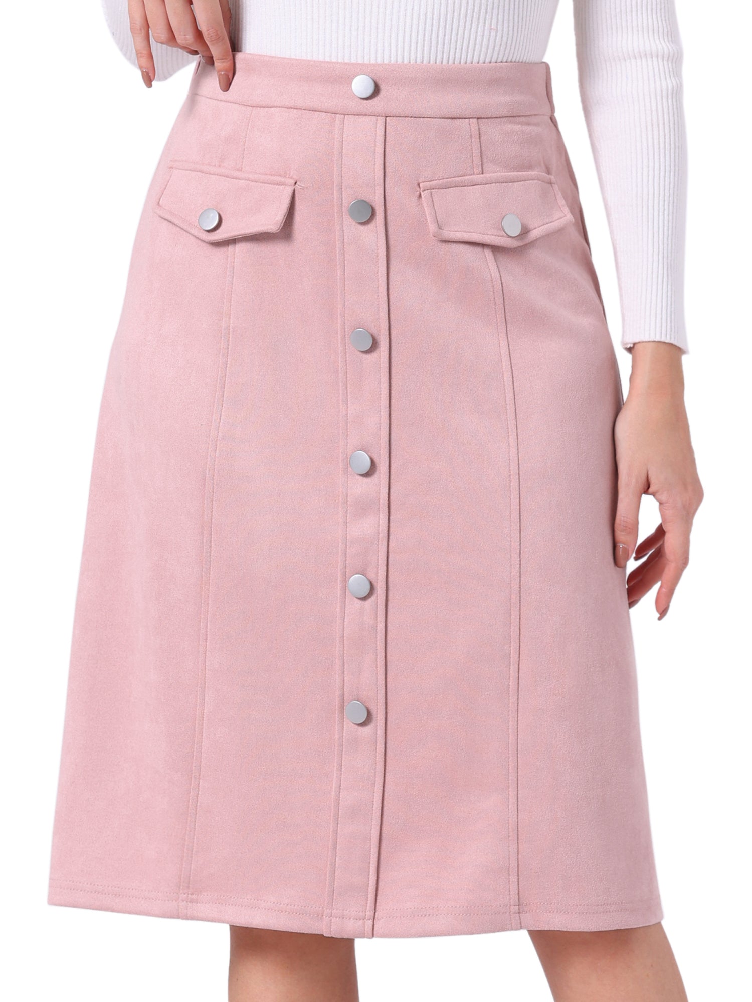 Women's Faux Suede Skirt Button Front High Waist Fall Knee Length A-Line Skirts