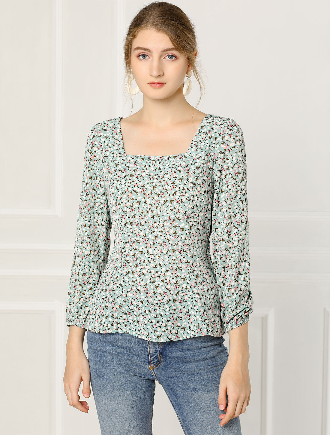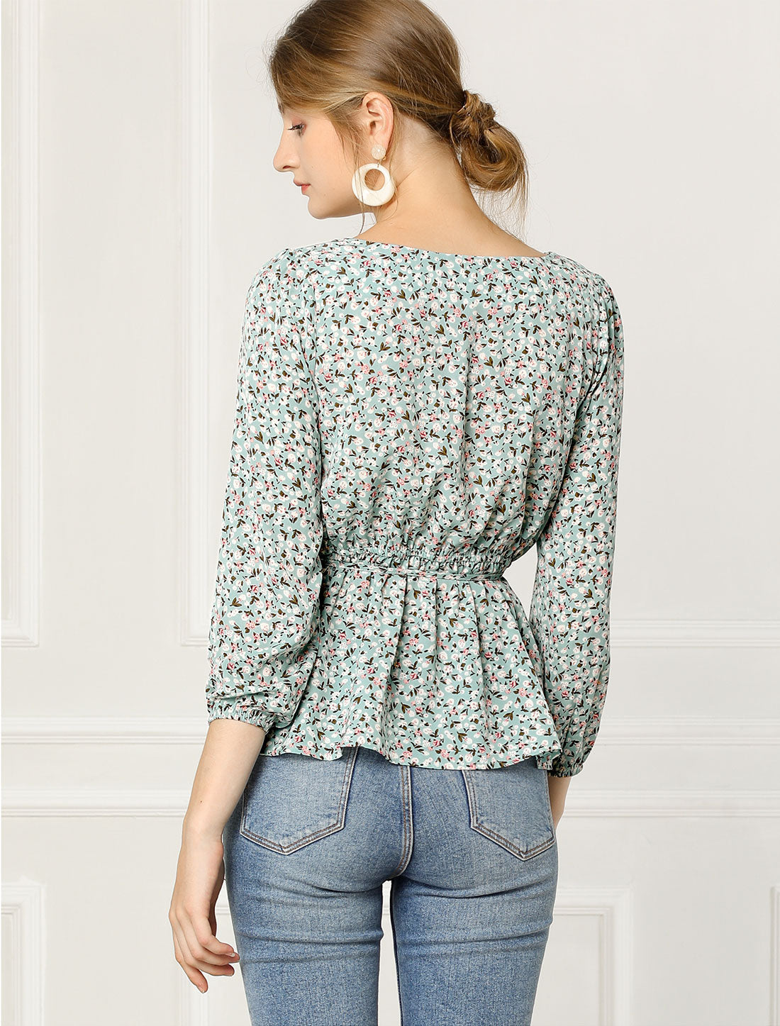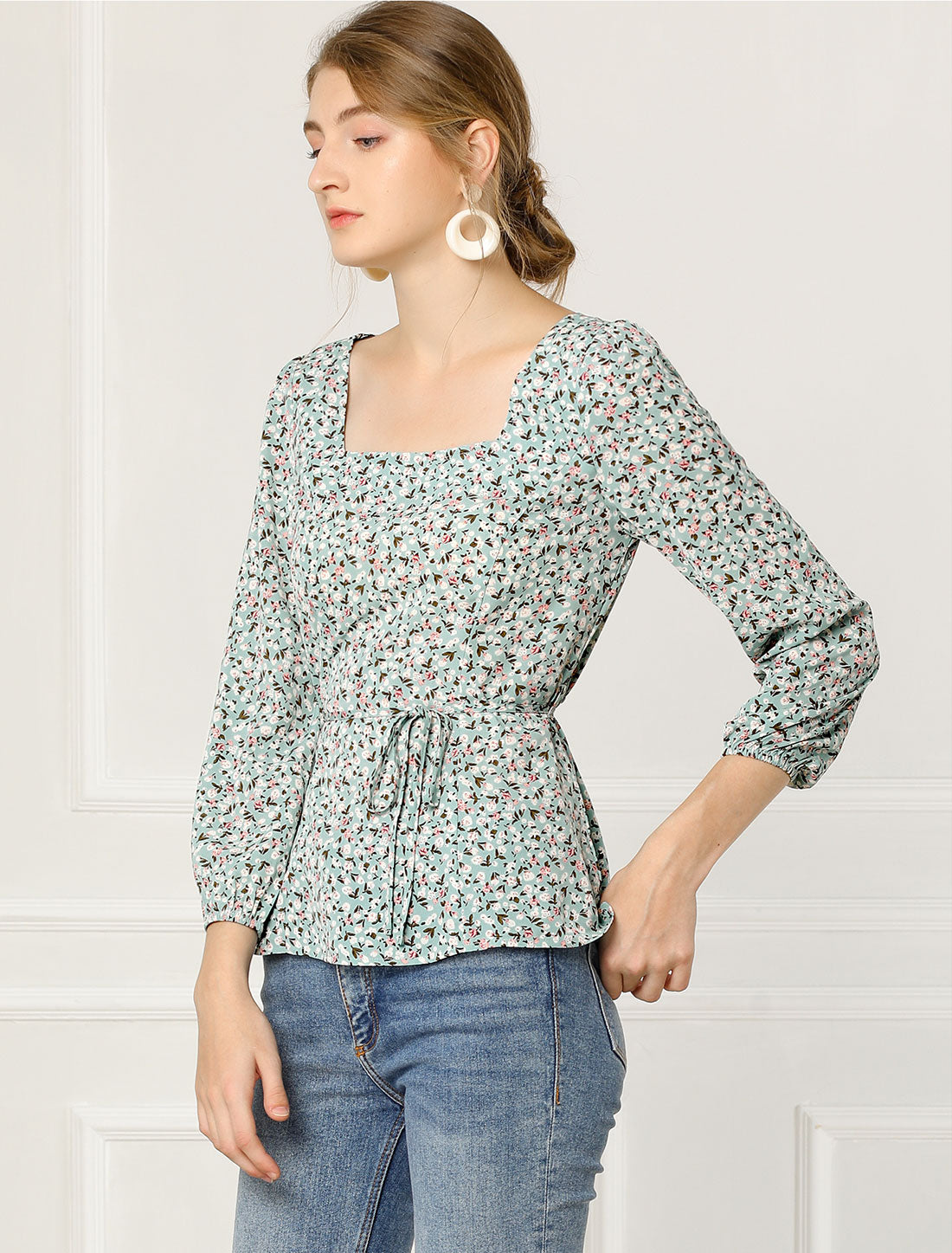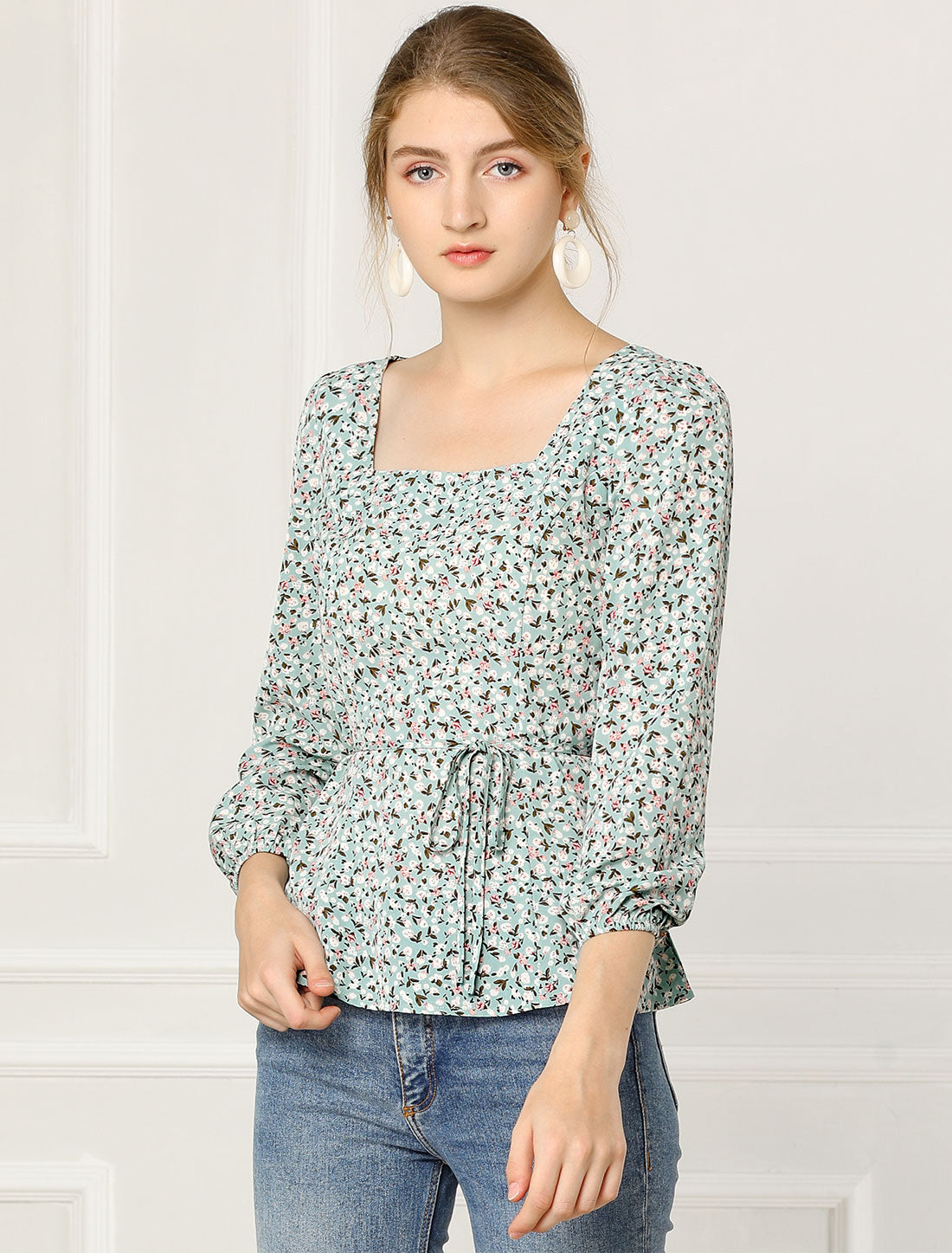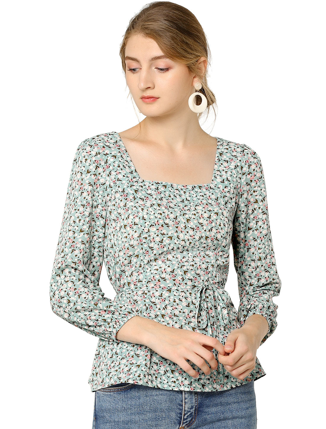 Women's Floral Blouse Square Neck Belted Waist Peplum Top