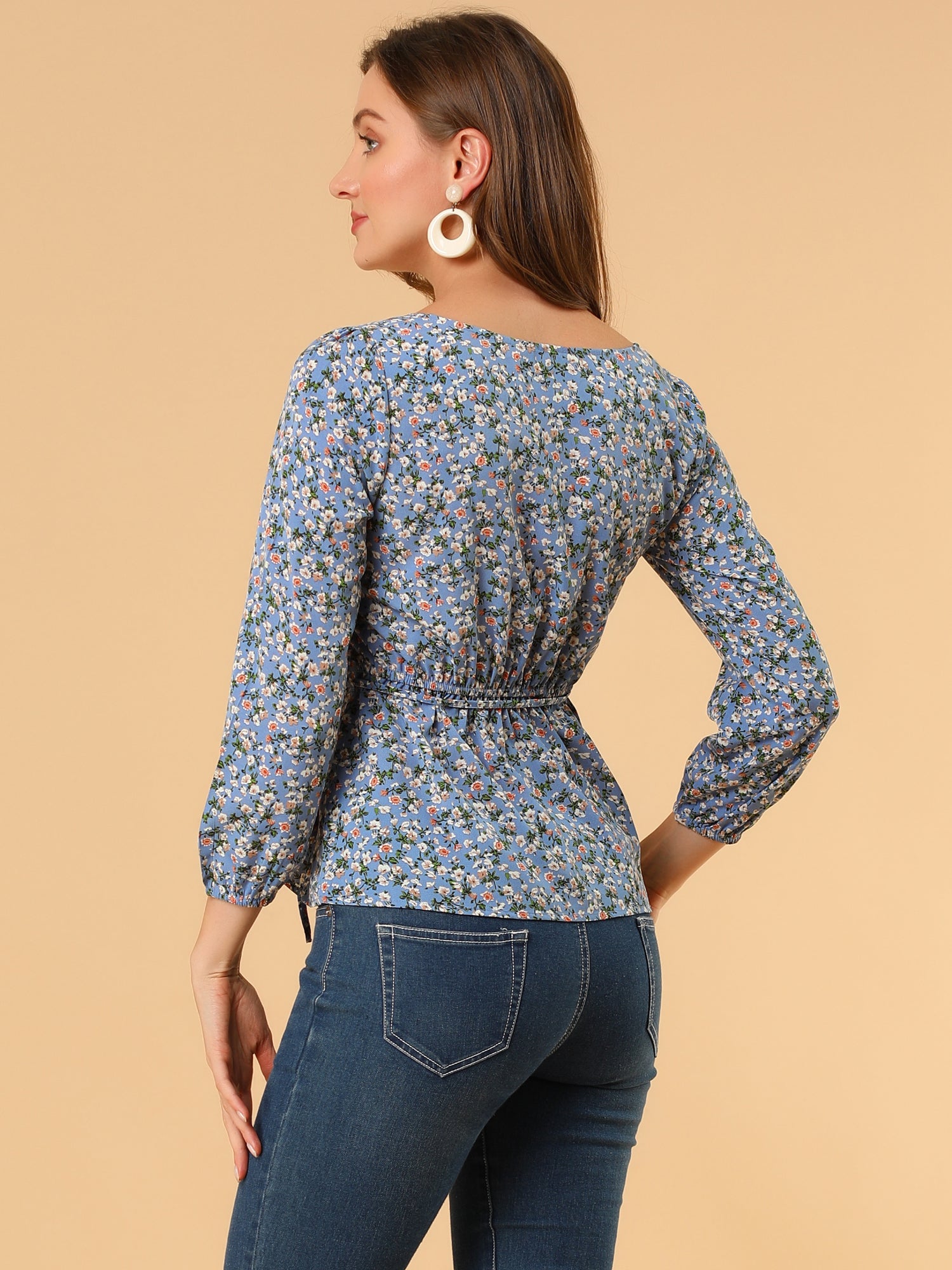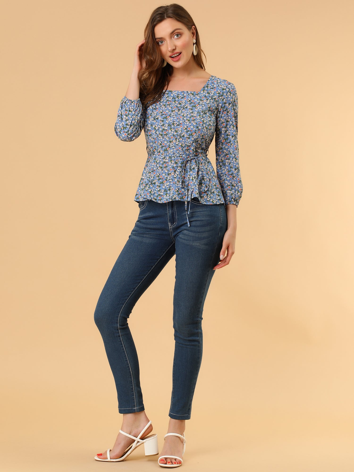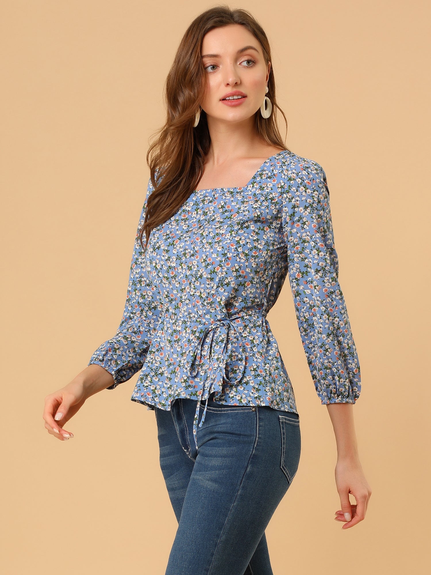 Women's Floral Blouse Square Neck Belted Waist Peplum Top