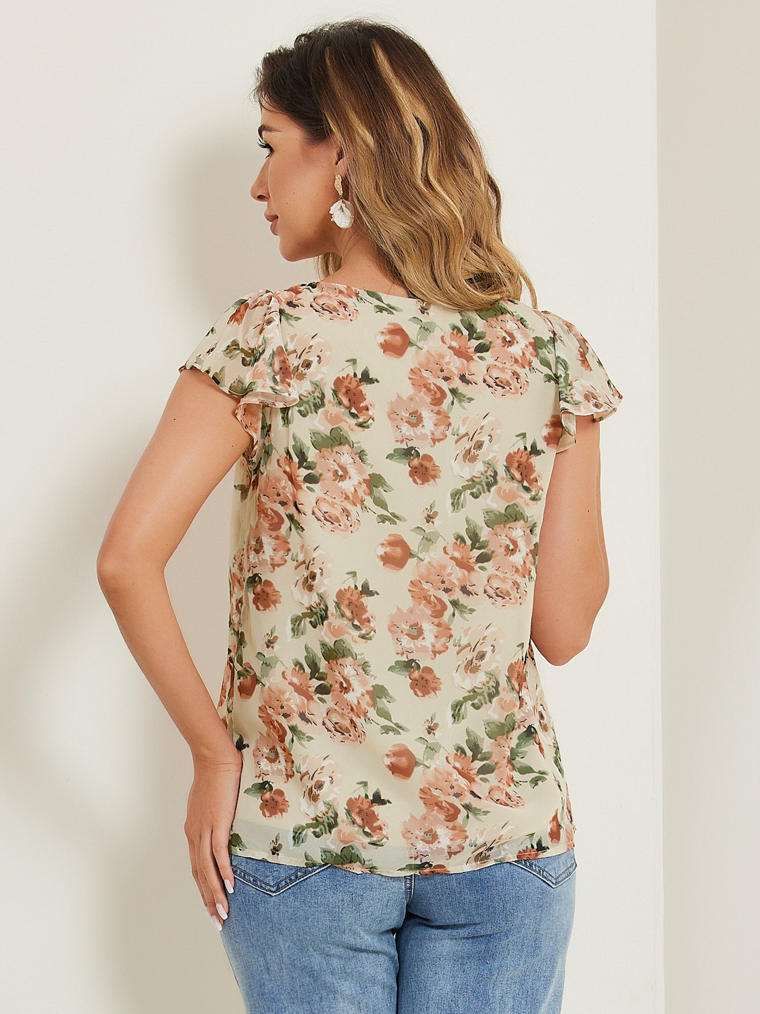 Women's Floral Blouse Summer Casual Square Neck Chiffon Short Sleeve Ruffle Top