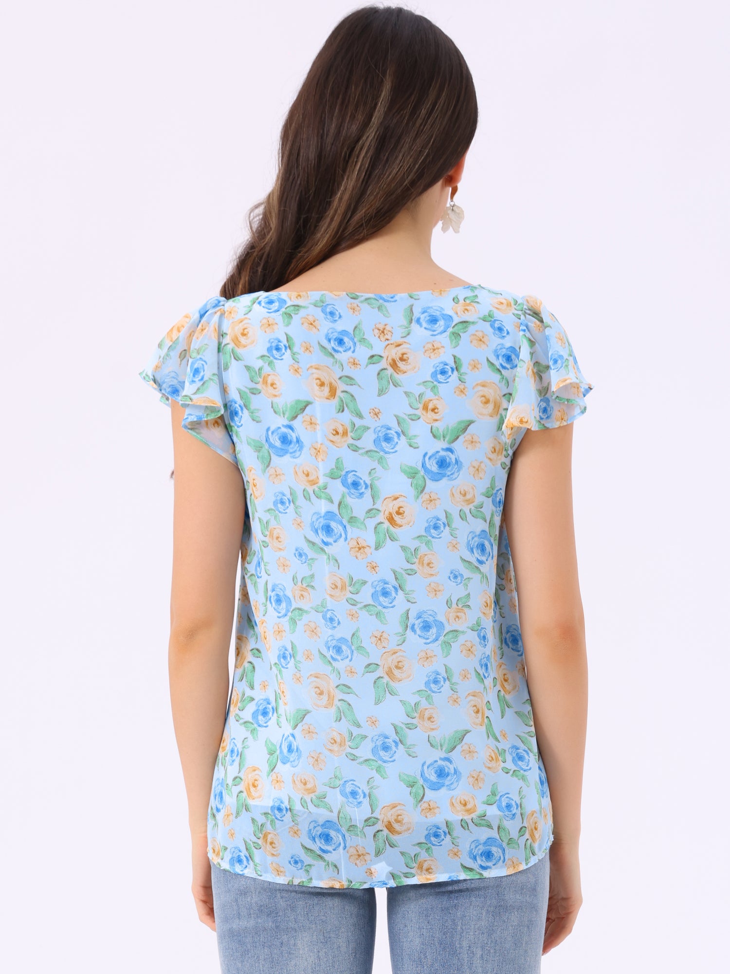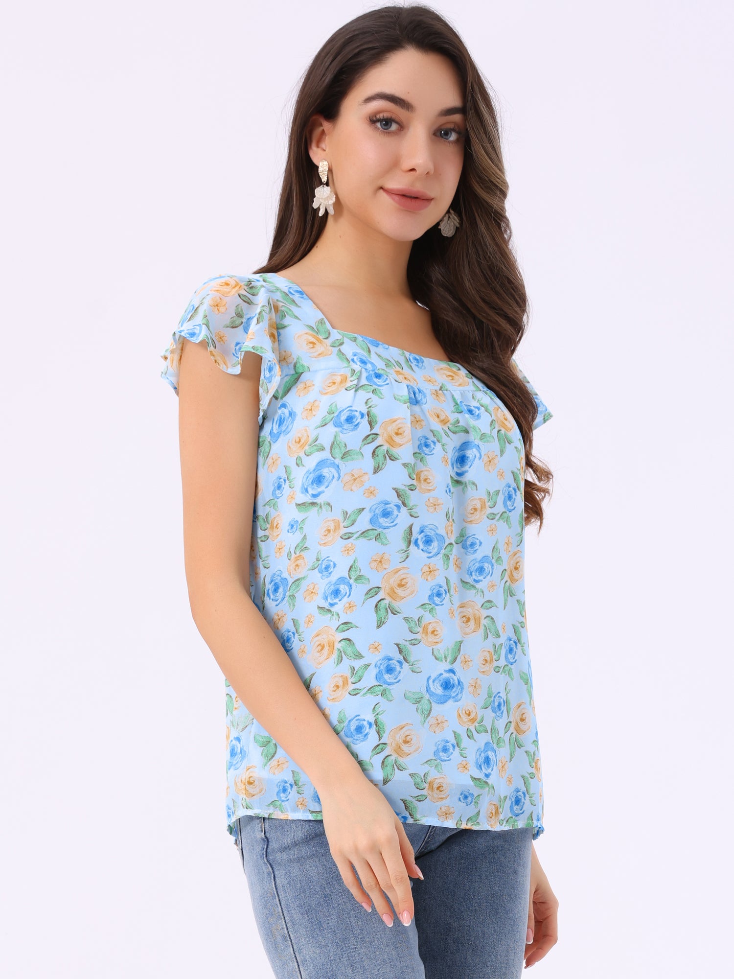 Women's Floral Blouse Summer Casual Square Neck Chiffon Short Sleeve Ruffle Top
