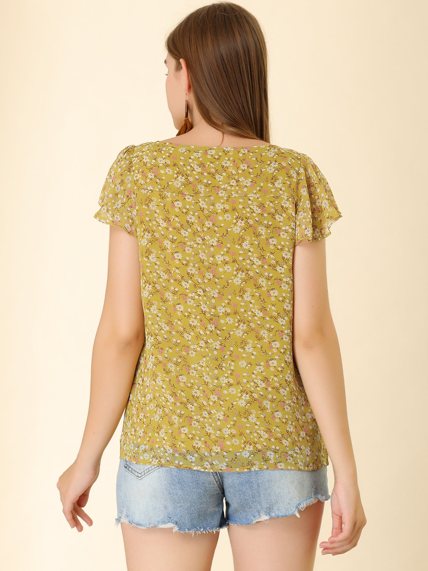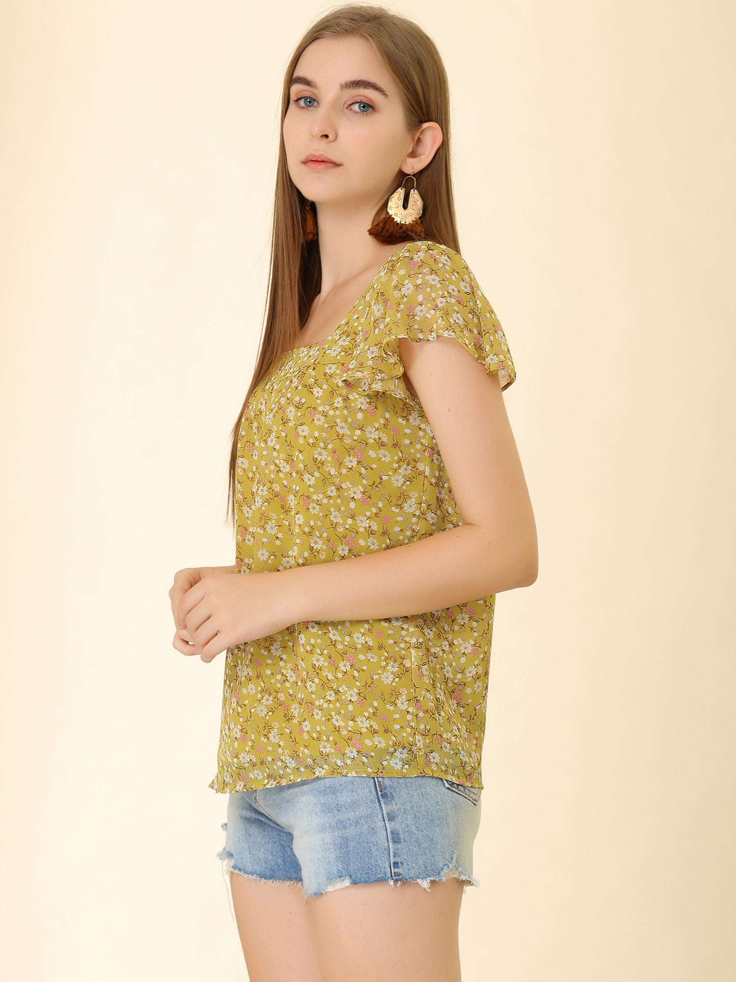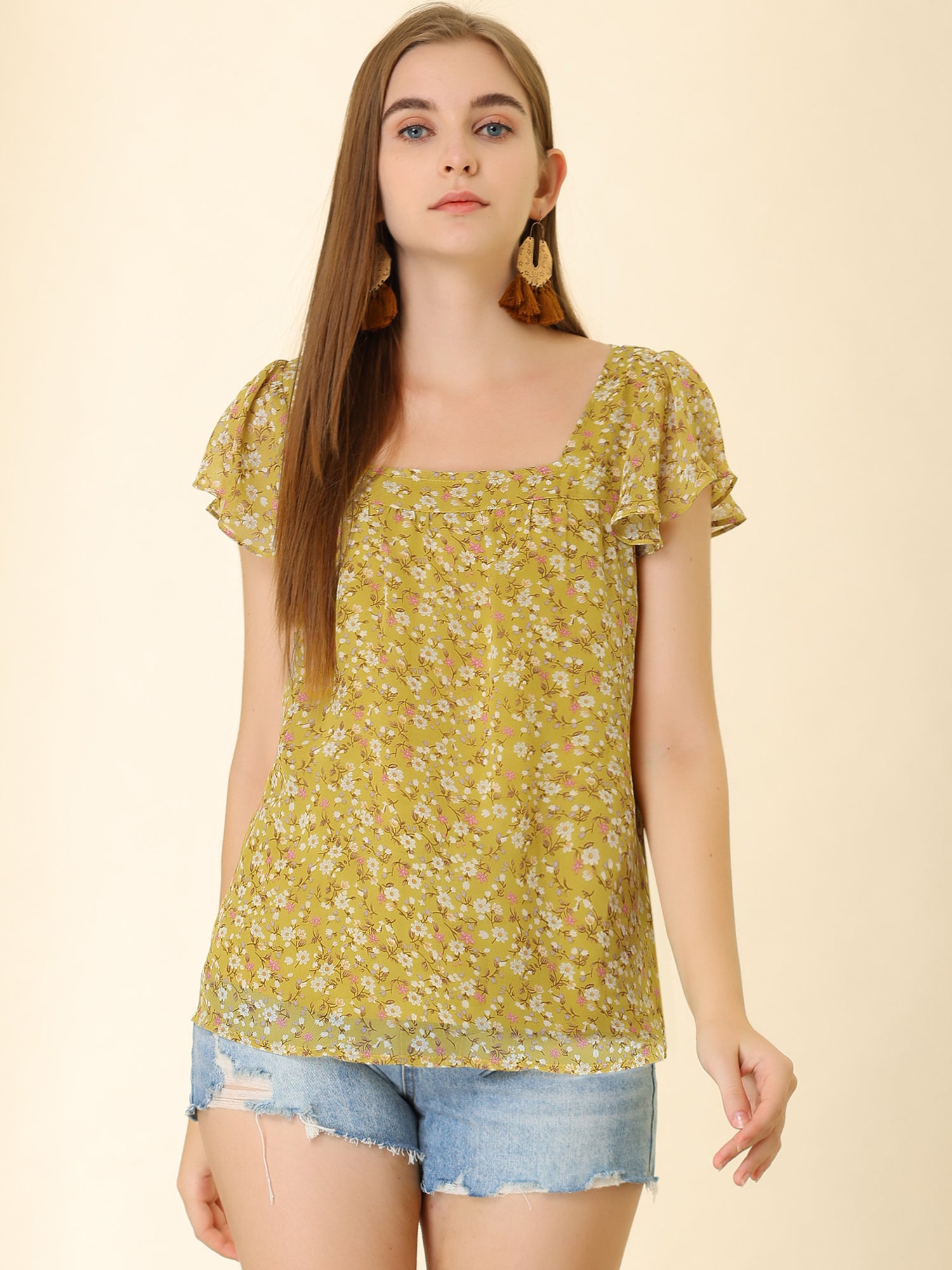 Women's Floral Blouse Summer Casual Square Neck Chiffon Short Sleeve Ruffle Top
