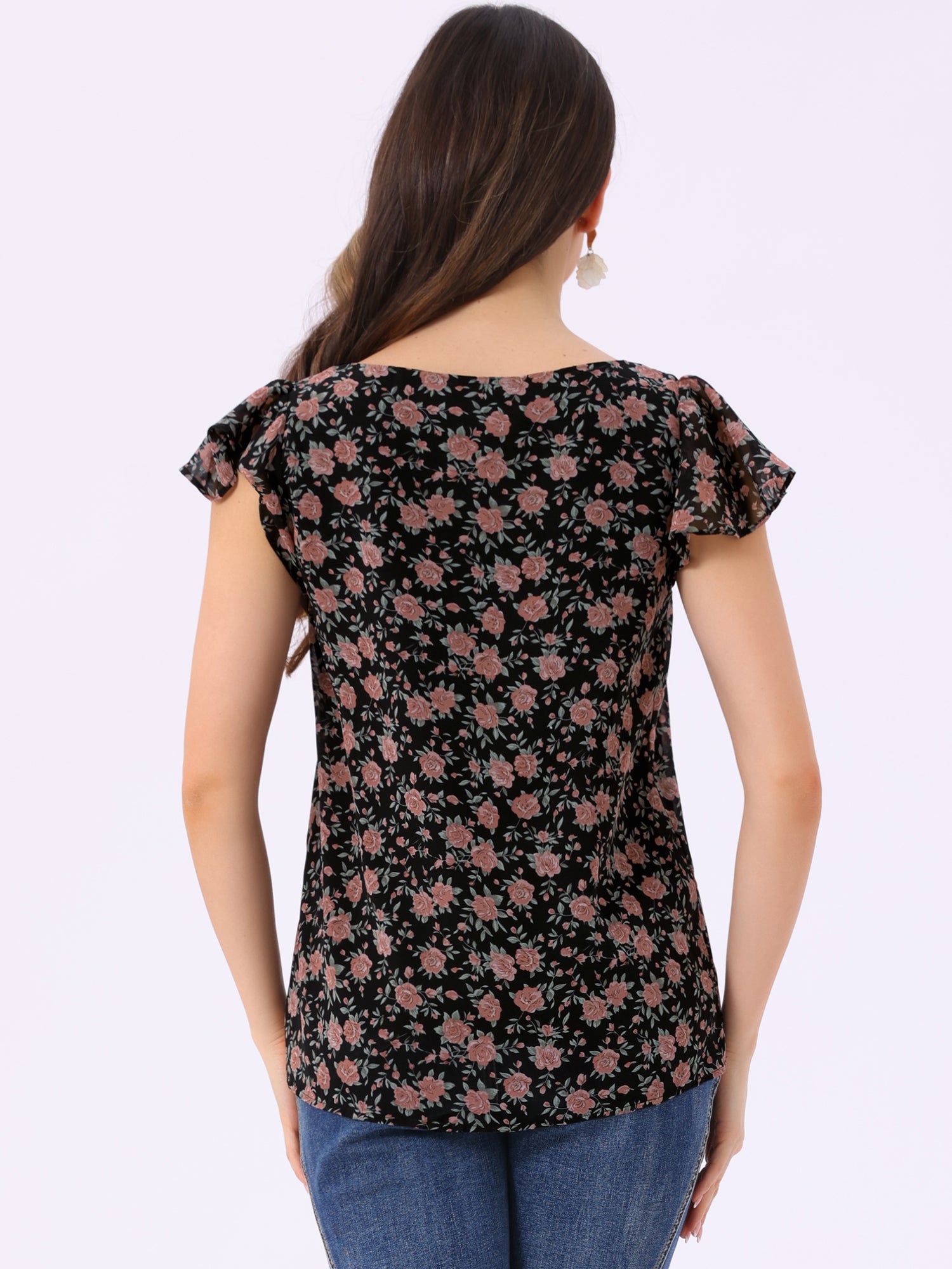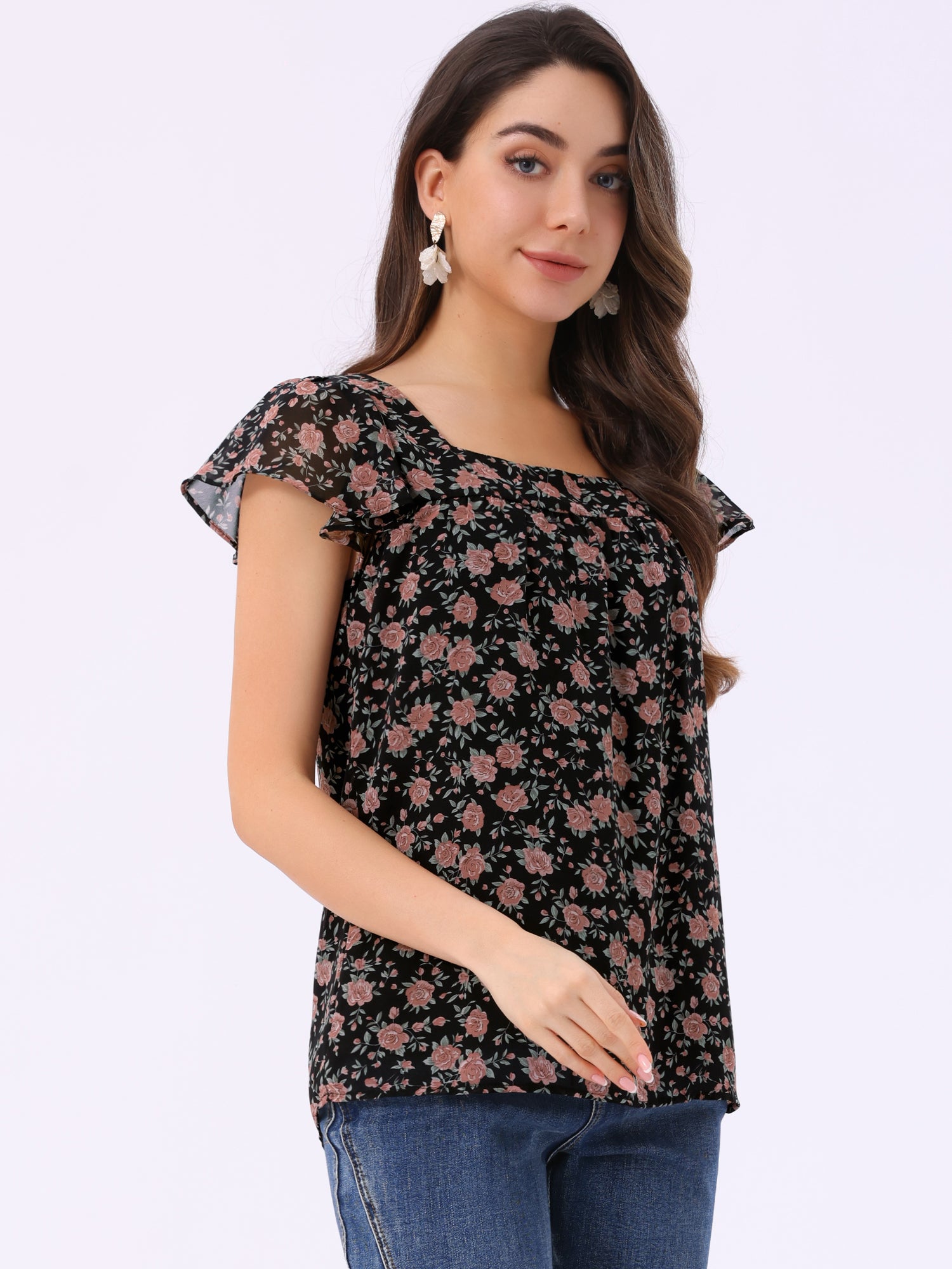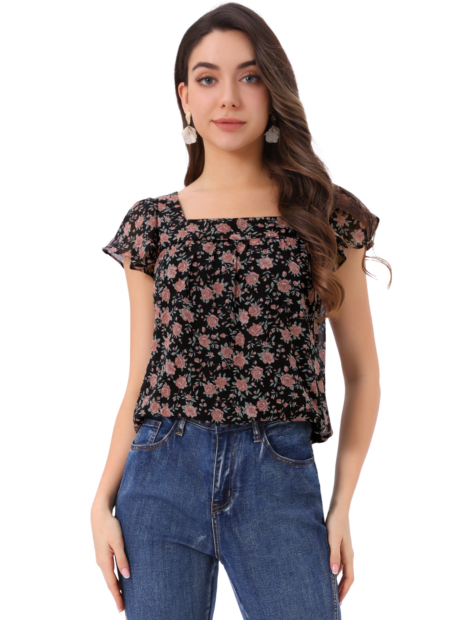 Women's Floral Blouse Summer Casual Square Neck Chiffon Short Sleeve Ruffle Top