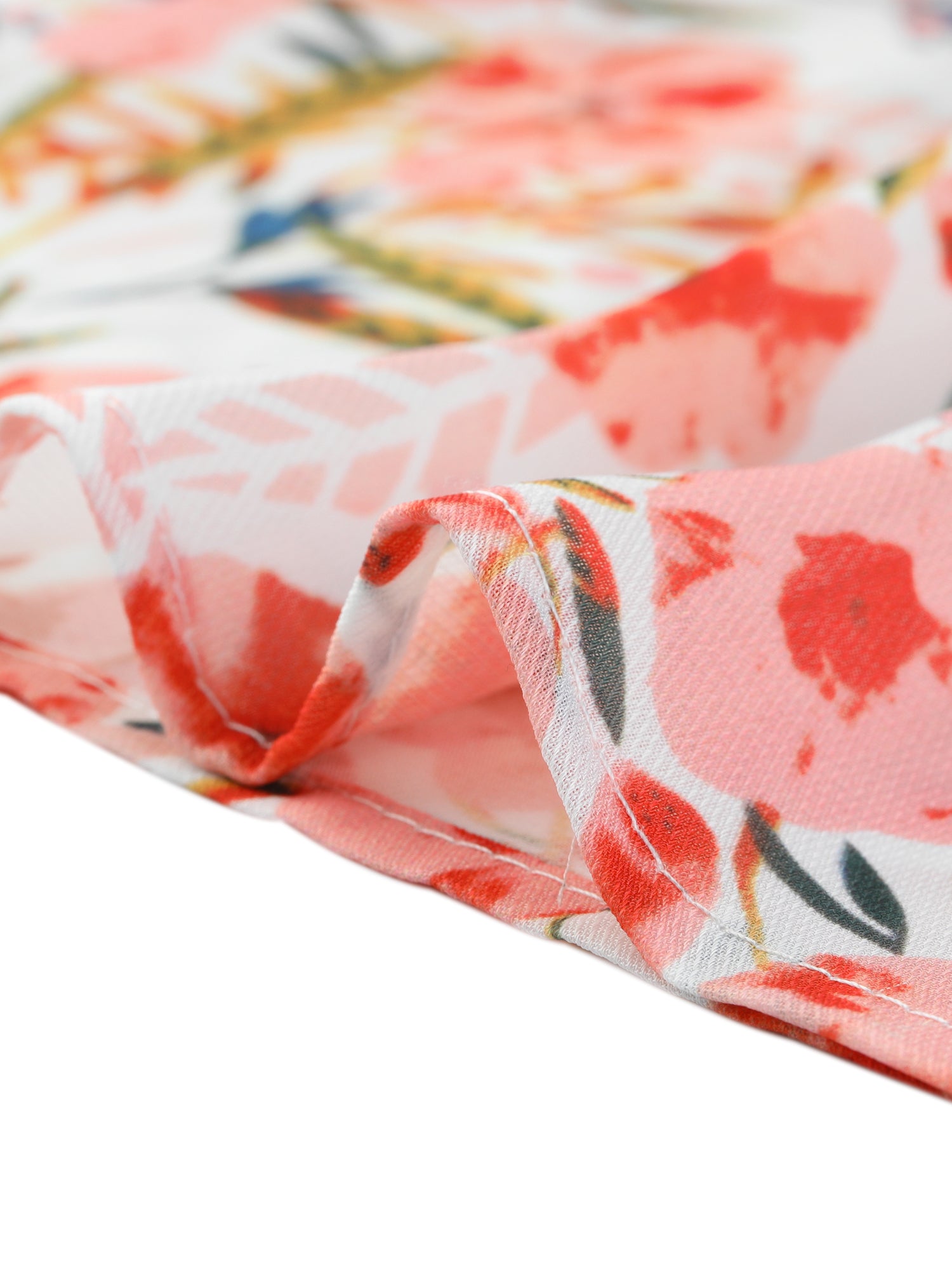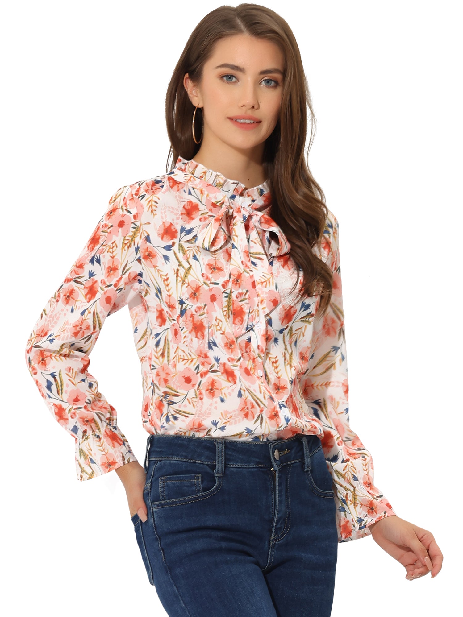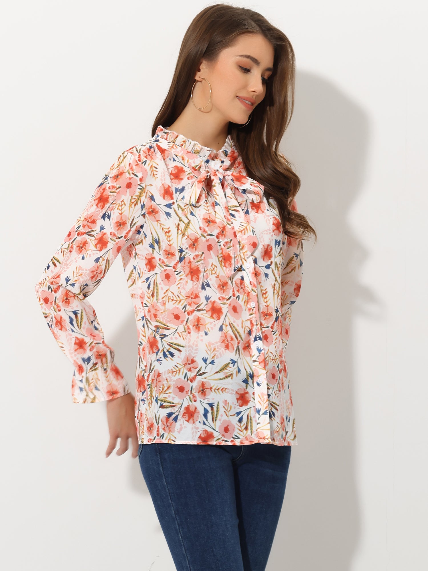Women's Floral Bow Tie Neck Button Up Ruffled Collar Casual Blouse