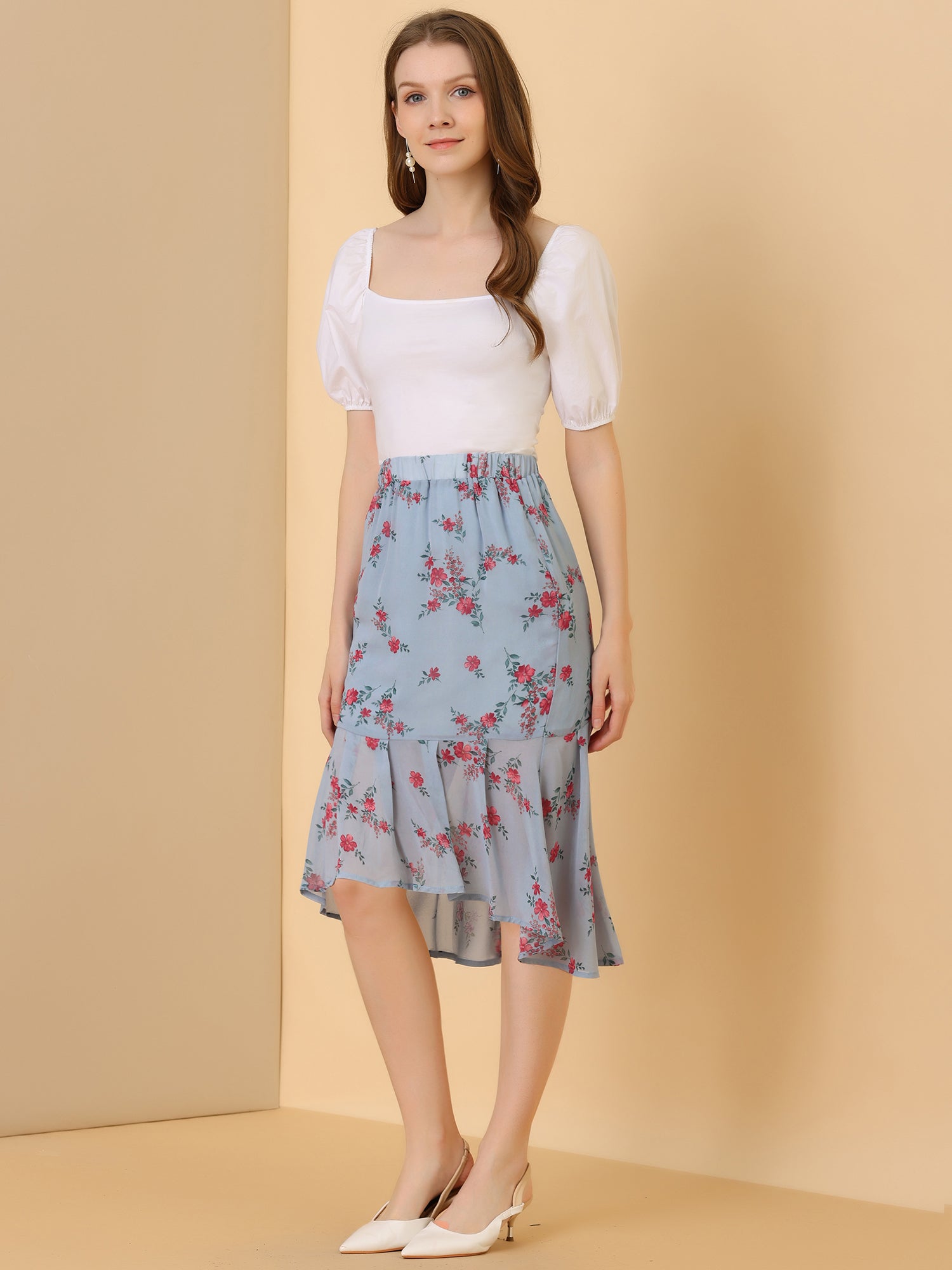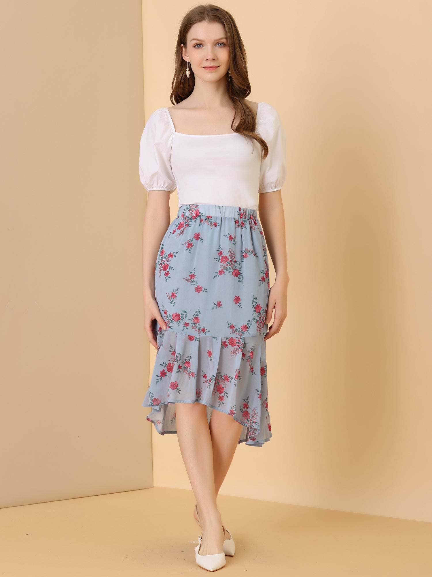 Women's Floral Elastic Waist Bodycon Ruffle Hem Chiffon Fishtail Skirt