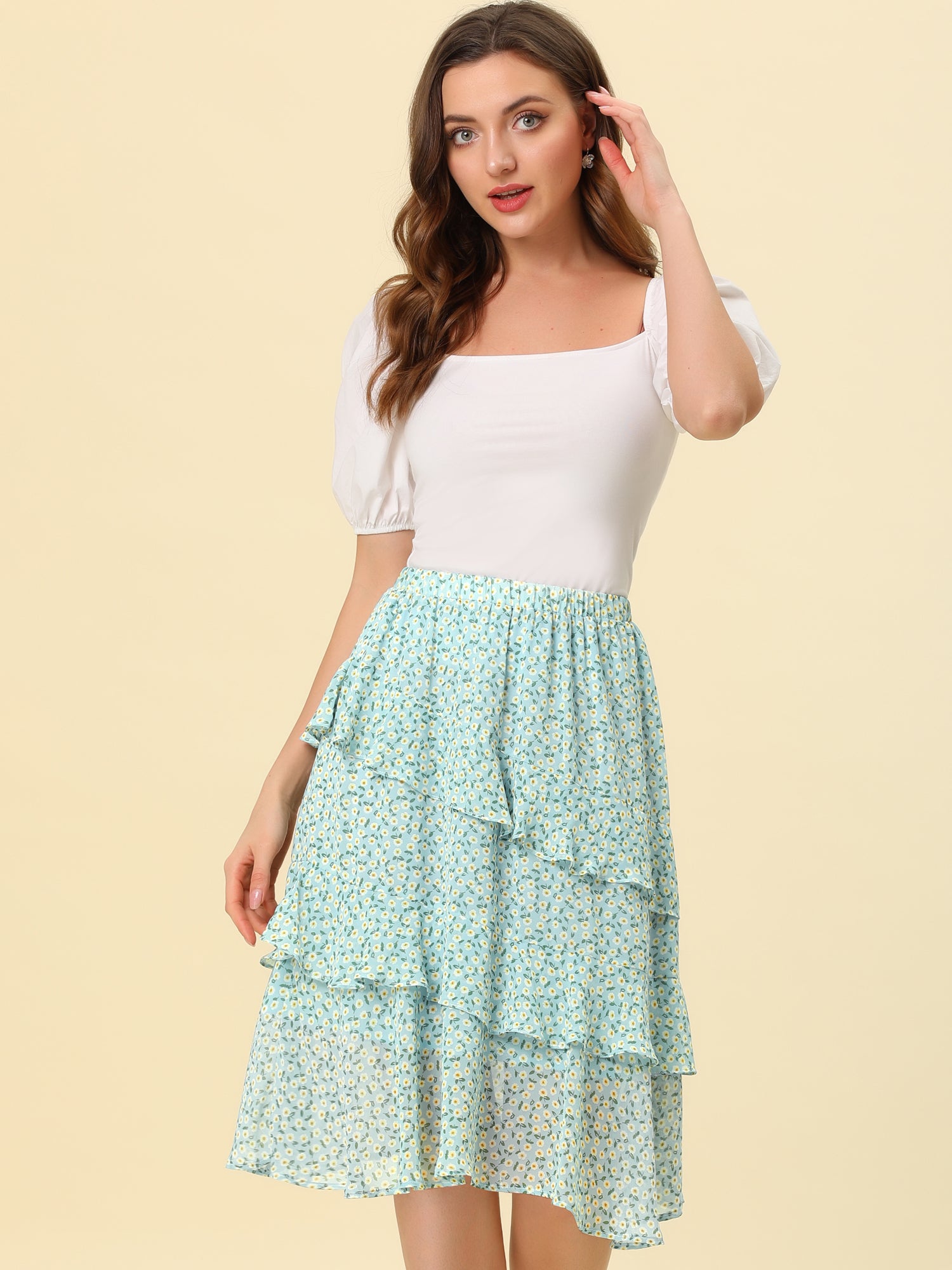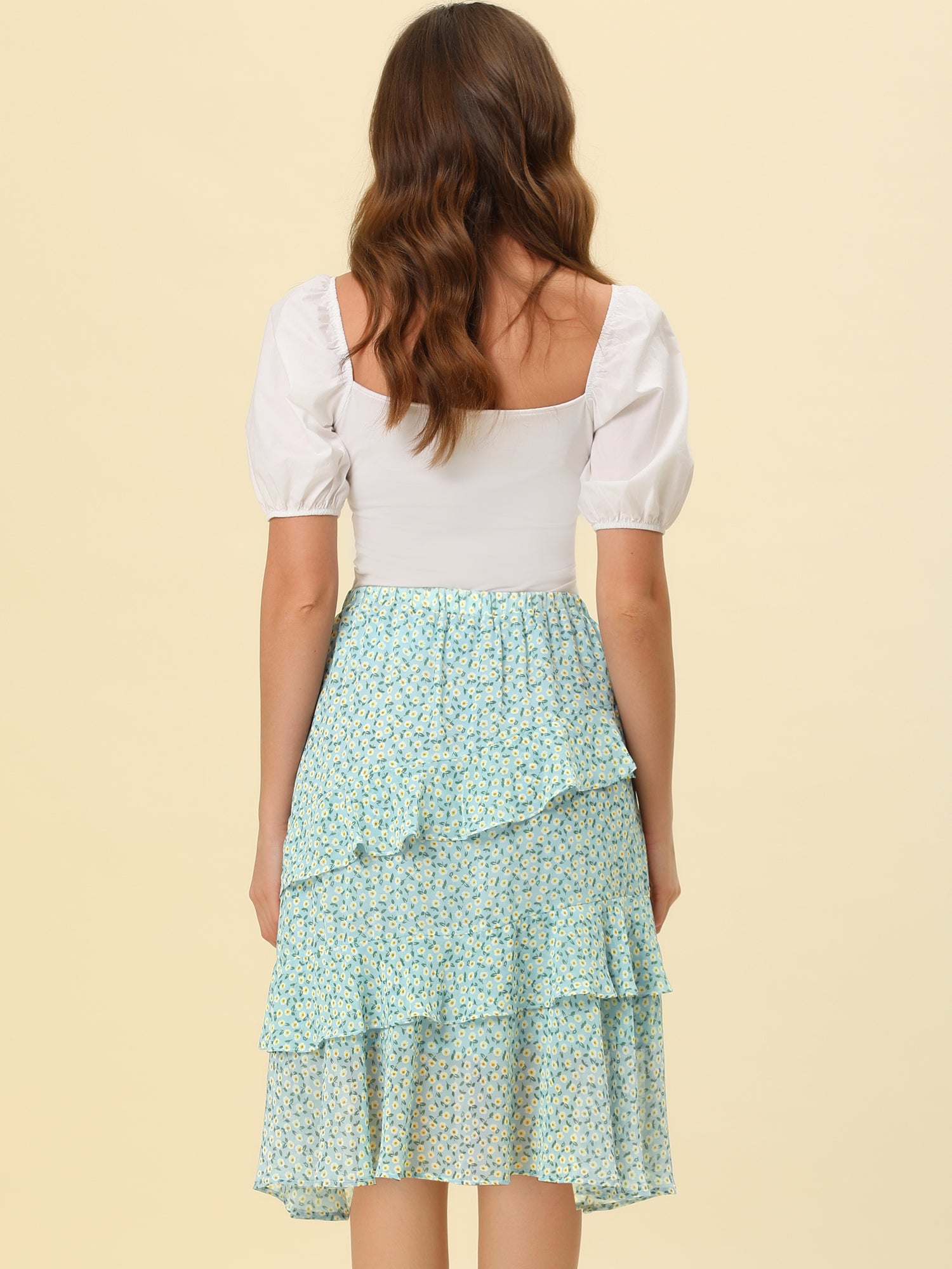 Women's Floral Layered Elastic Waist Chiffon Ruffle Midi Skirt
