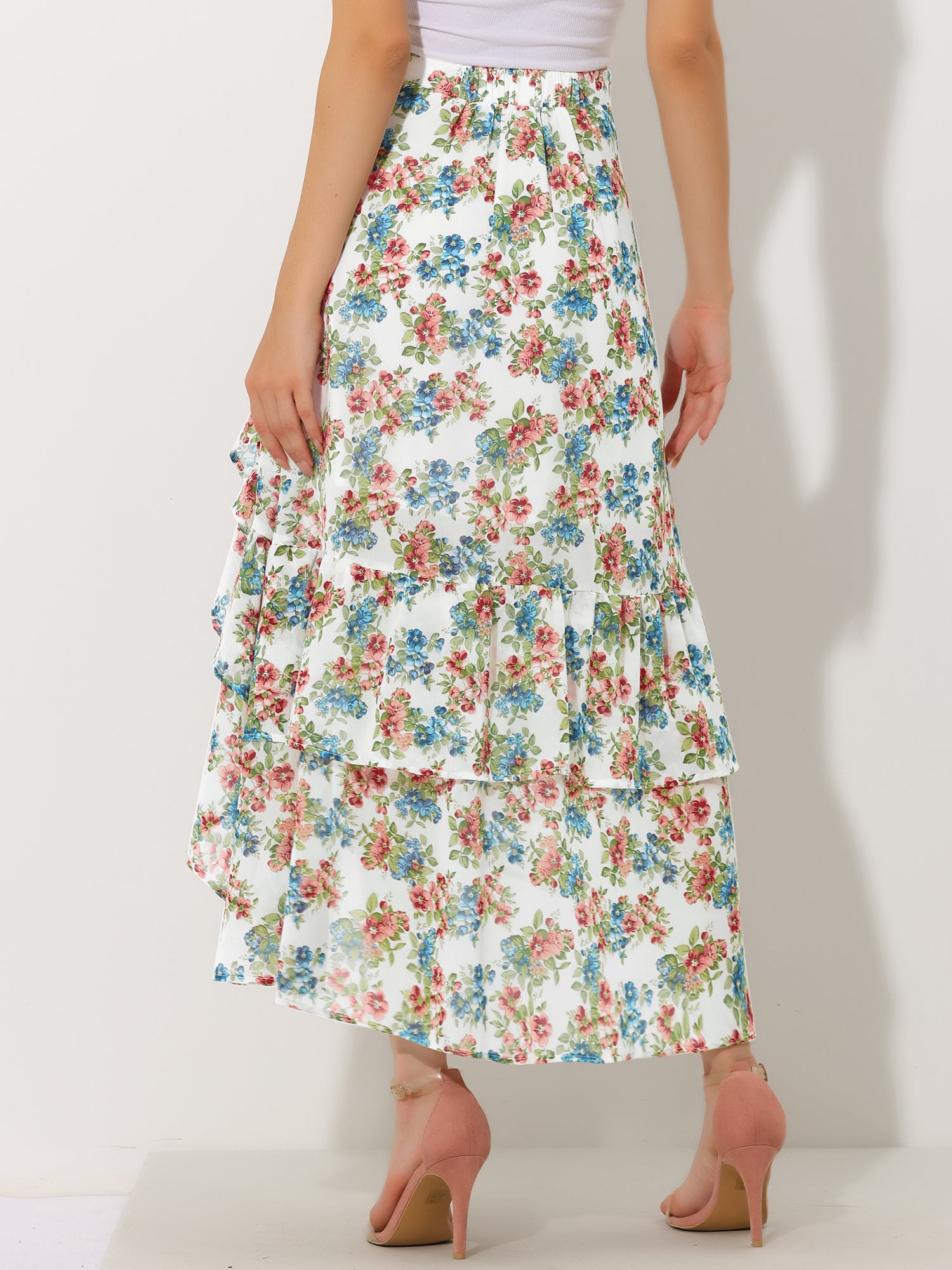 Women's Floral Ruffle Skirt Wrap Tiered Asymmetrical Chiffon Skirt