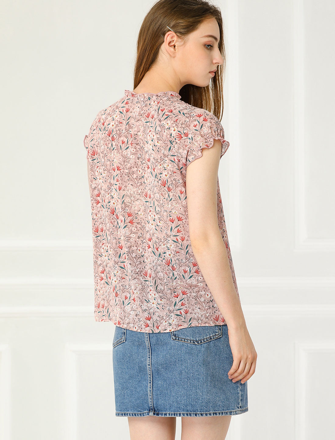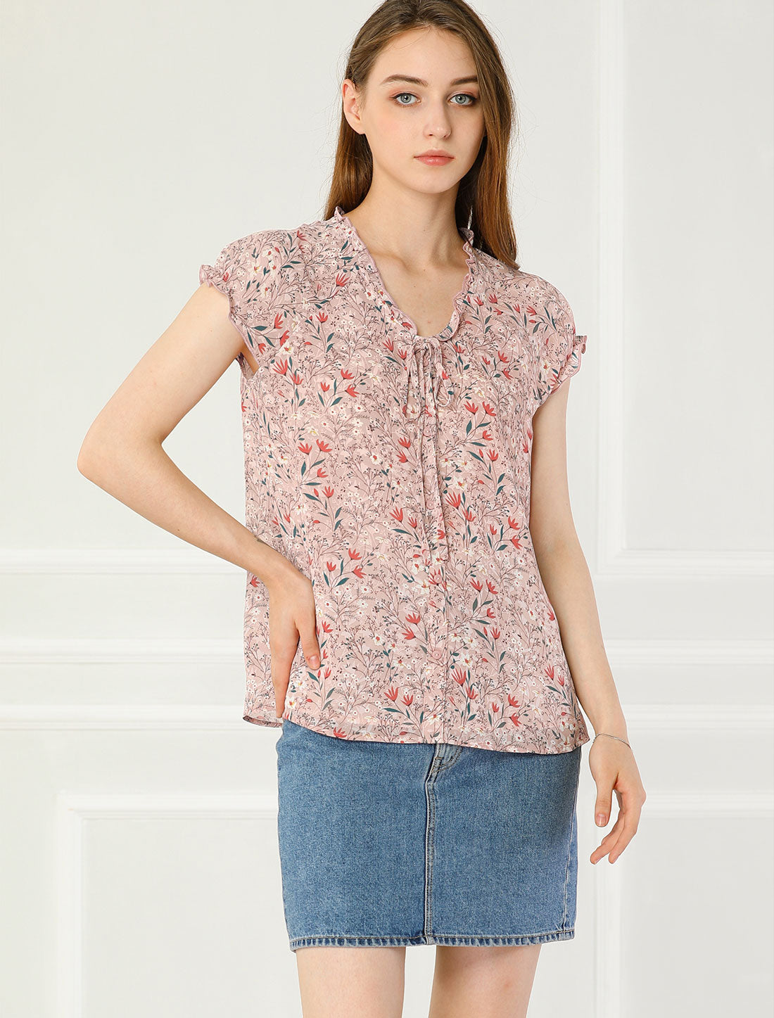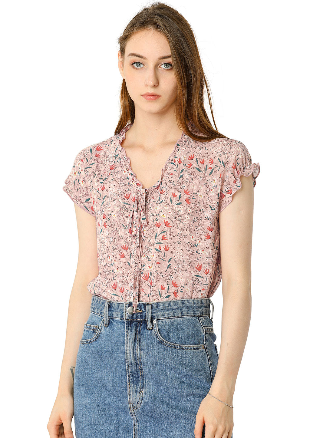 Women's Floral Summer V Neck Short Cap Sleeve Ruffle Chiffon Blouse