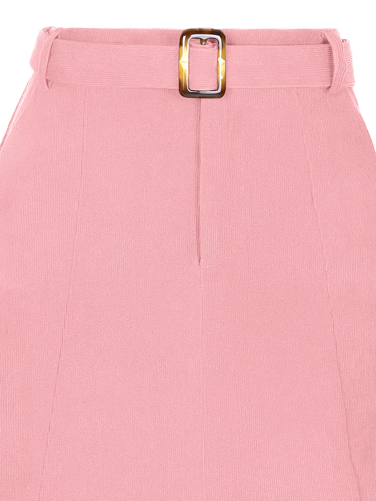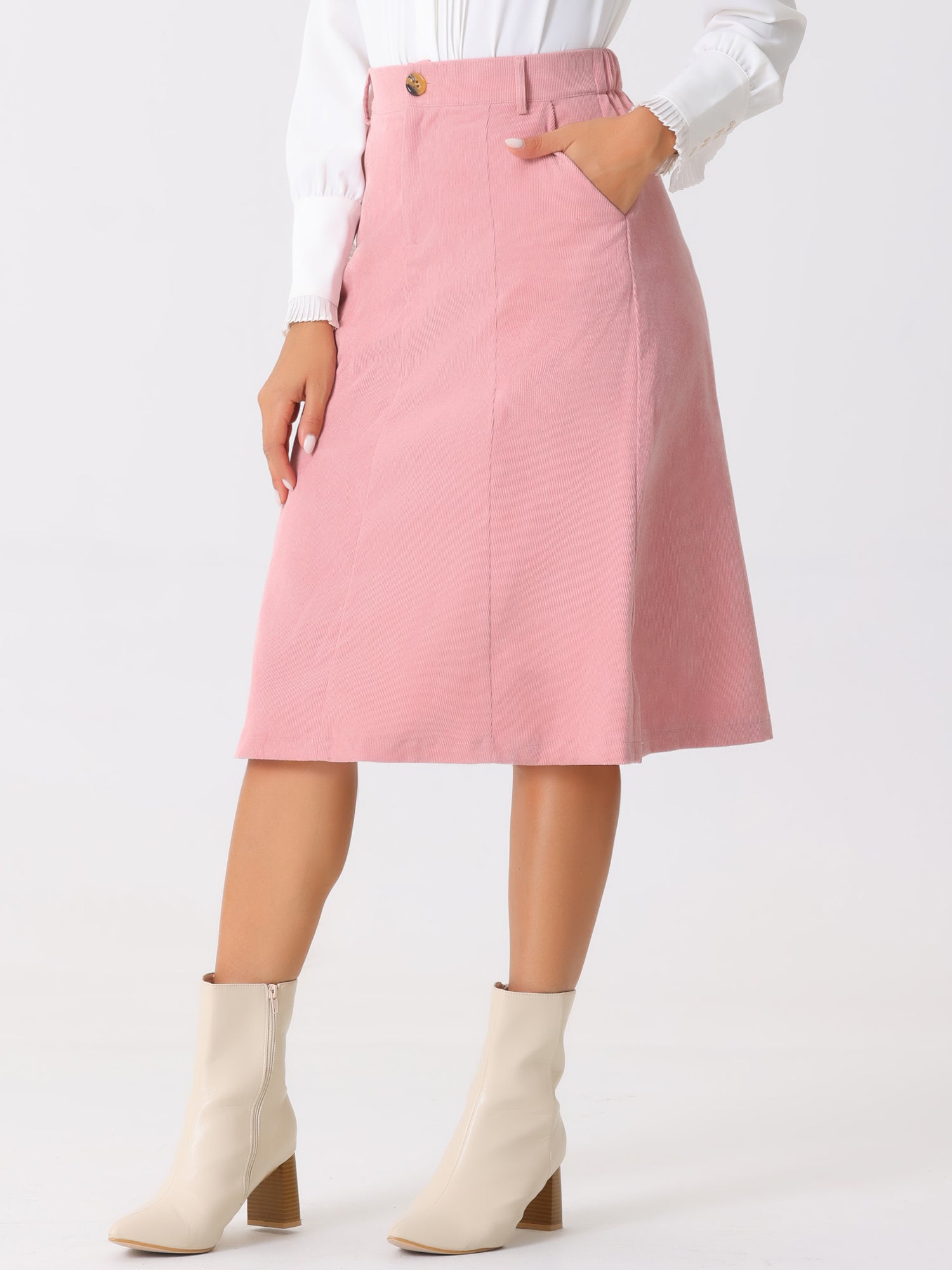 Women's High Waist Elastic Back A-Line Belted Winter Fall Midi Corduroy Skirt