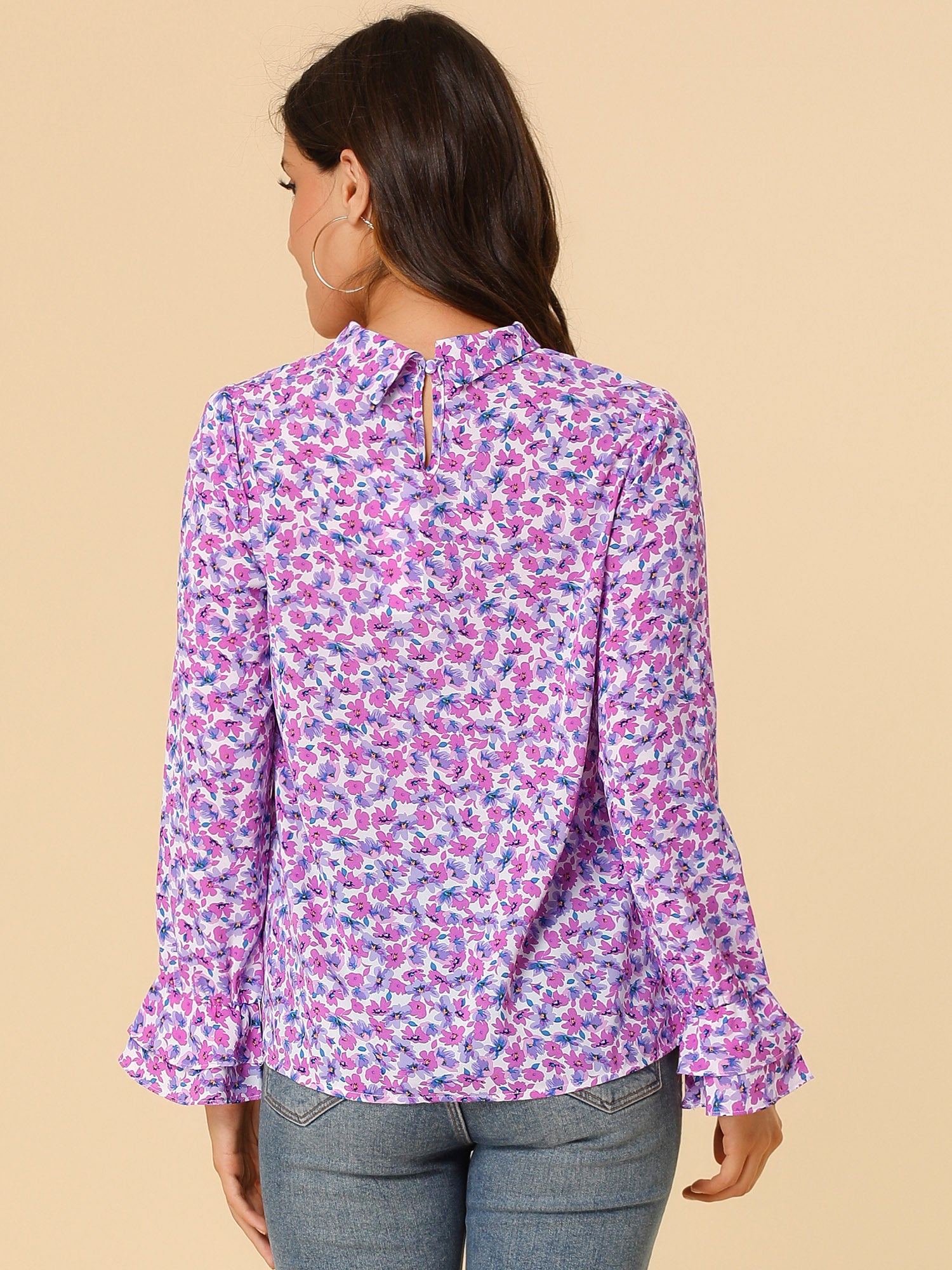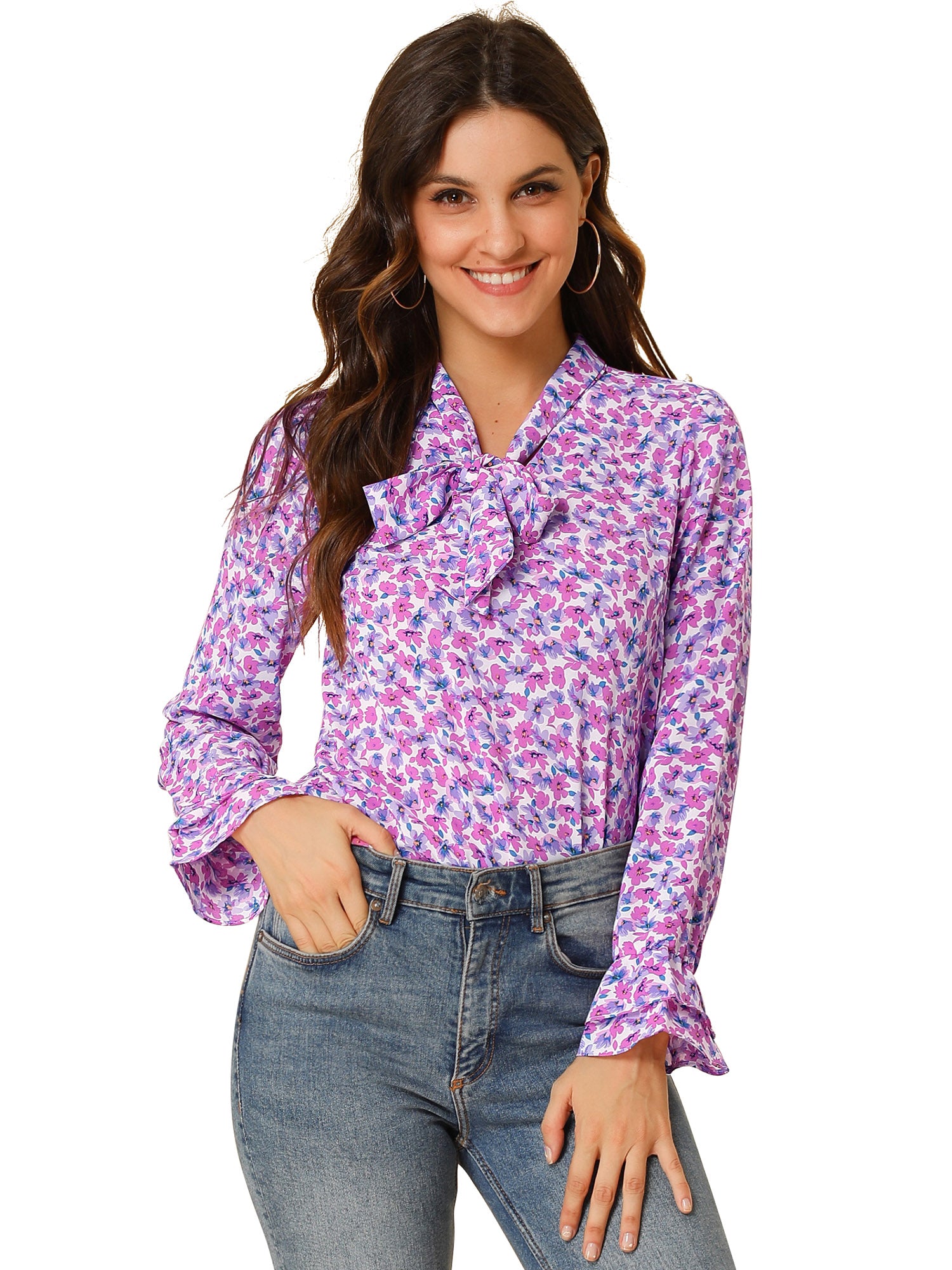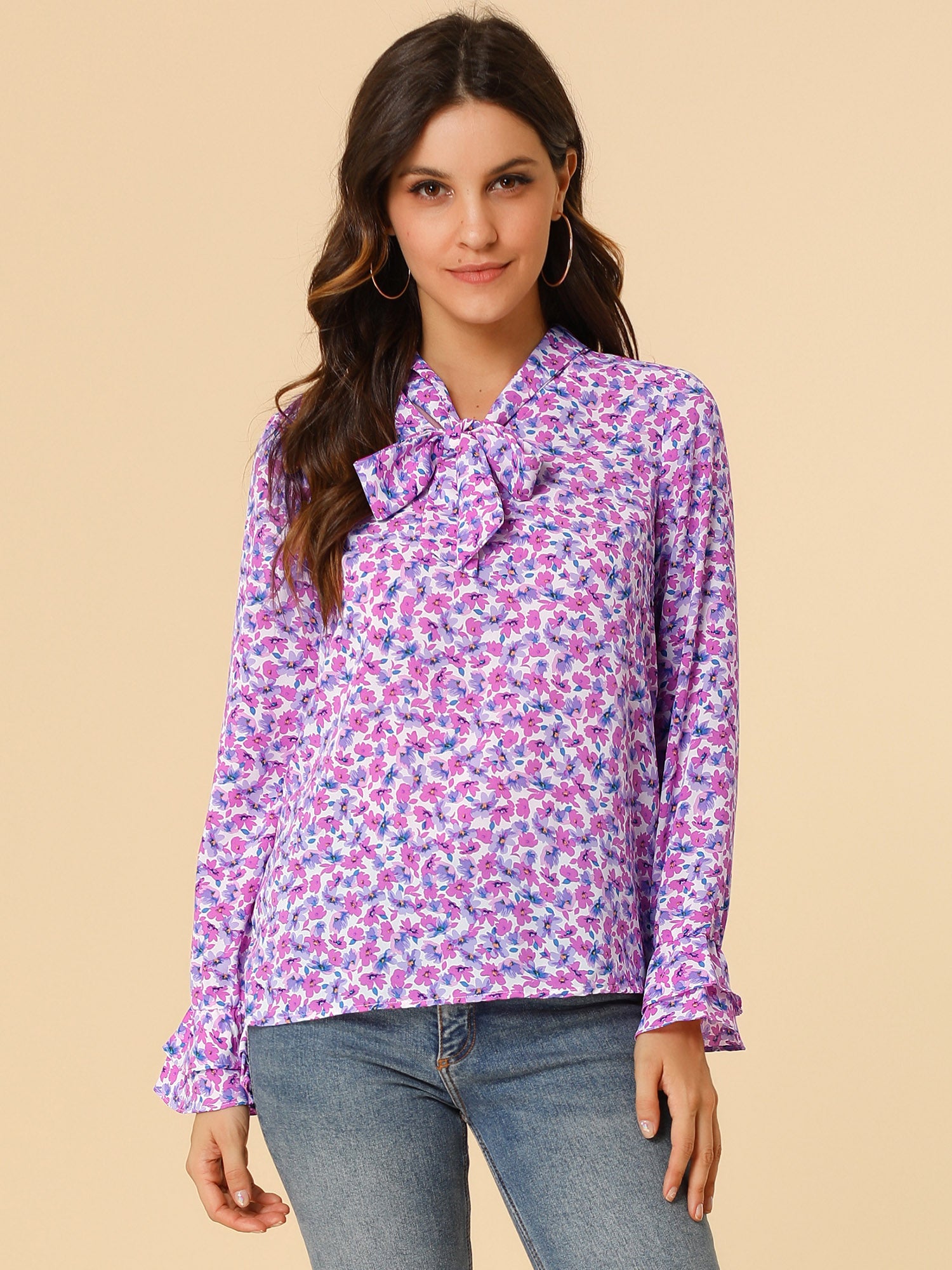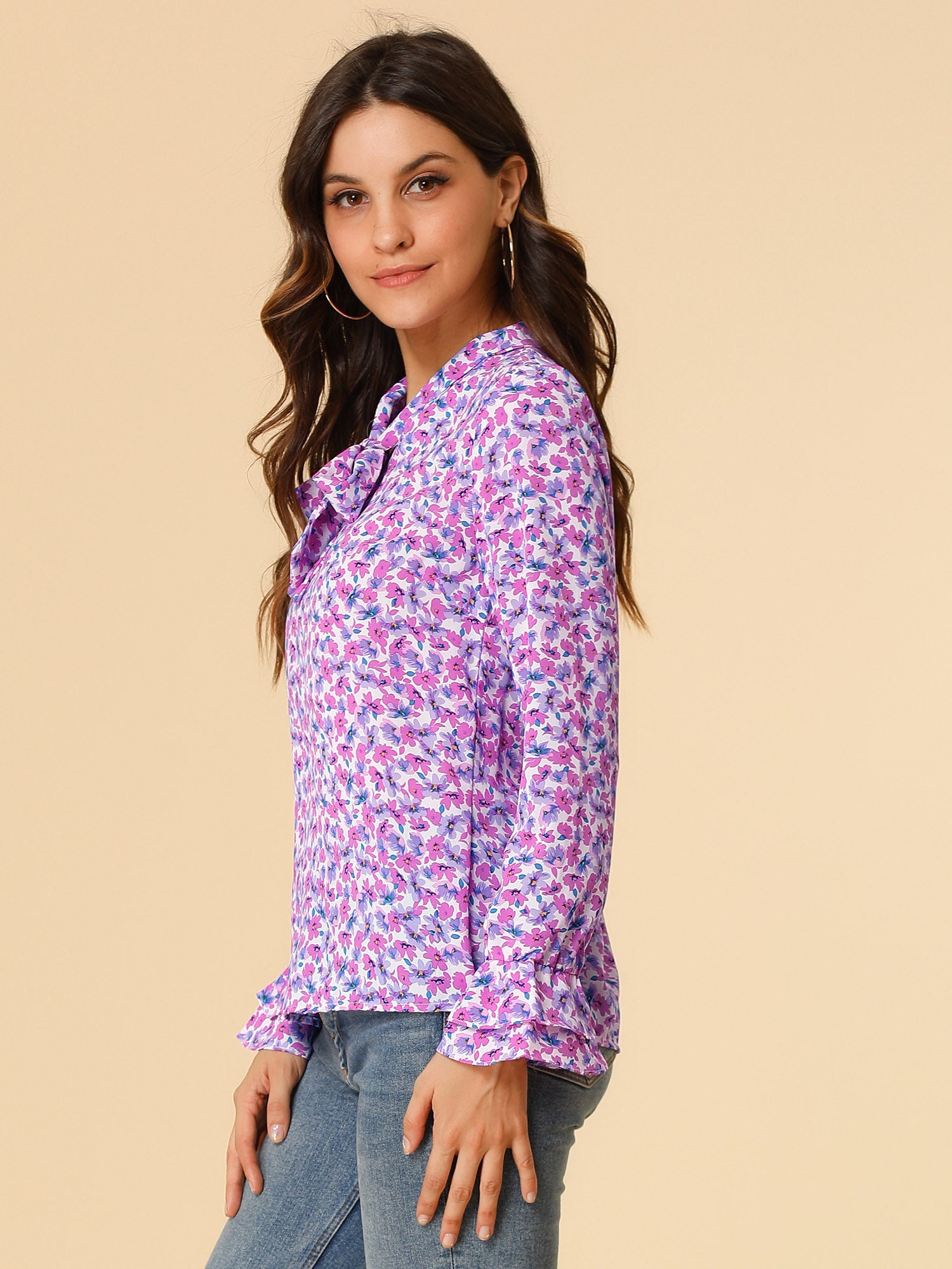 Women's Long Sleeve Blouse Floral Tie Neck Chiffon Ruffle Top