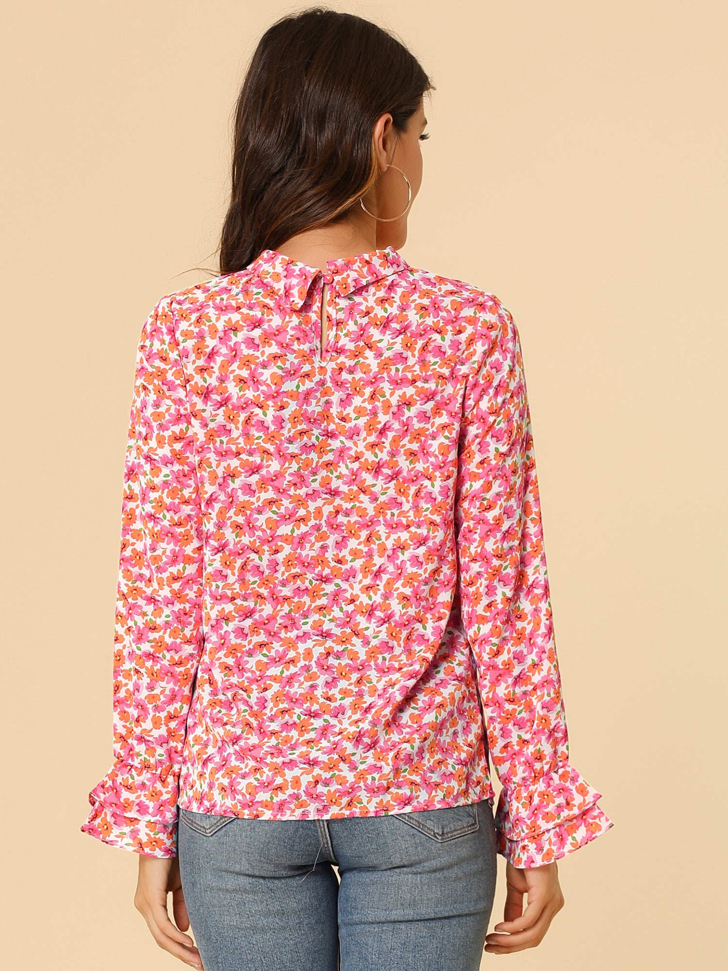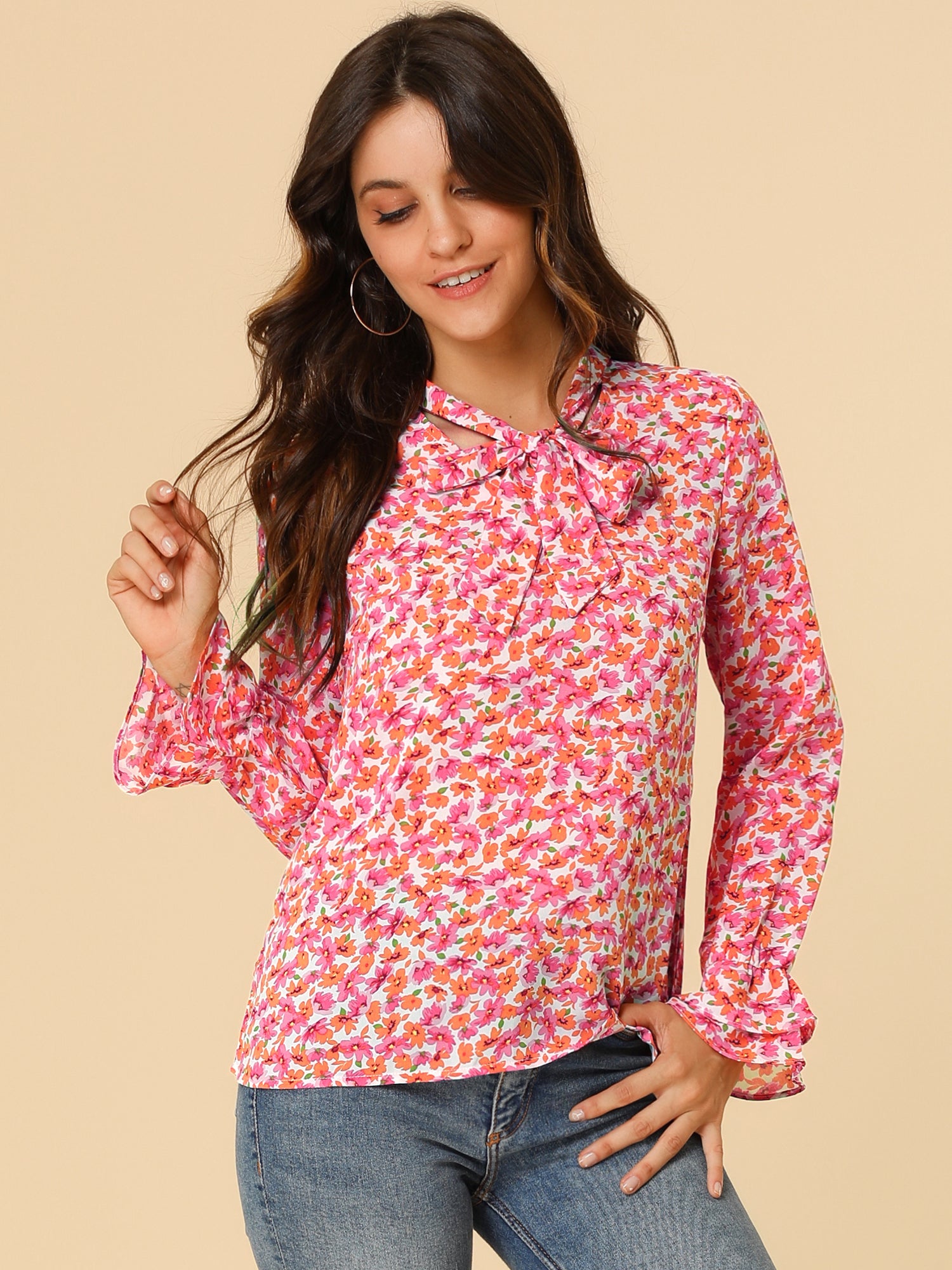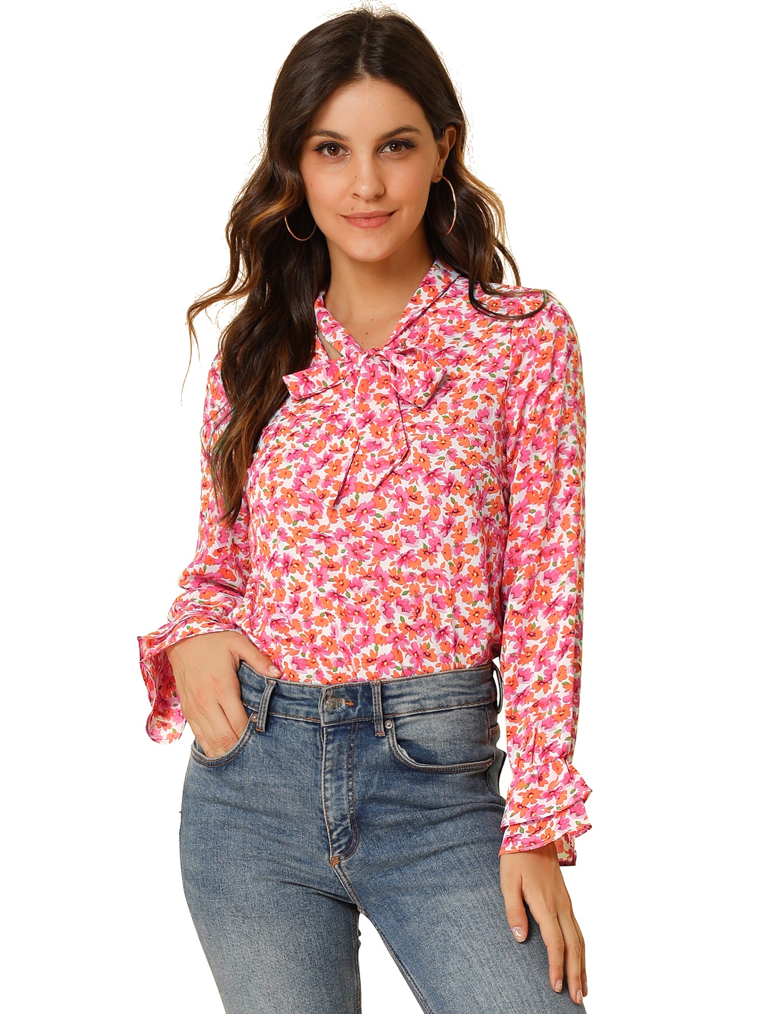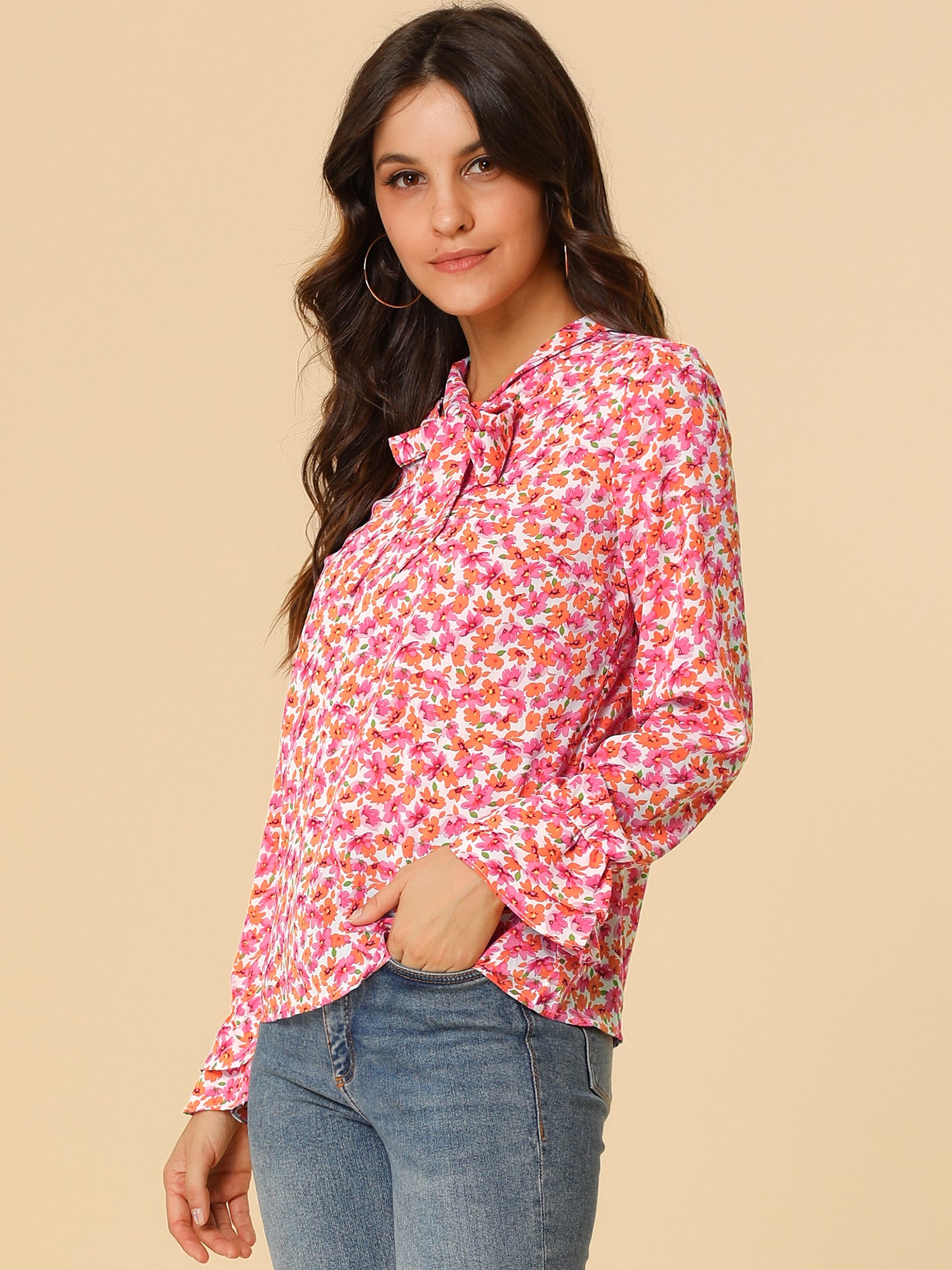 Women's Long Sleeve Blouse Floral Tie Neck Chiffon Ruffle Top