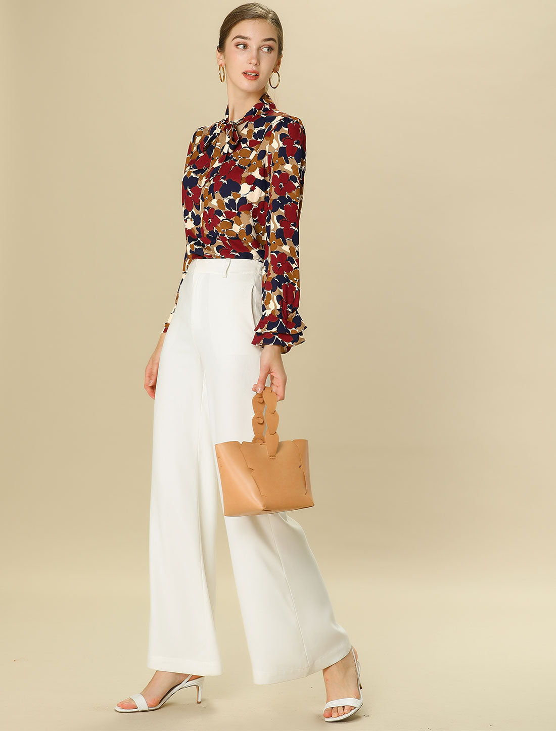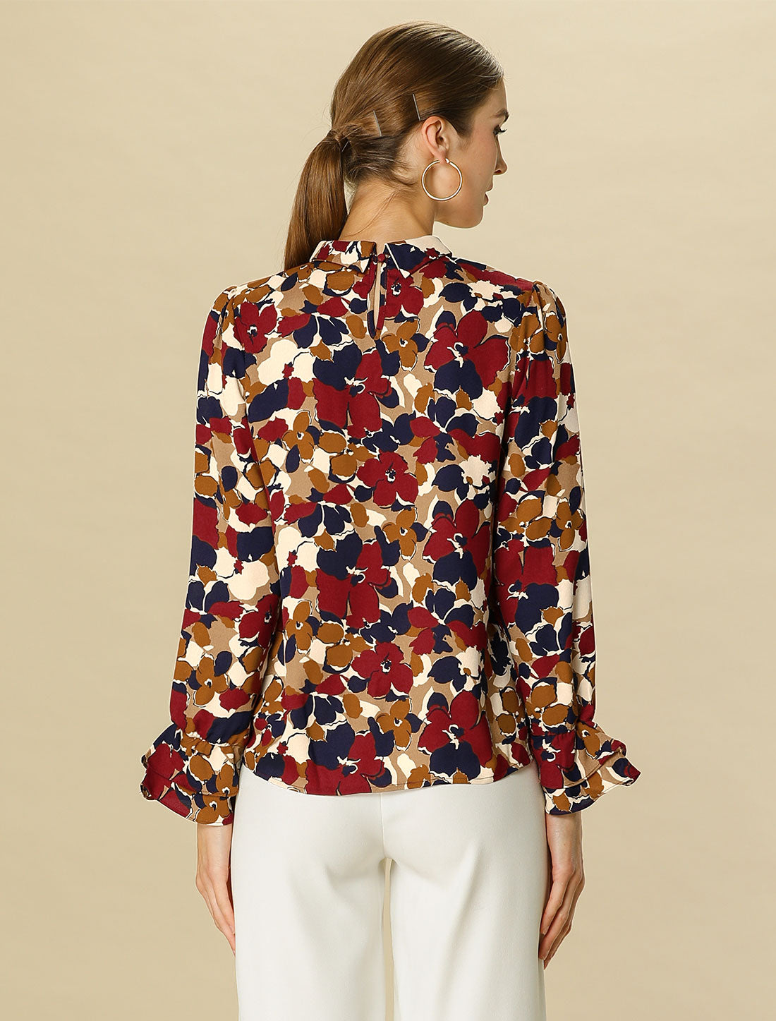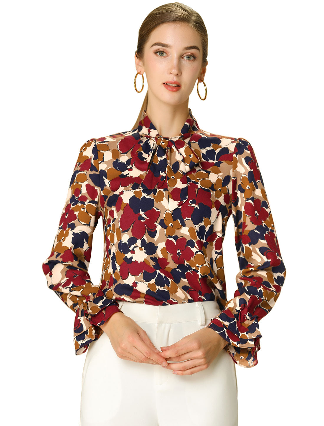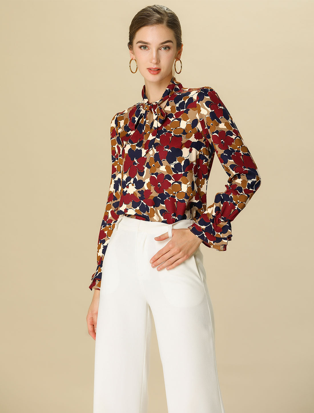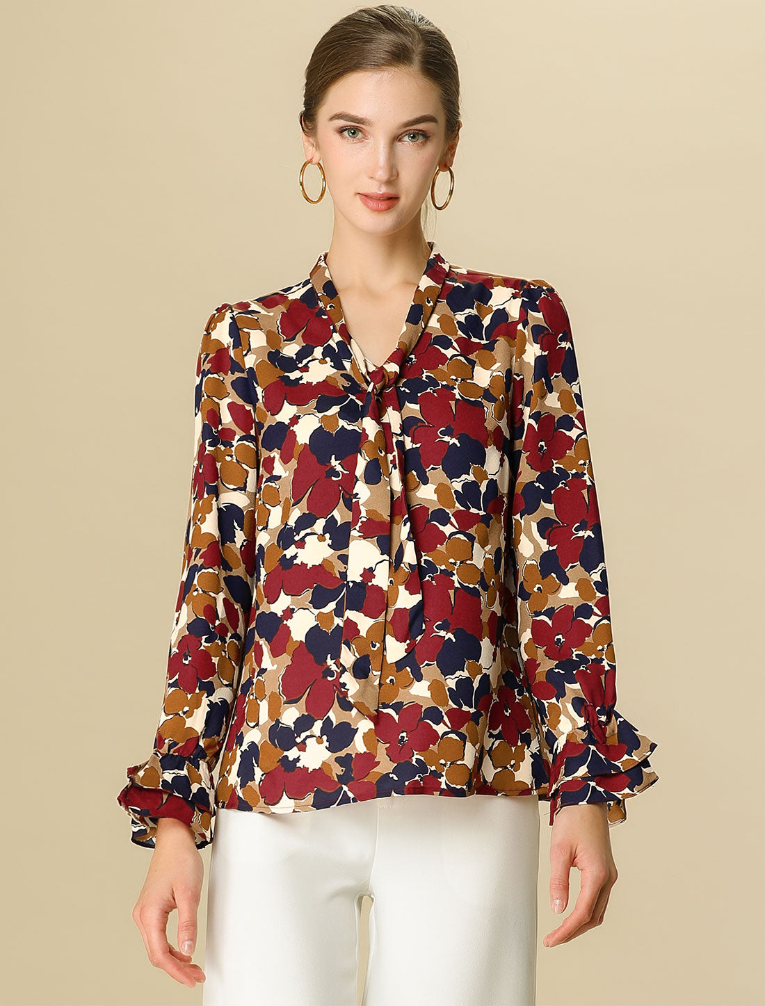 Women's Long Sleeve Blouse Floral Tie Neck Chiffon Ruffle Top