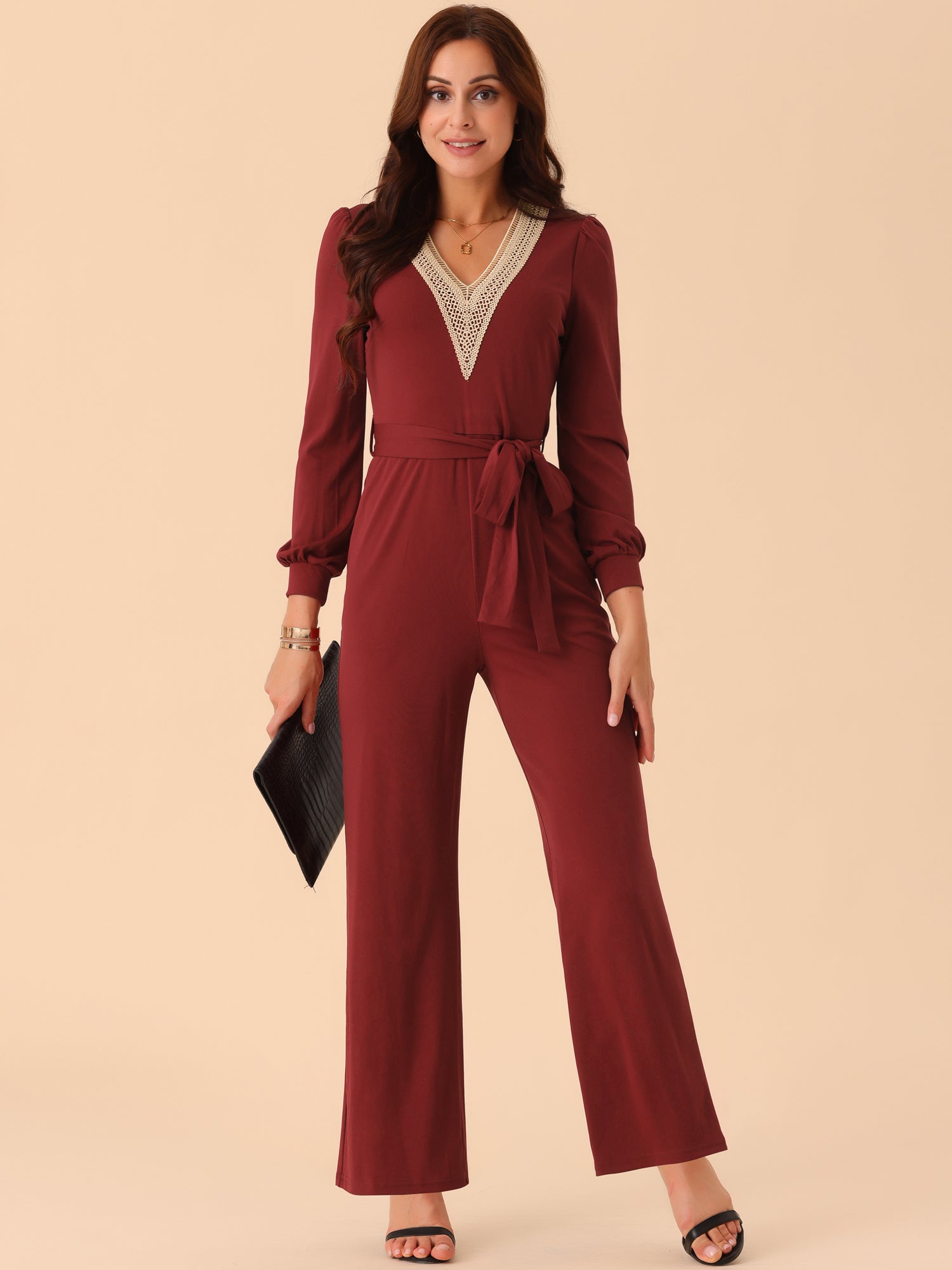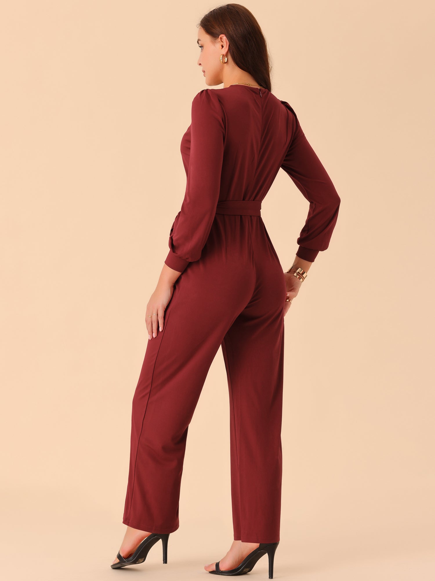 Women's Long Sleeve V Neck Jumpsuit Belted Stretchy Wide Leg Long Pant Romper with Pockets