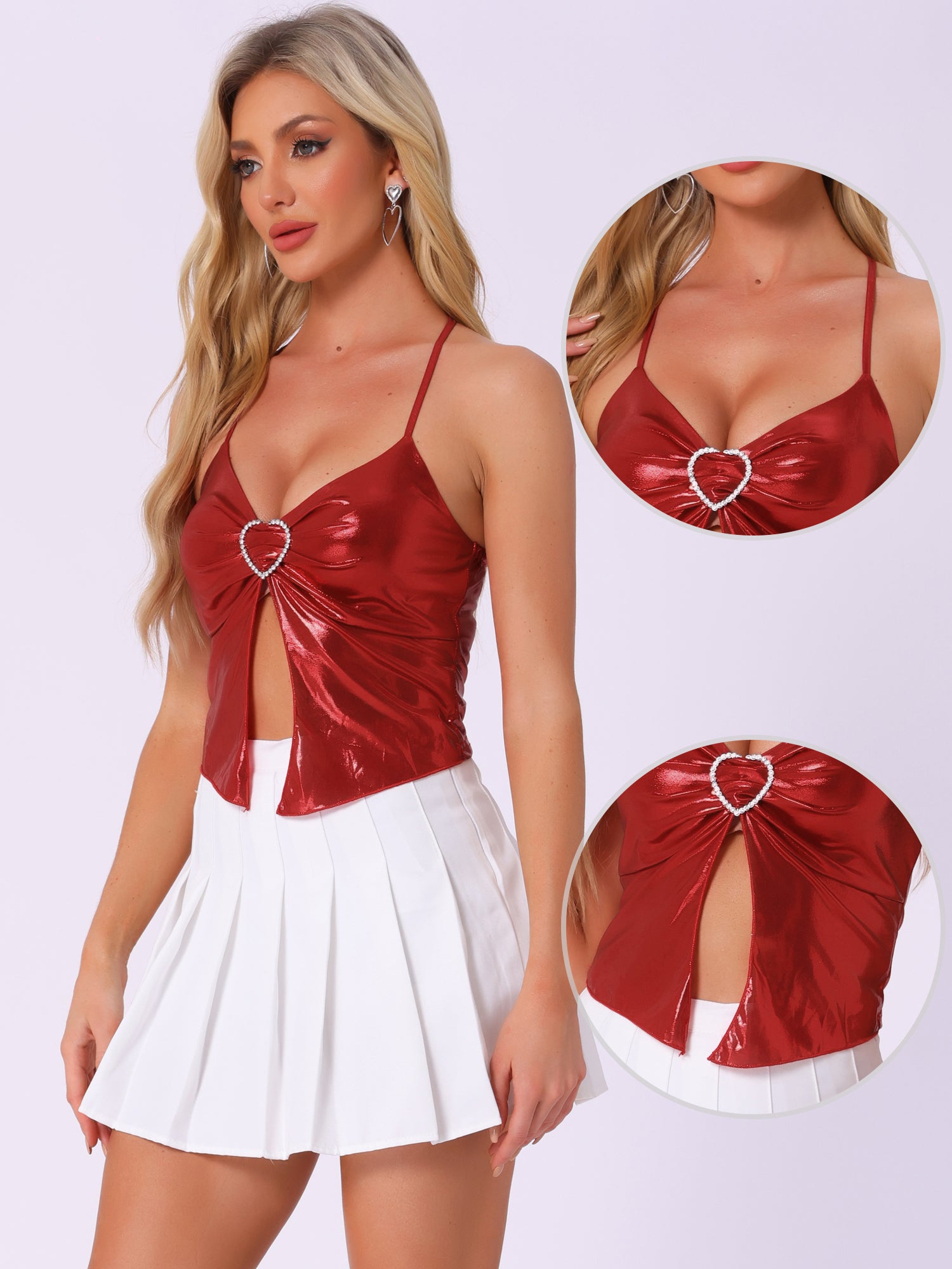 Women's Metallic Backless Cami Asymmetrical Spaghetti Straps Halter Sparkle Top