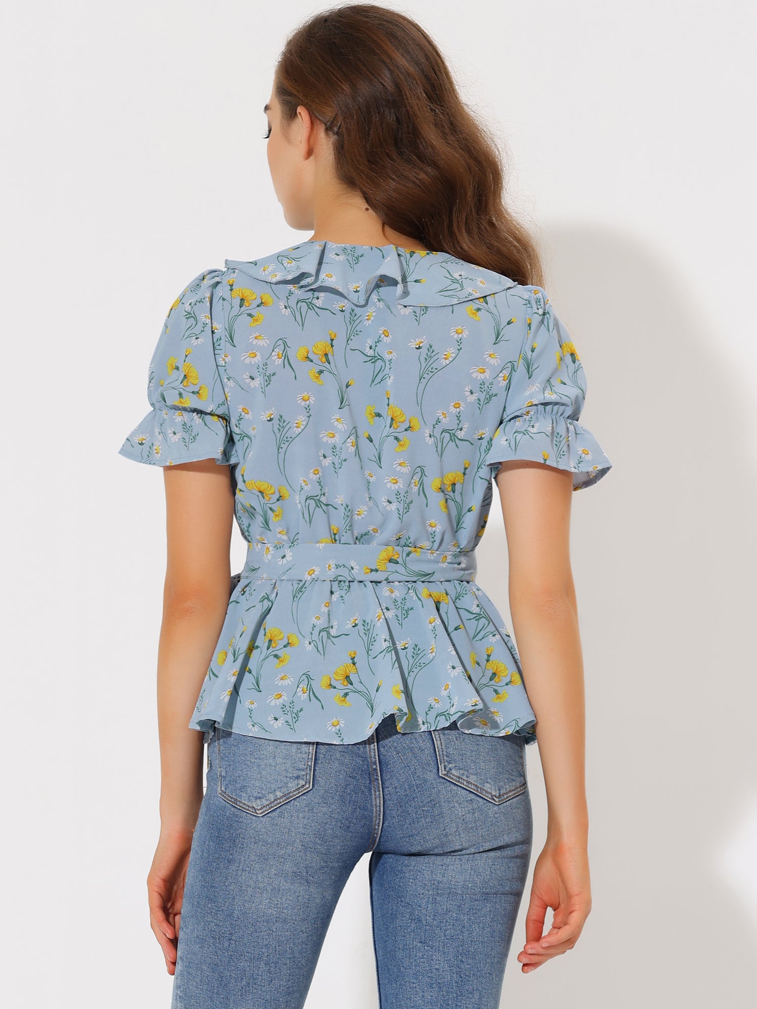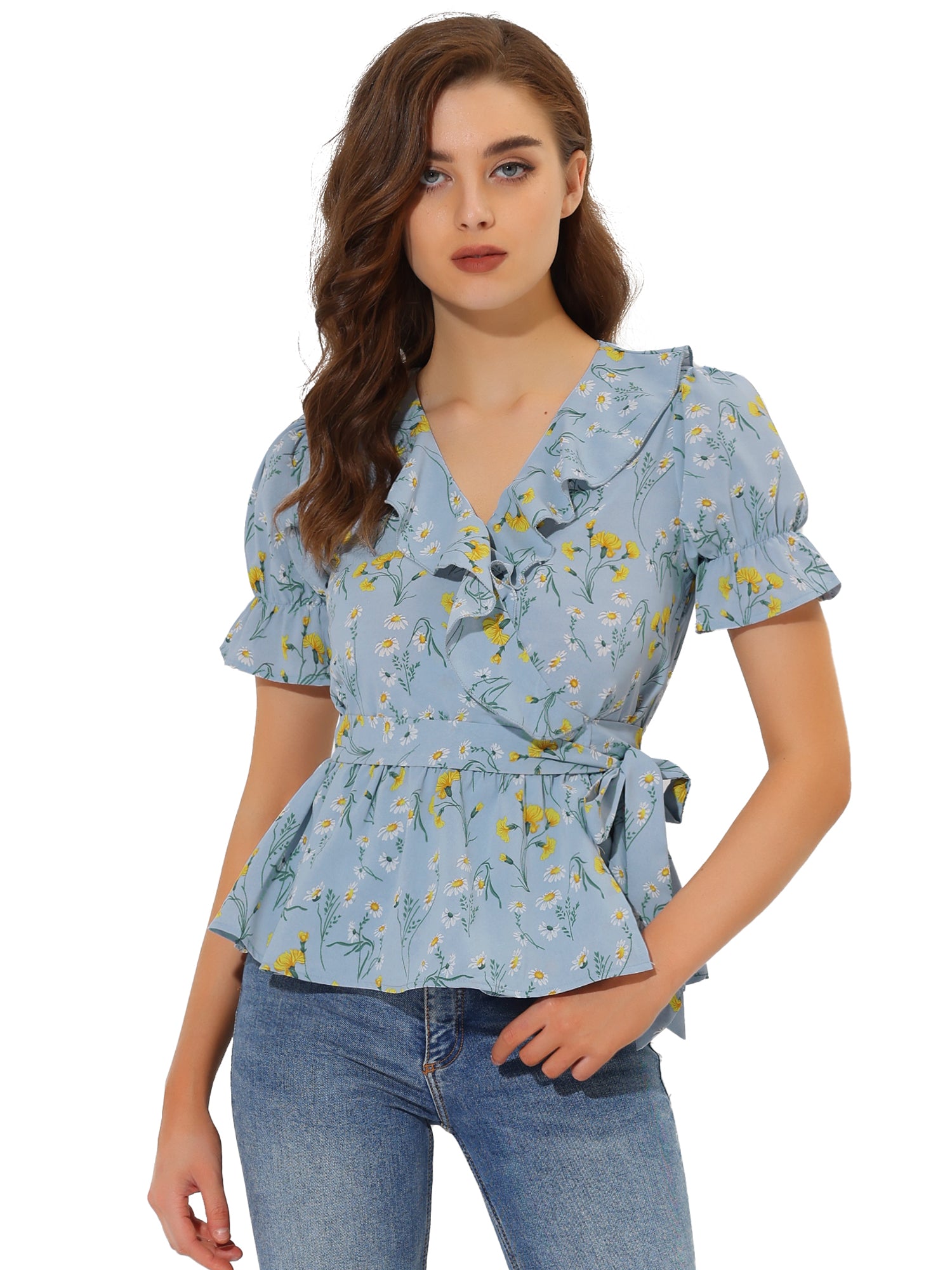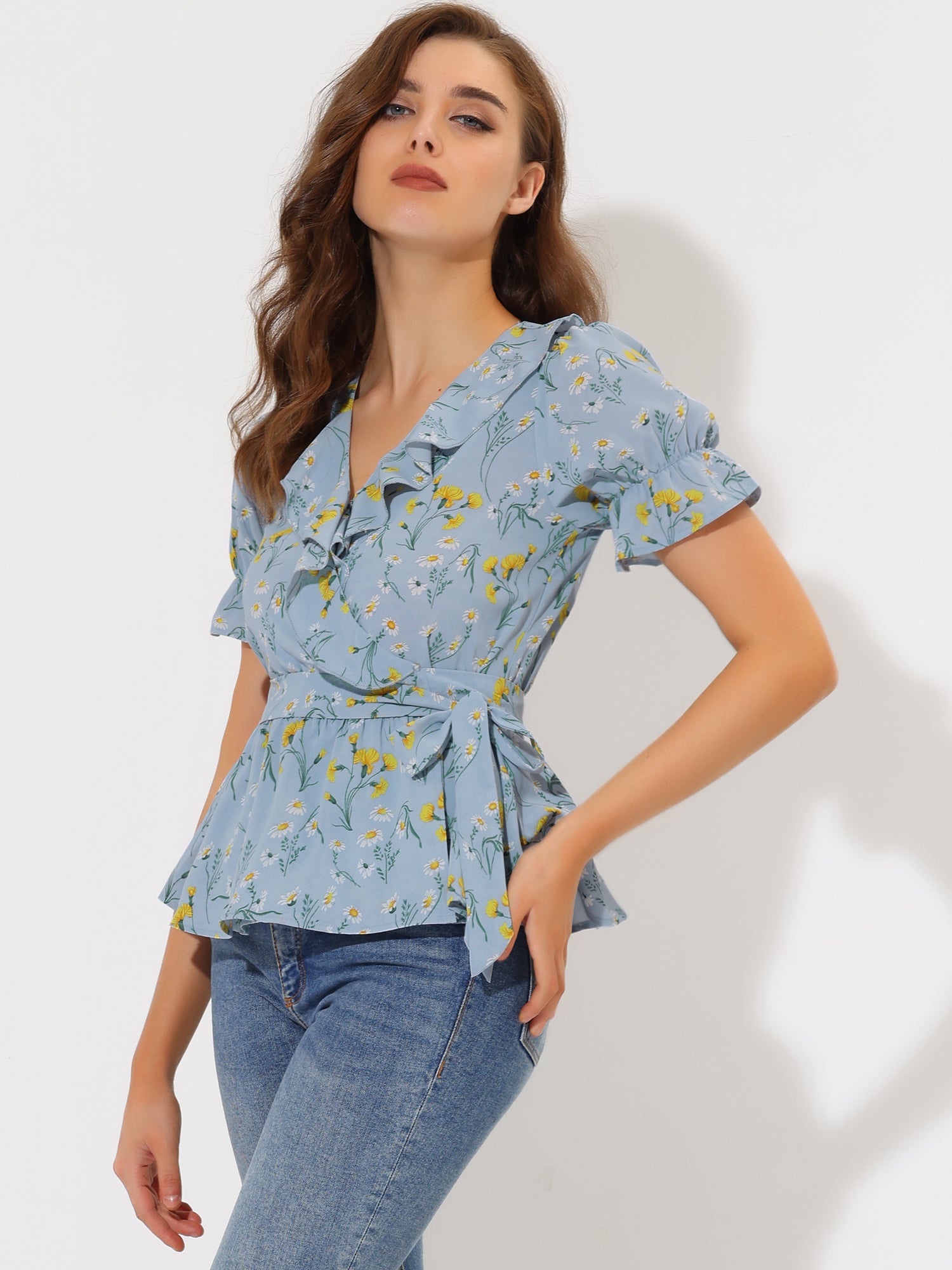 Women's Peplum Top Crossover V Neck Ruffle Wrap Blouse