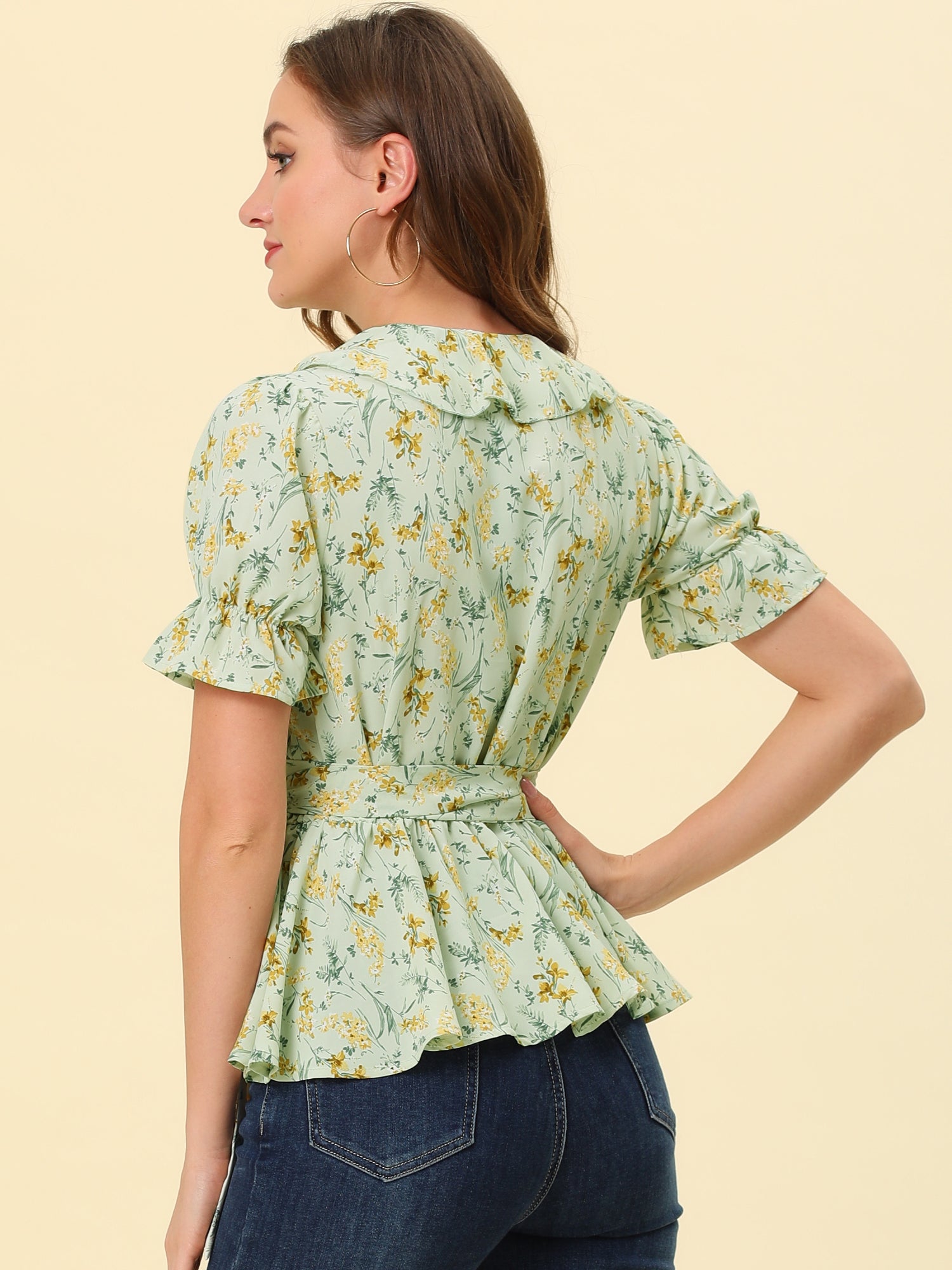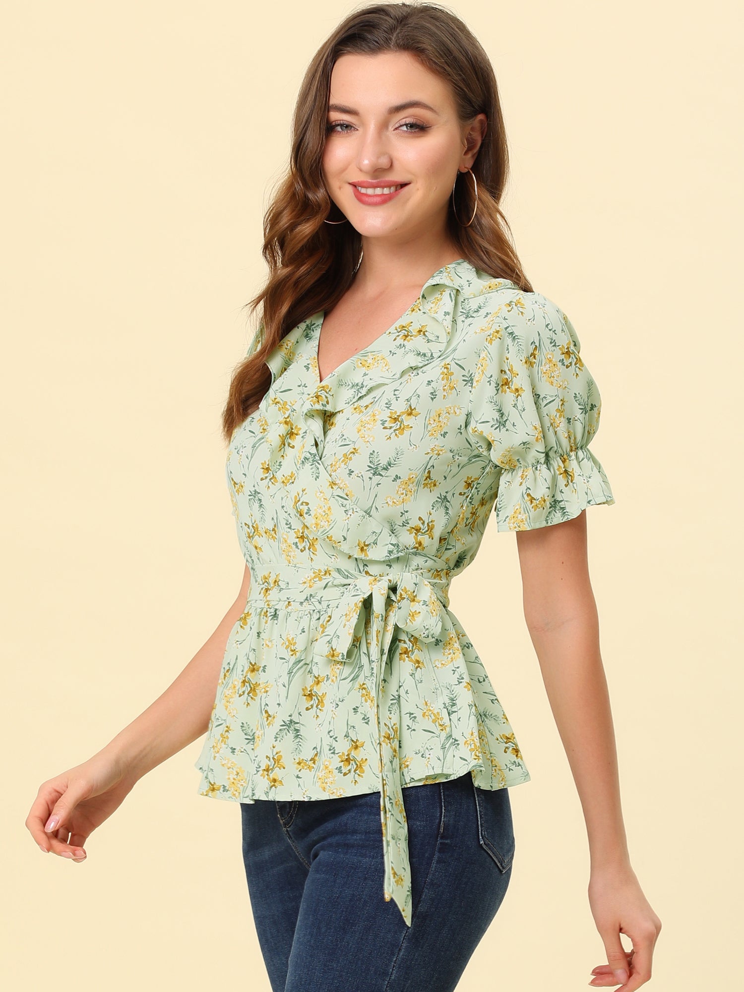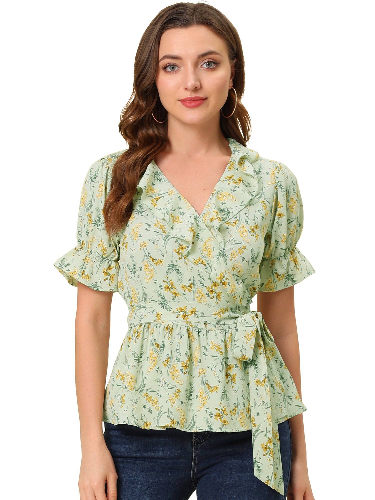 Women's Peplum Top Crossover V Neck Ruffle Wrap Blouse
