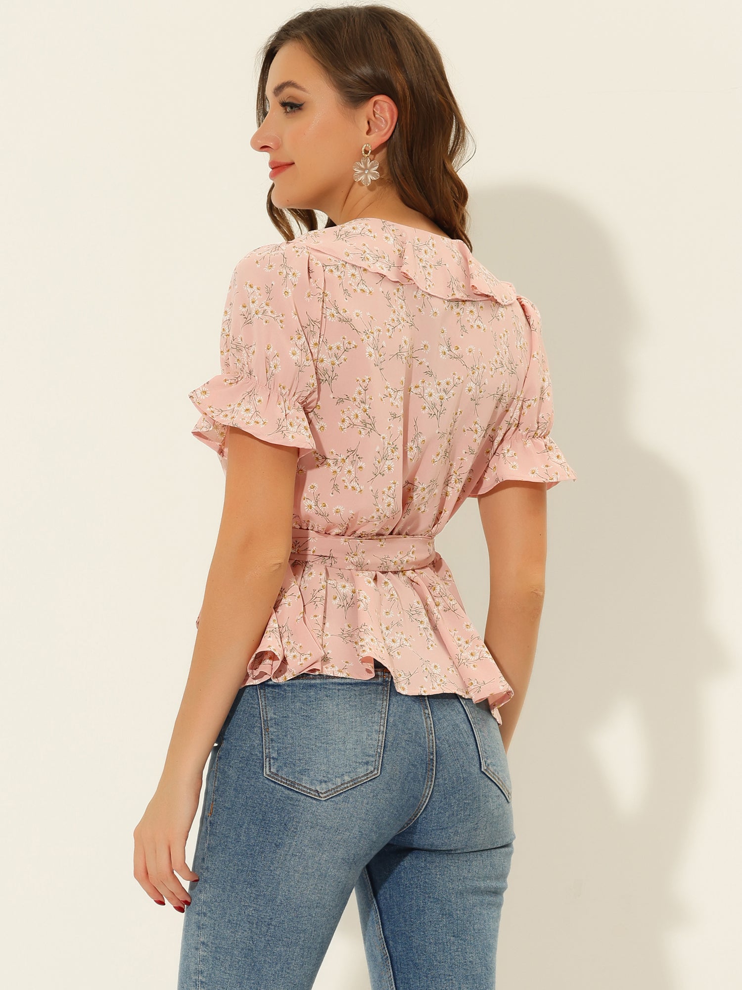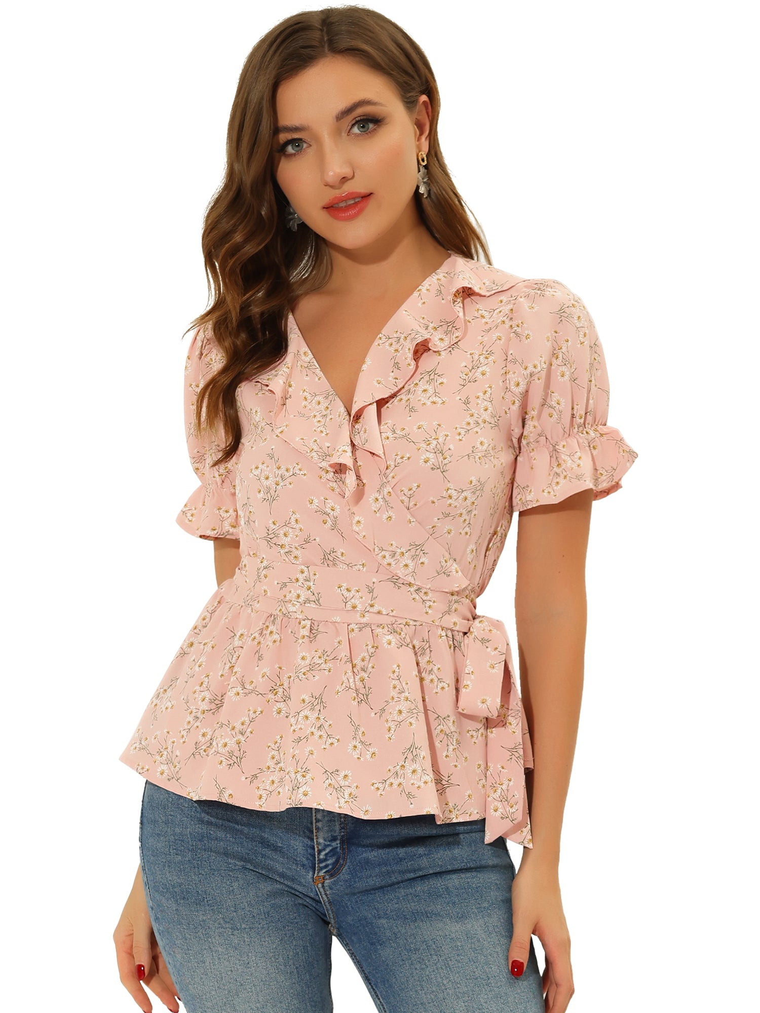 Women's Peplum Top Crossover V Neck Ruffle Wrap Blouse