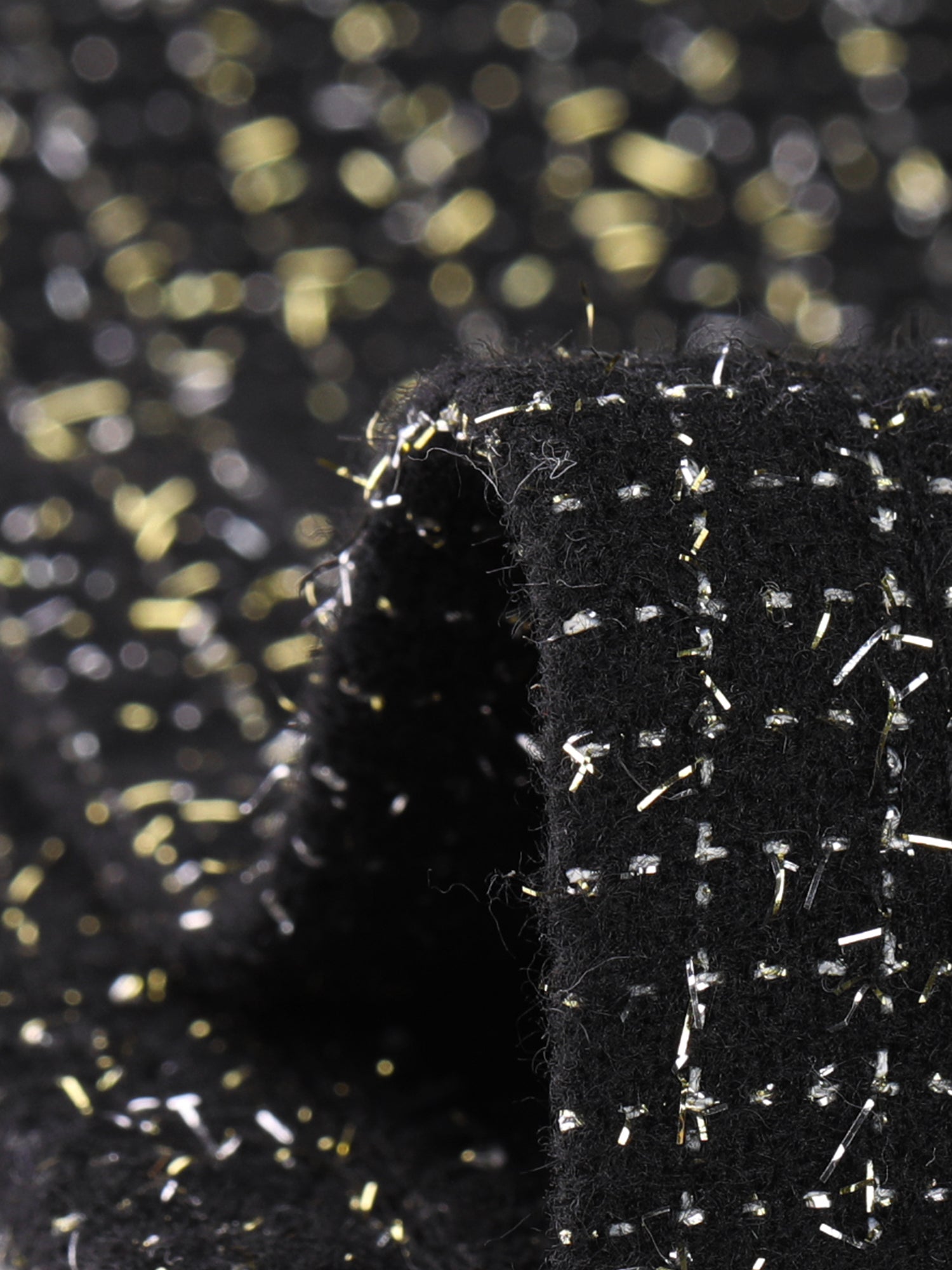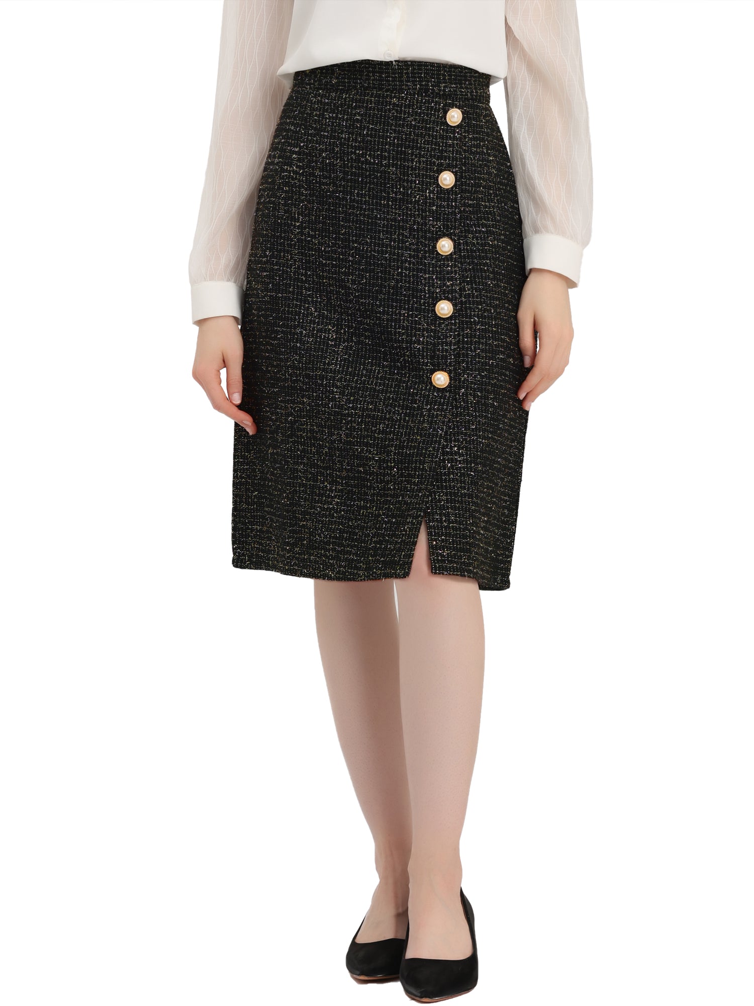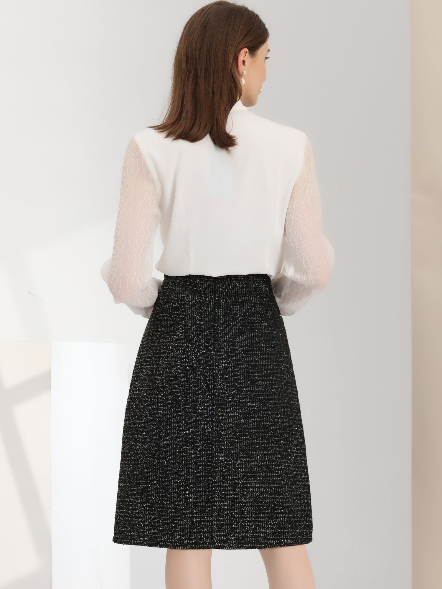 Women's Plaid Tweed High Waist Button Decor Shiny Business Elegant Midi Skirt