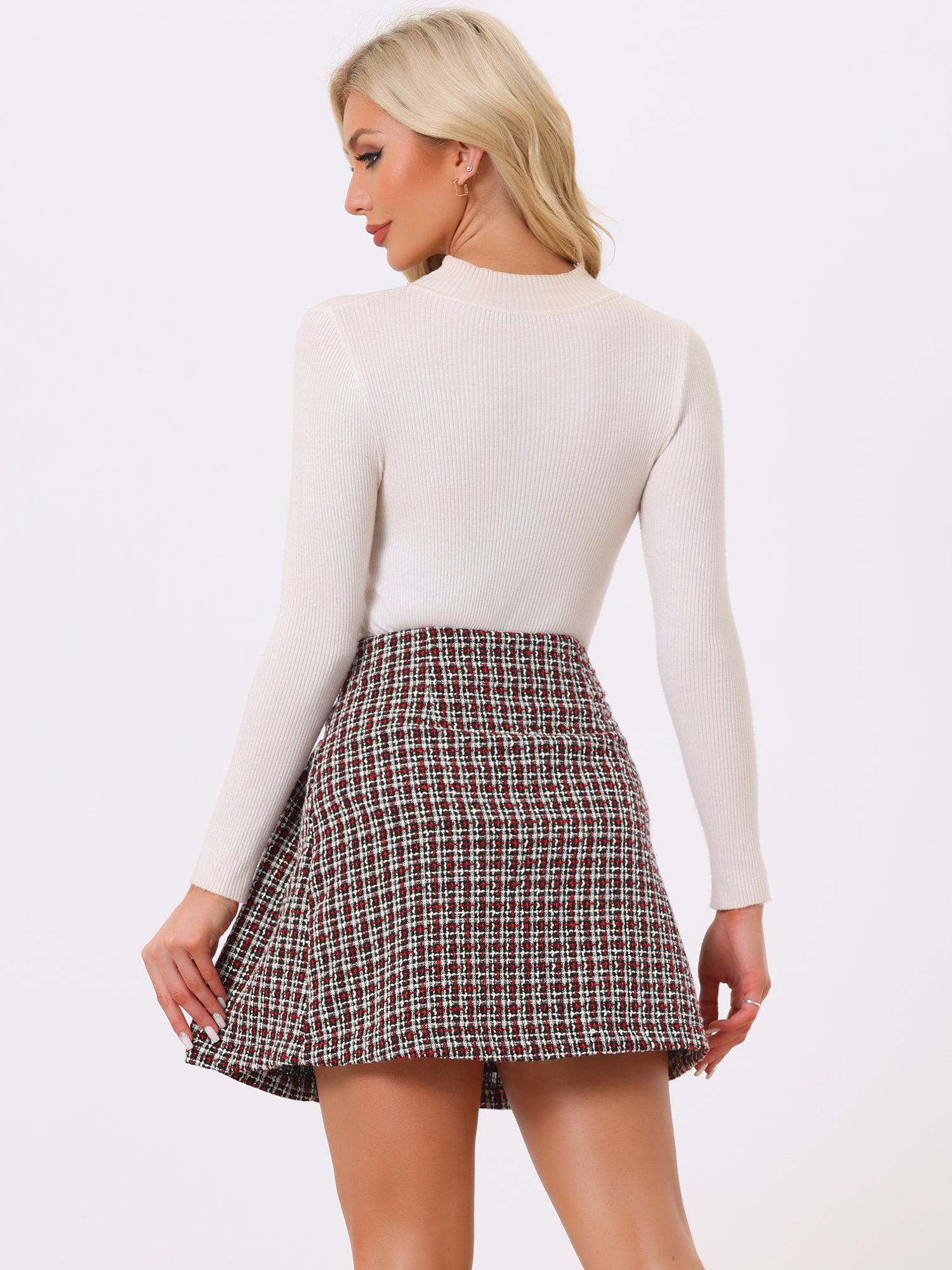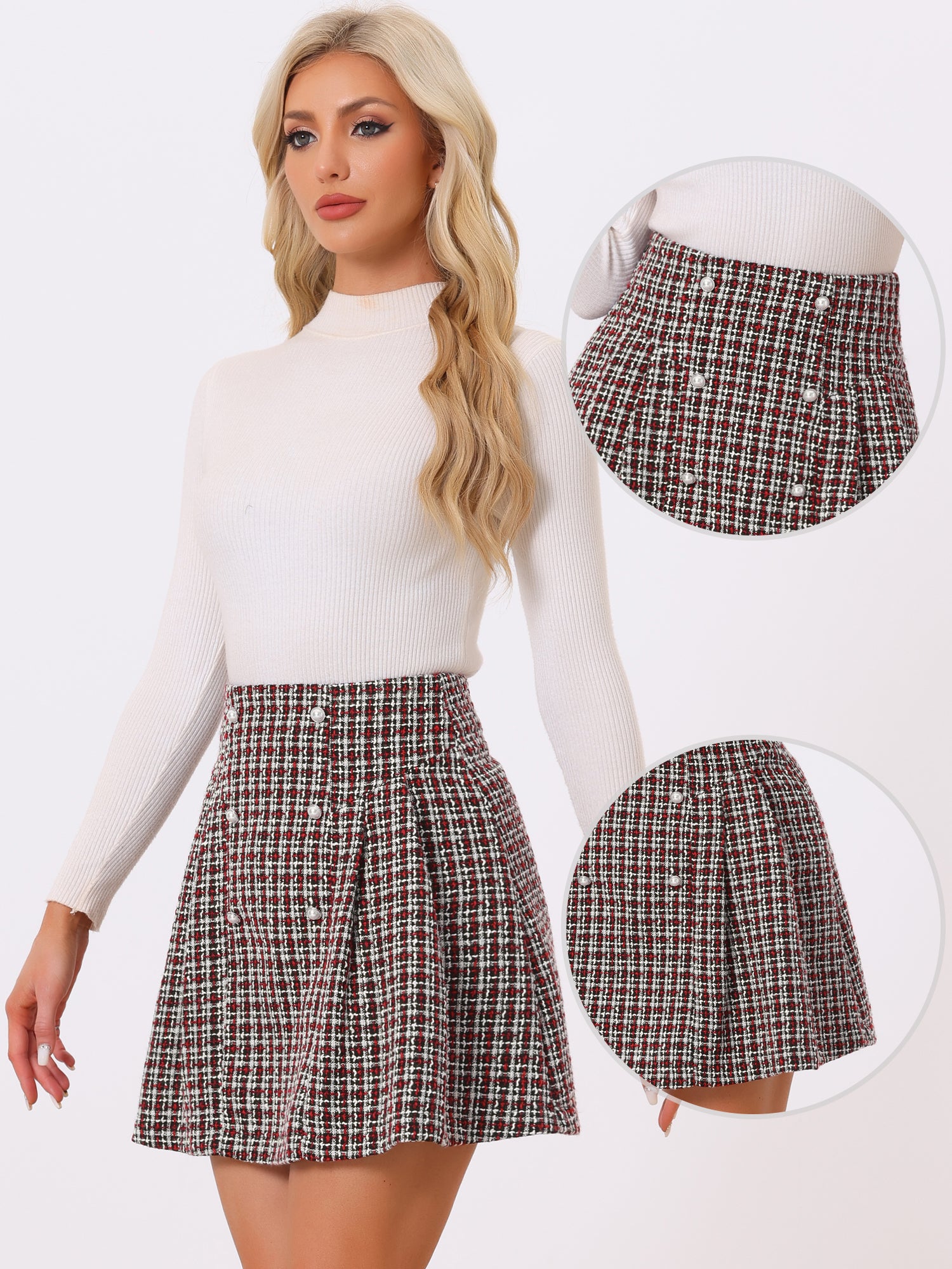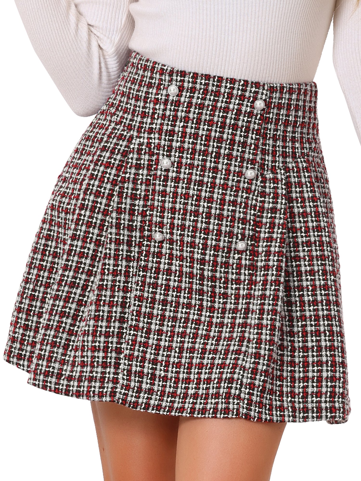 Women's Plaid Tweed Skirt Elegant High Waist Button Decor A-Line Mini Skirt
