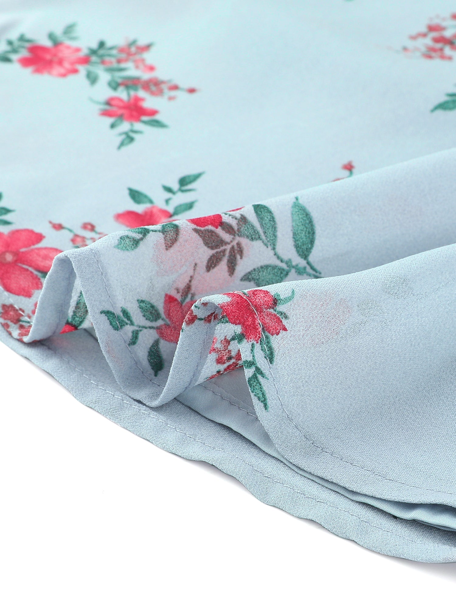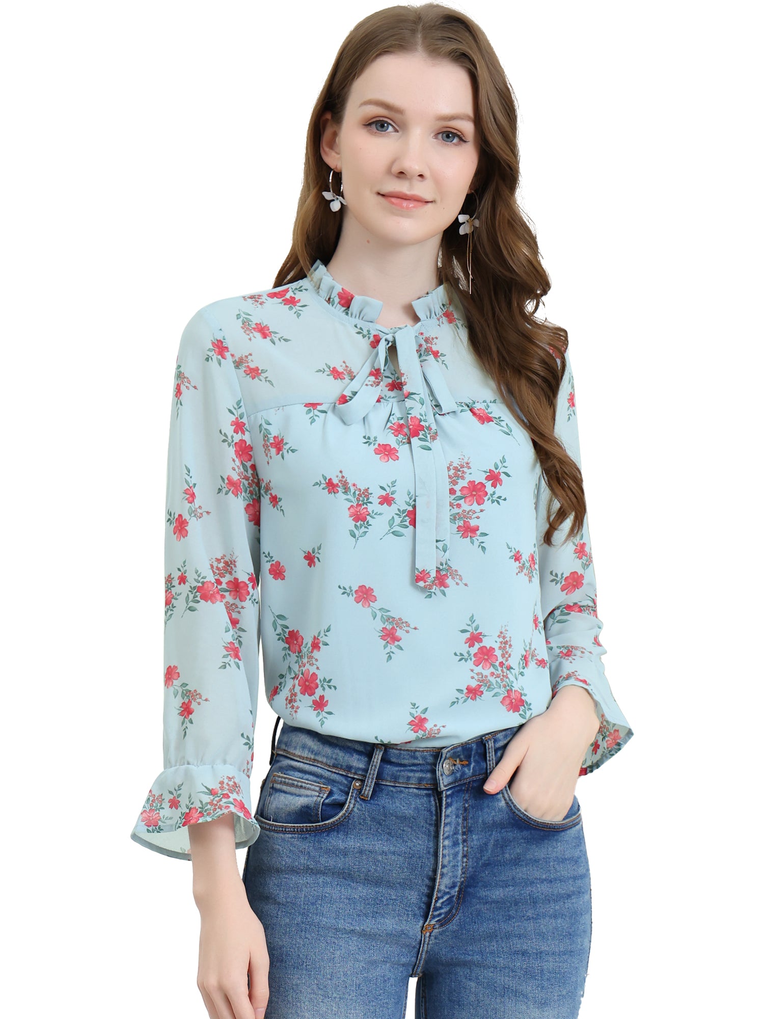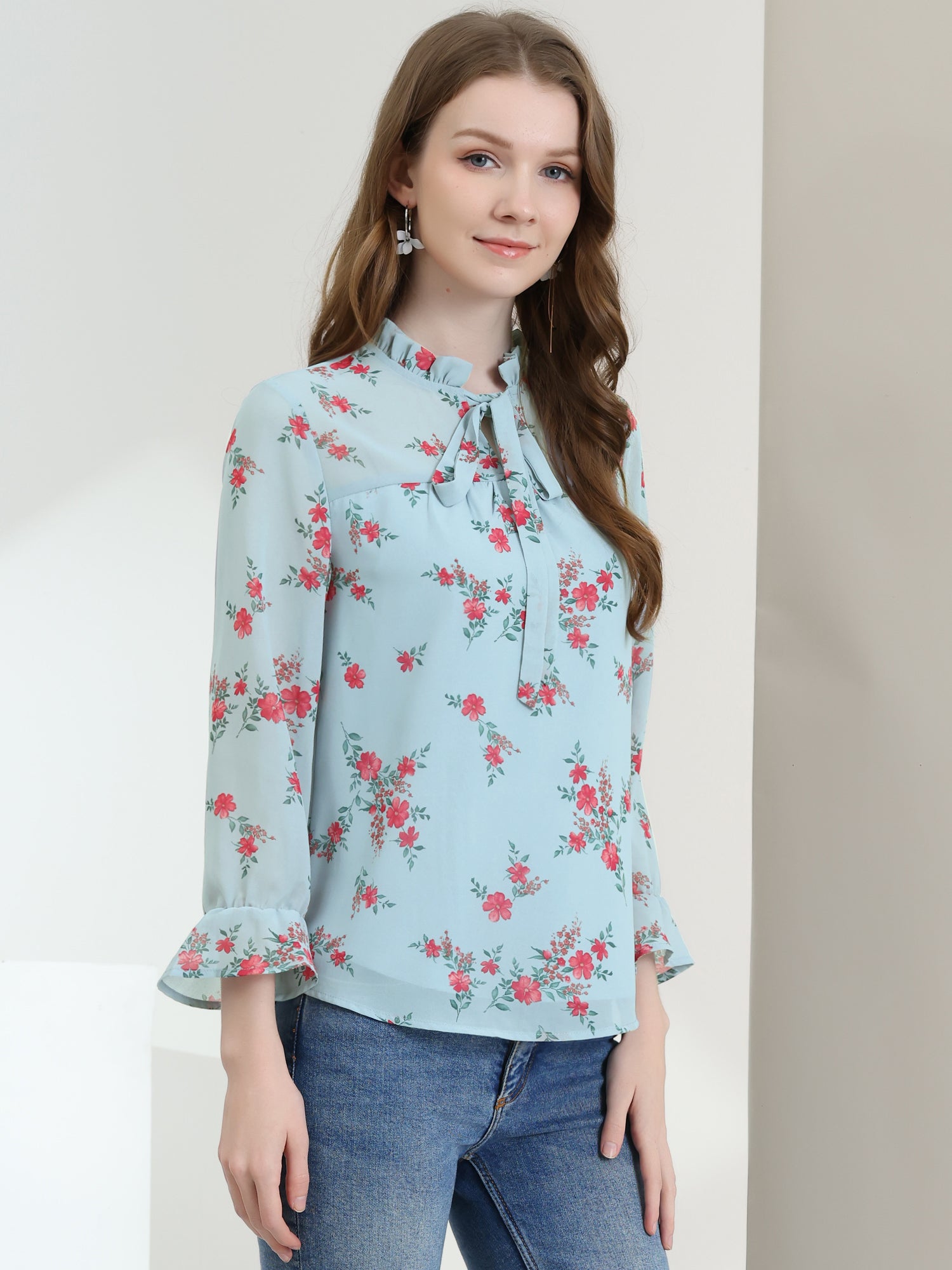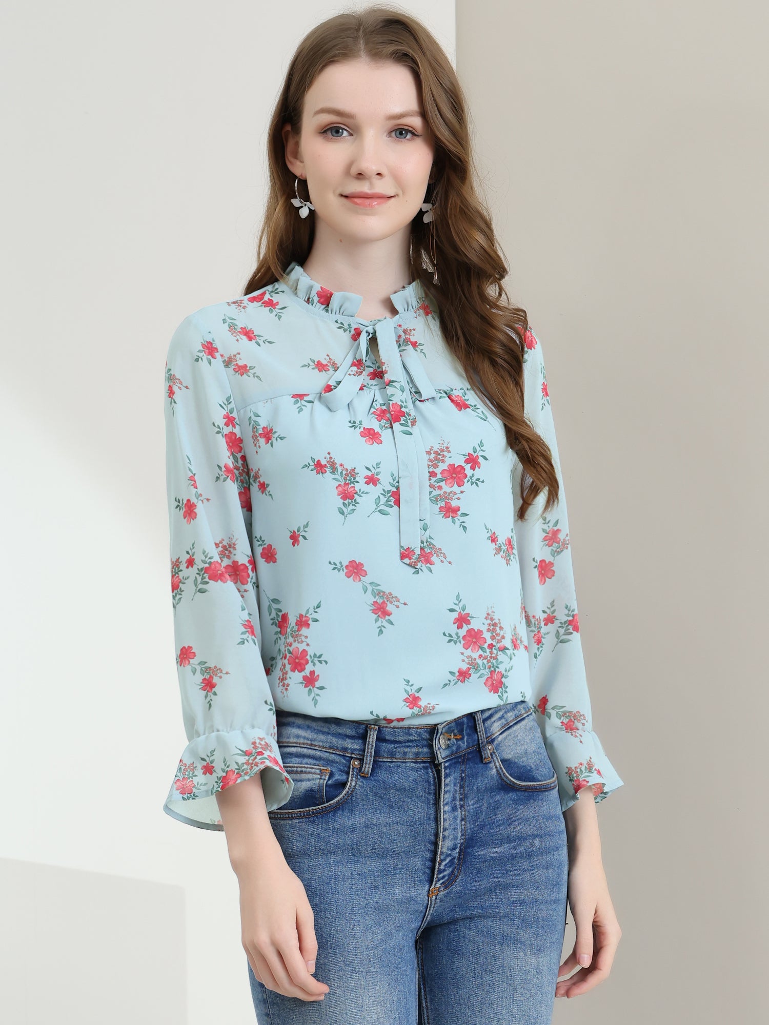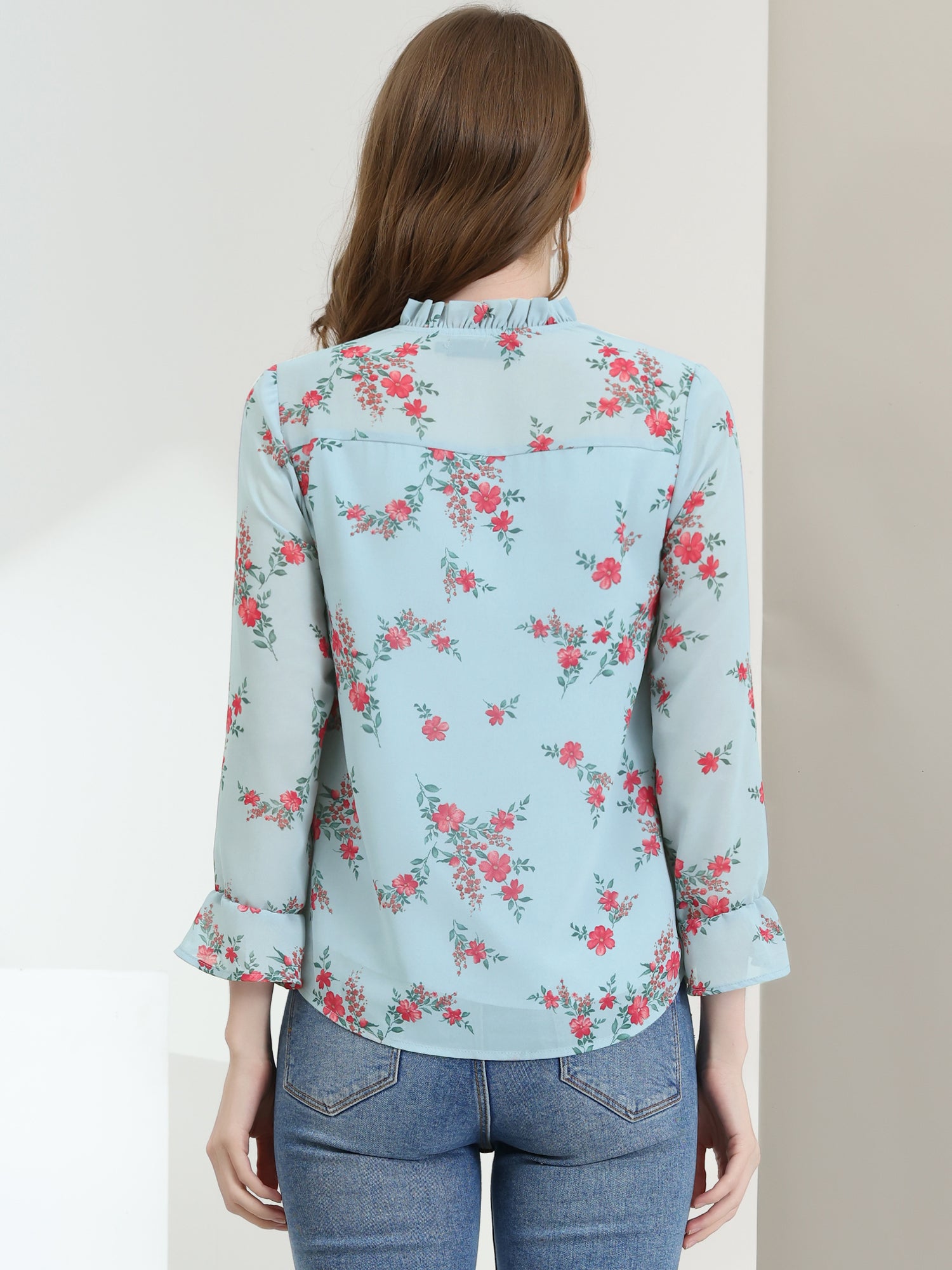 Women's Ruffle Collar 3/4 Sleeve Tie Neck Chiffon Floral Blouse Top