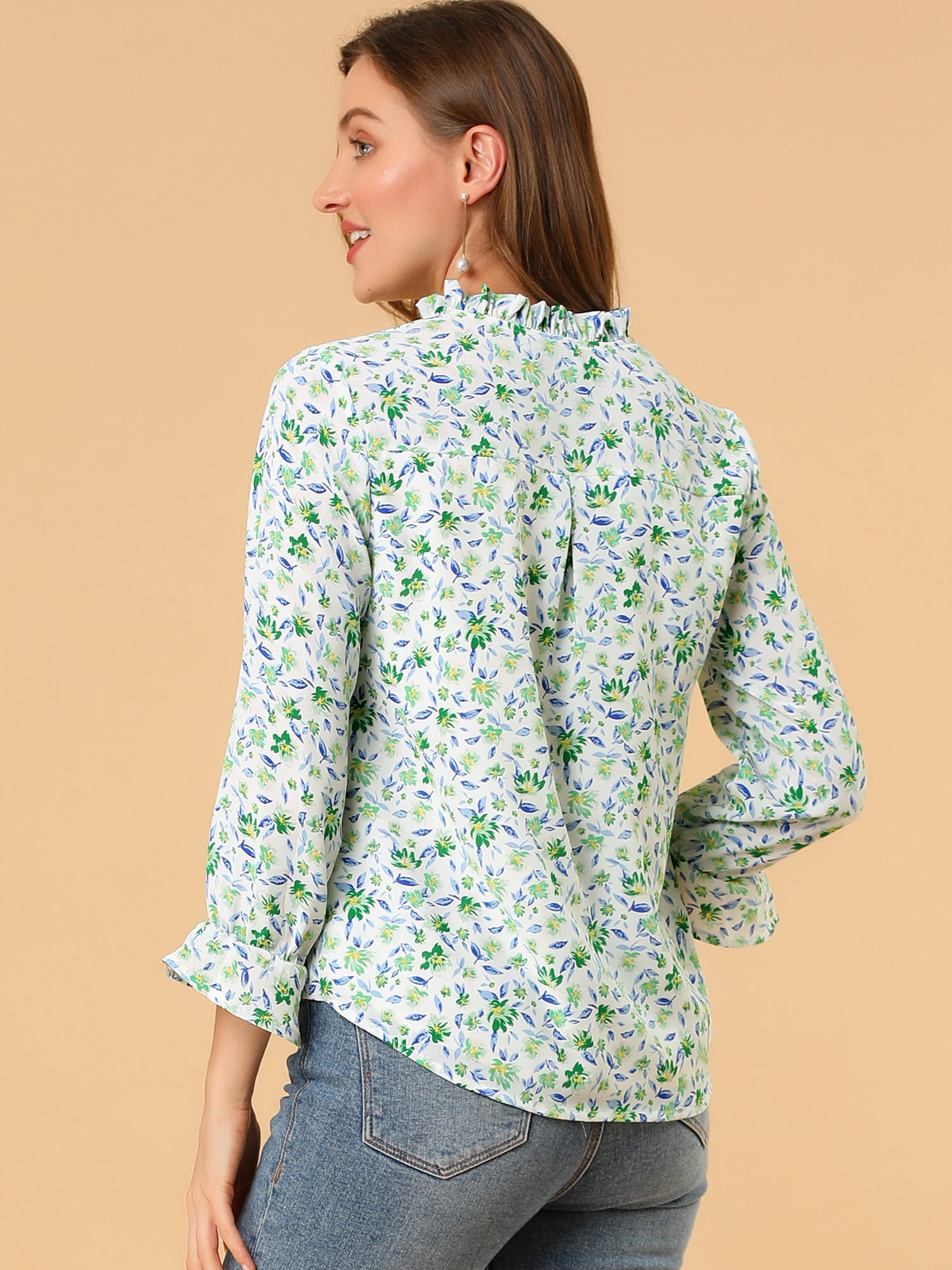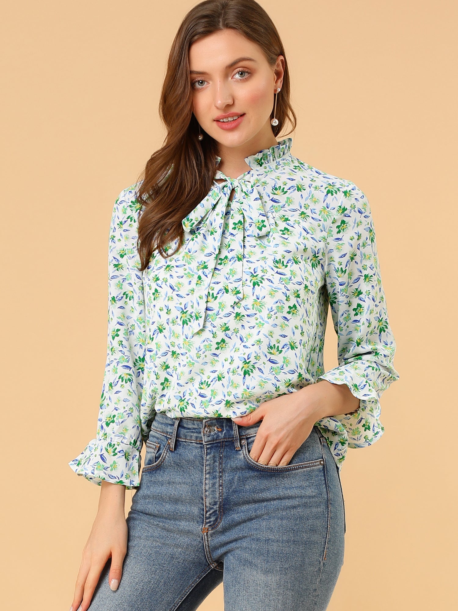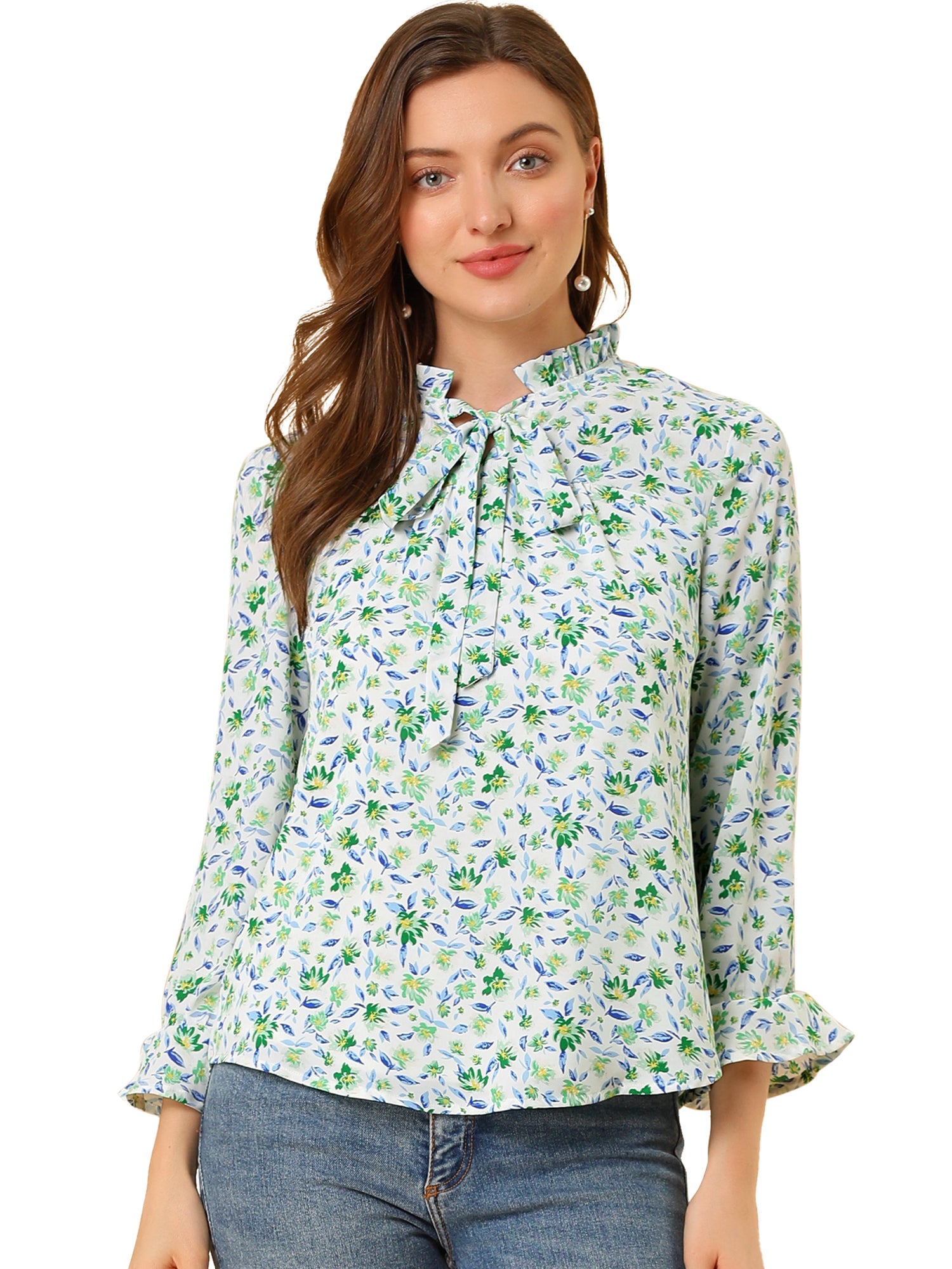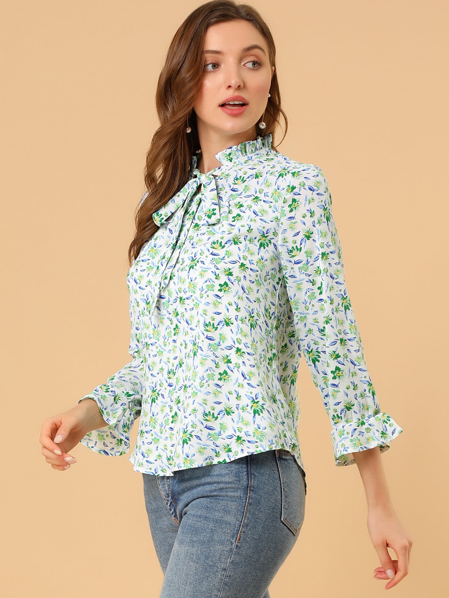 Women's Ruffle Collar 3/4 Sleeve Tie Neck Chiffon Floral Blouse Top