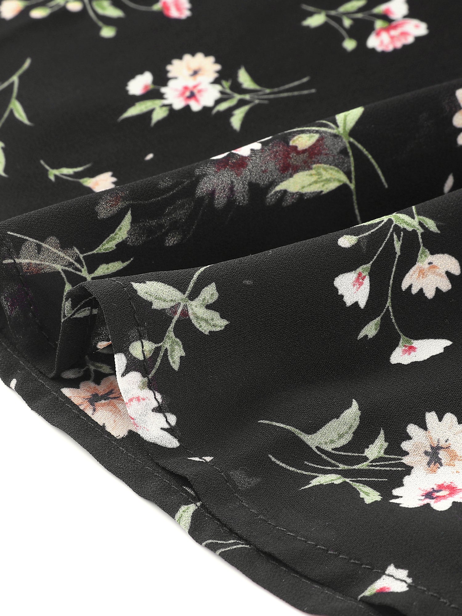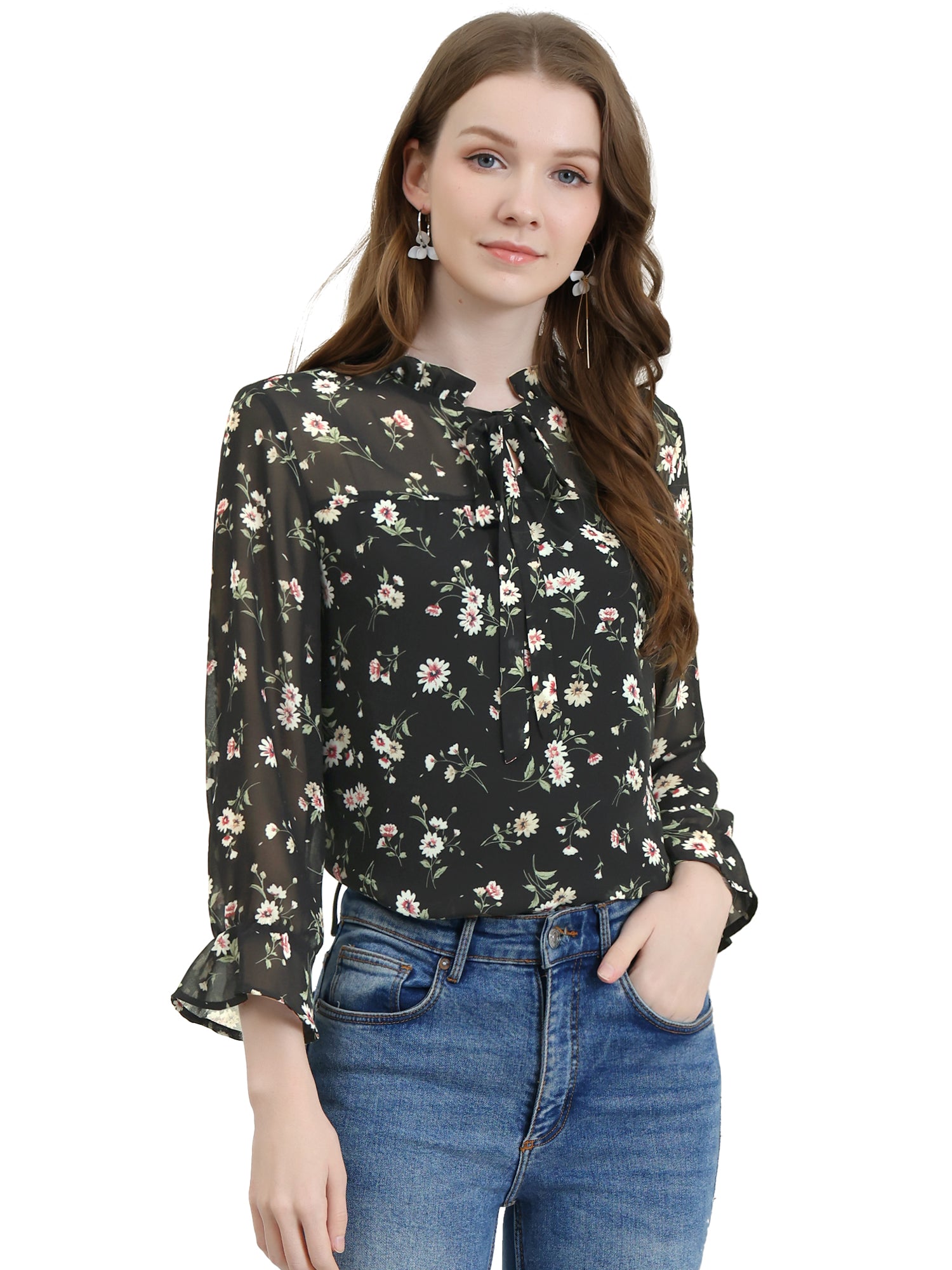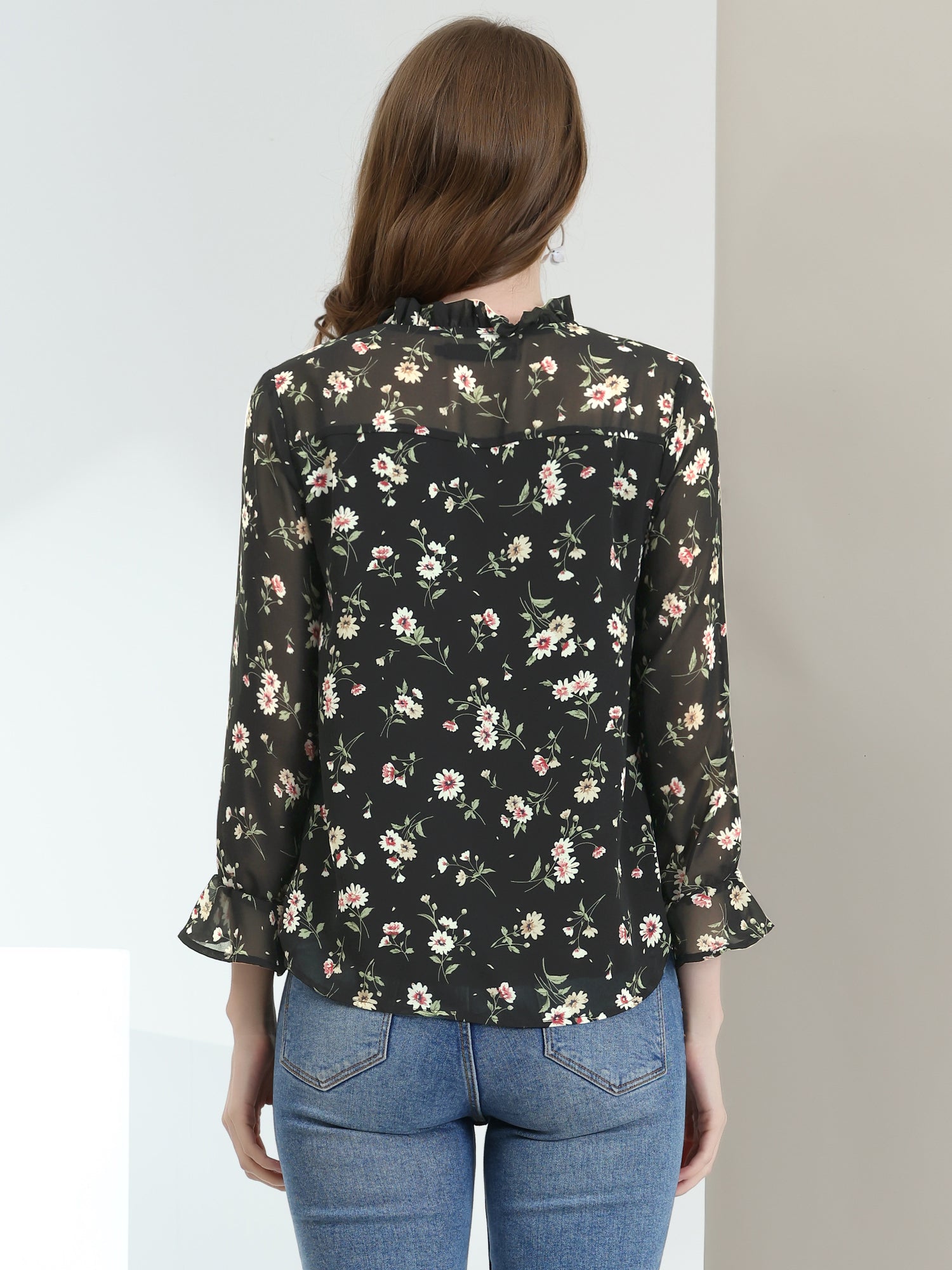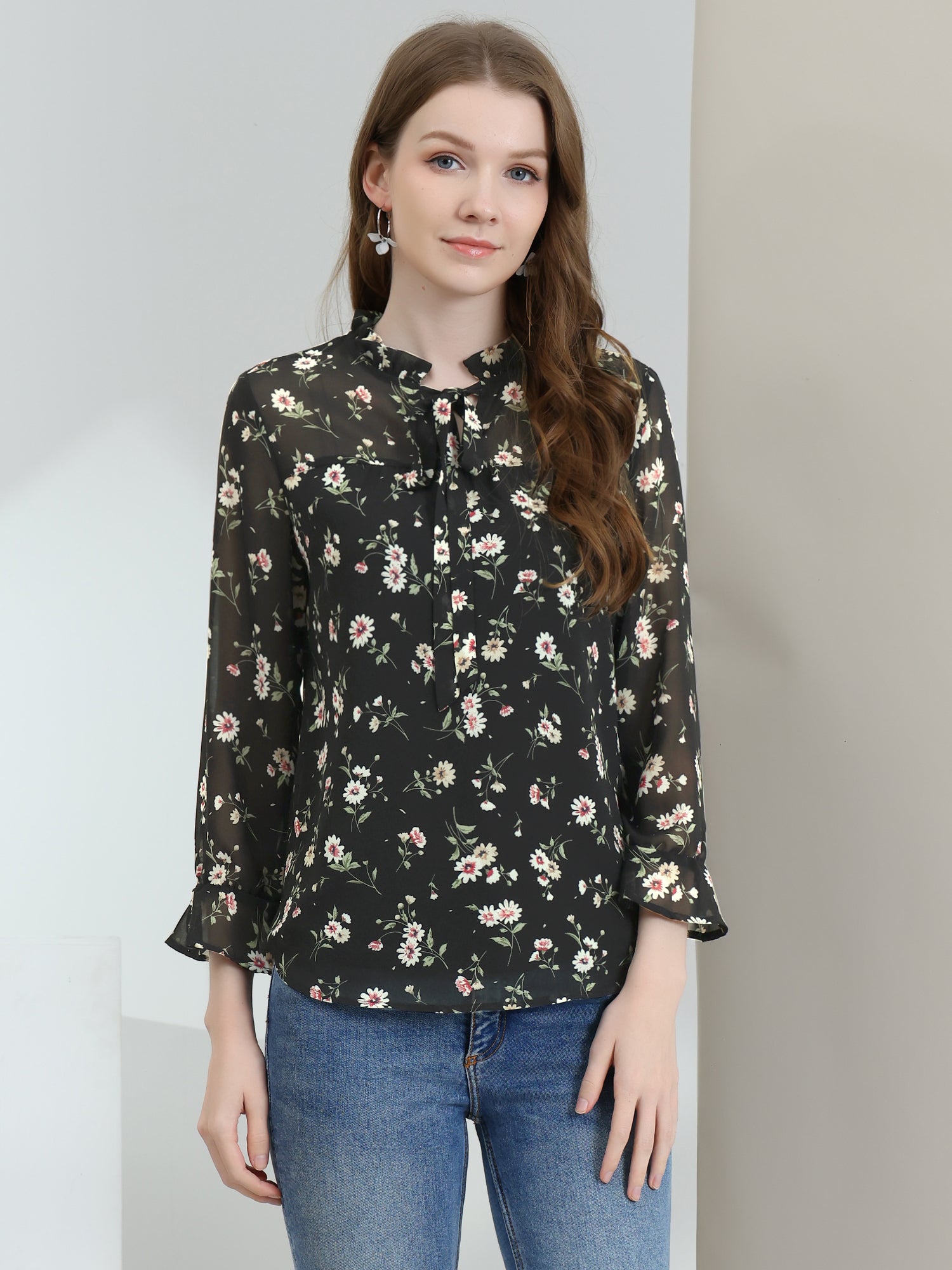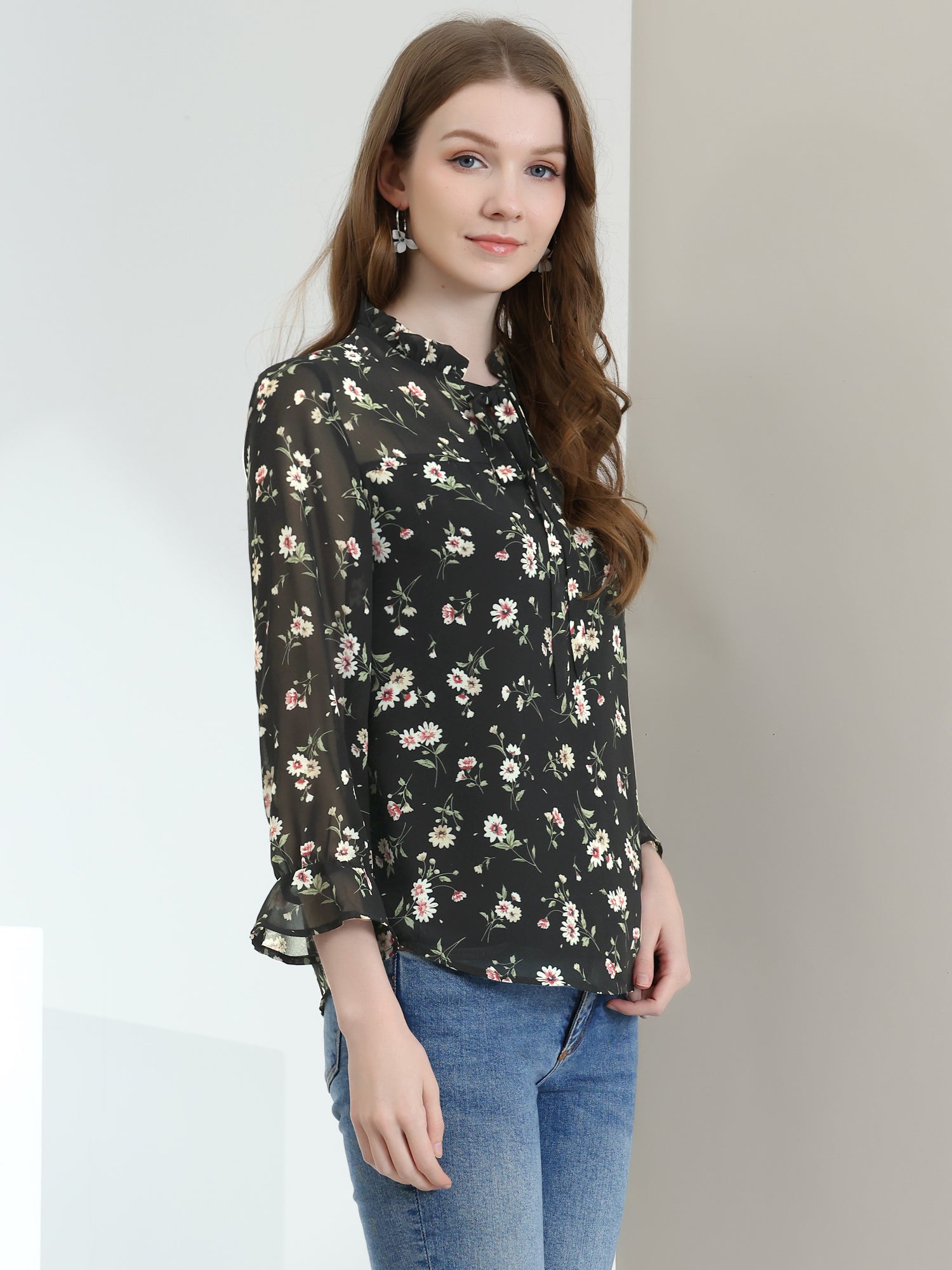 Women's Ruffle Collar 3/4 Sleeve Tie Neck Chiffon Floral Blouse Top