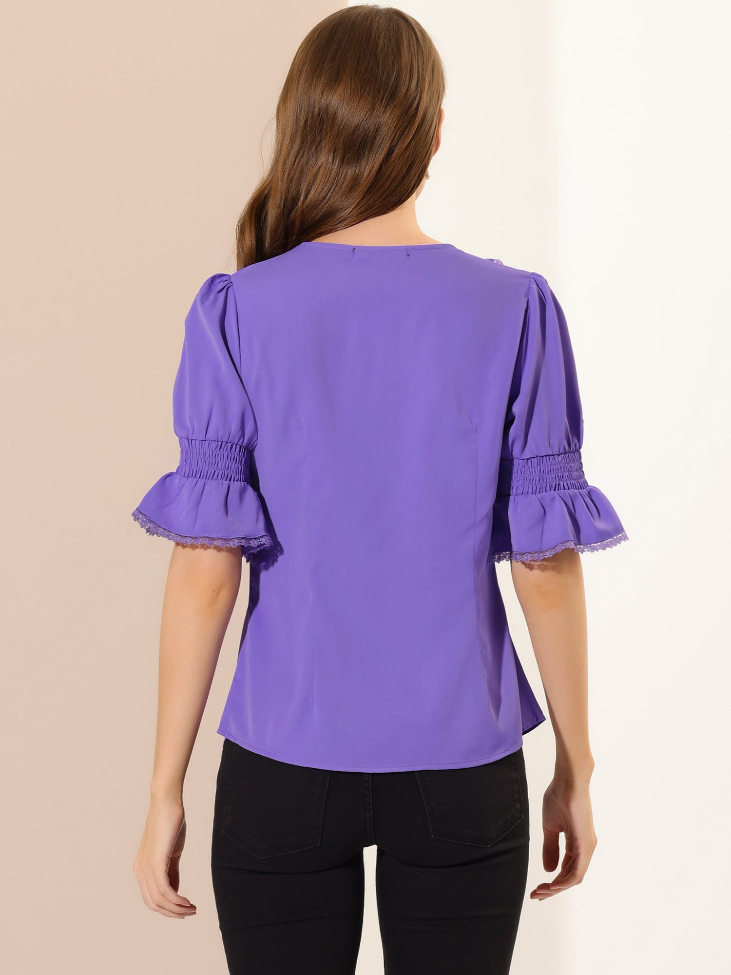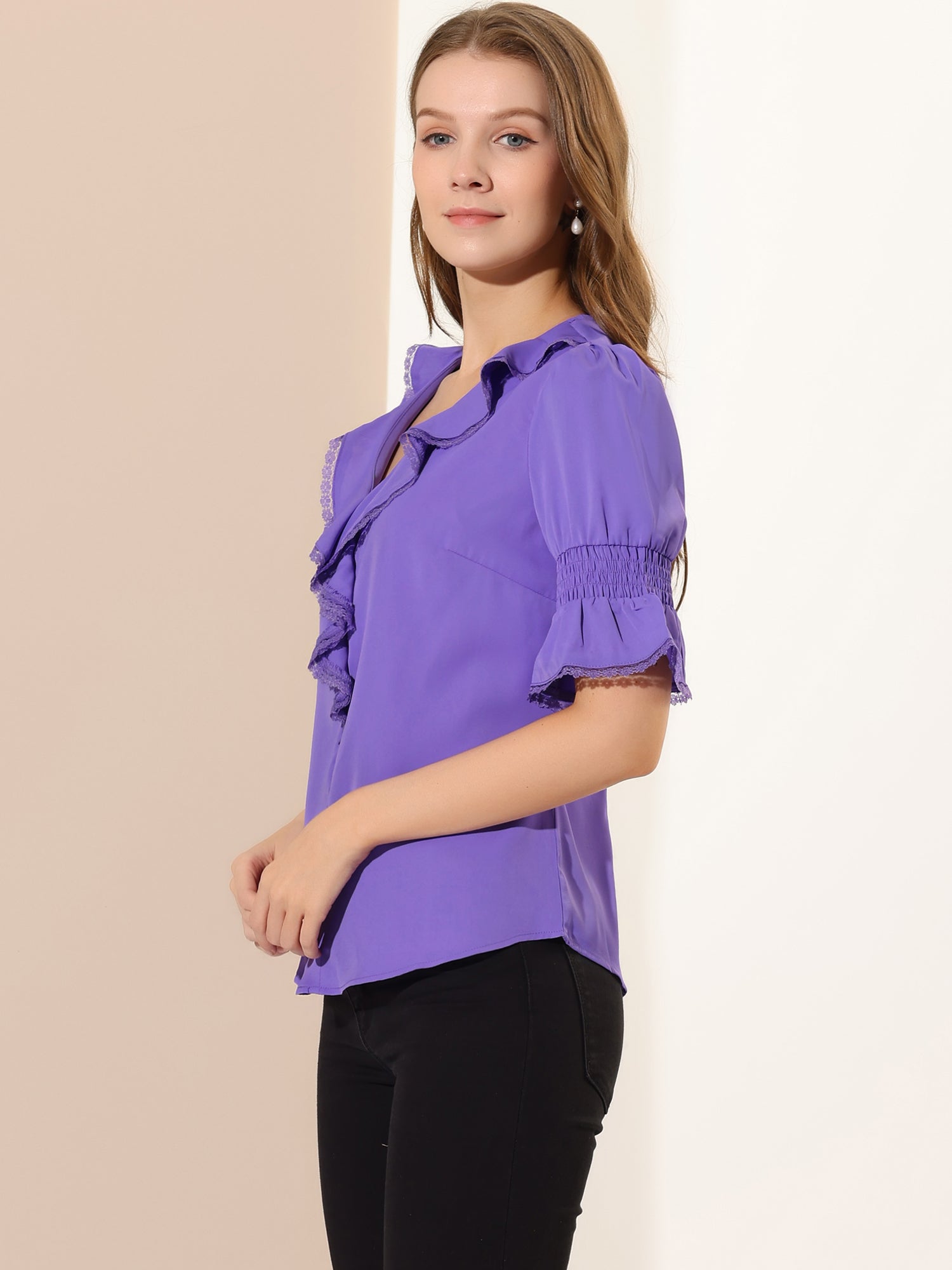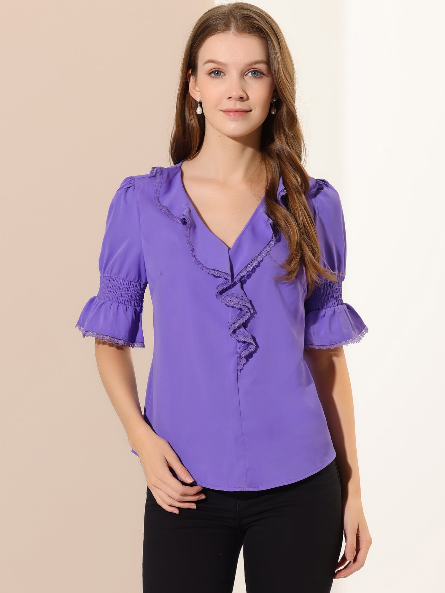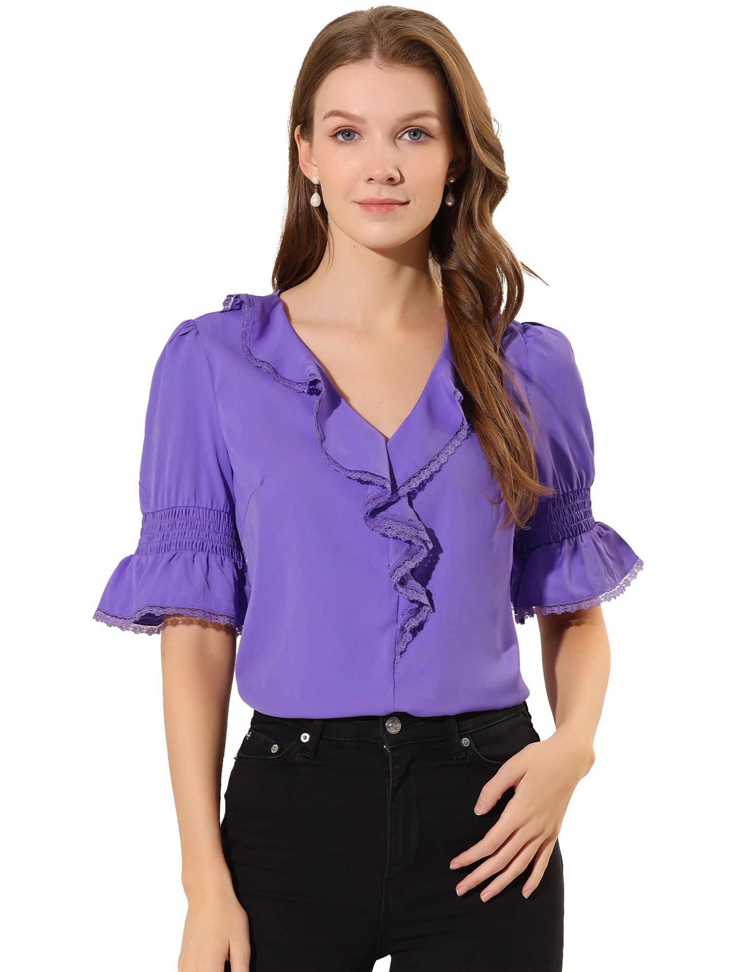 Women's Ruffle V Neck Puff Sleeve Blouse Summer Casual Chiffon Top