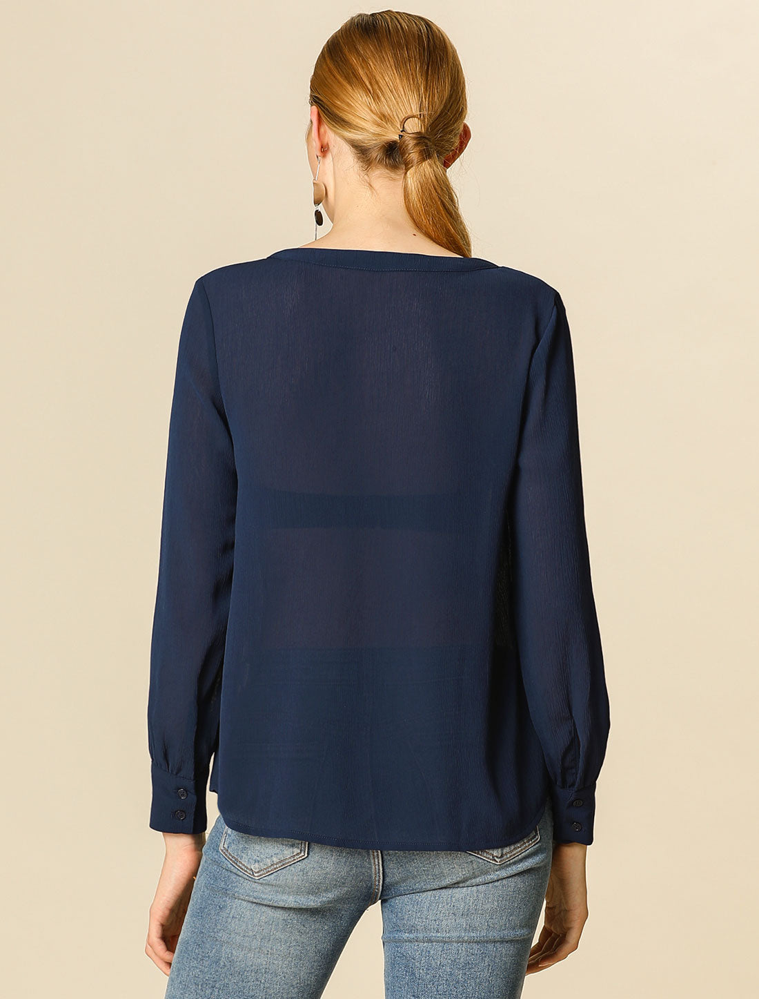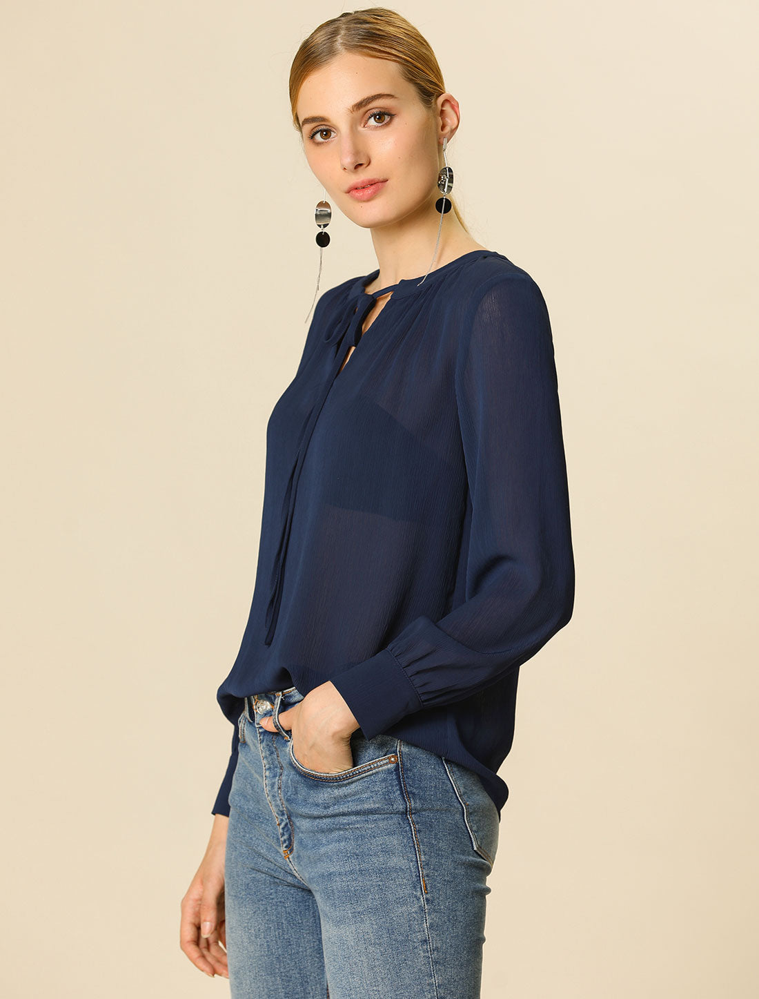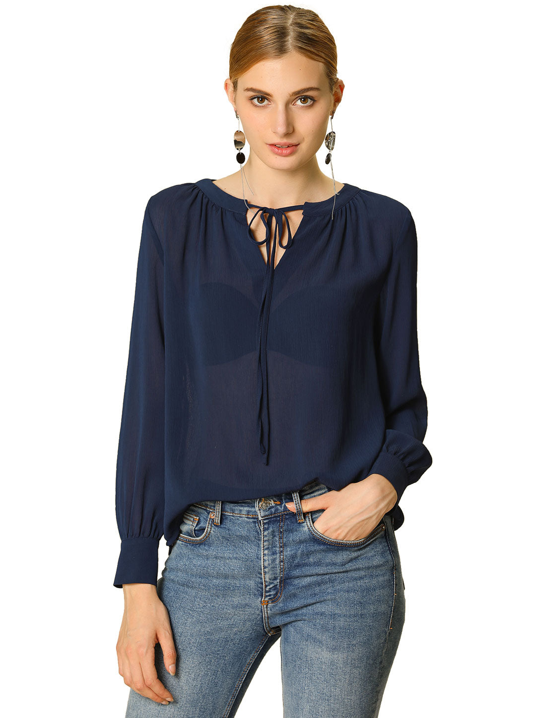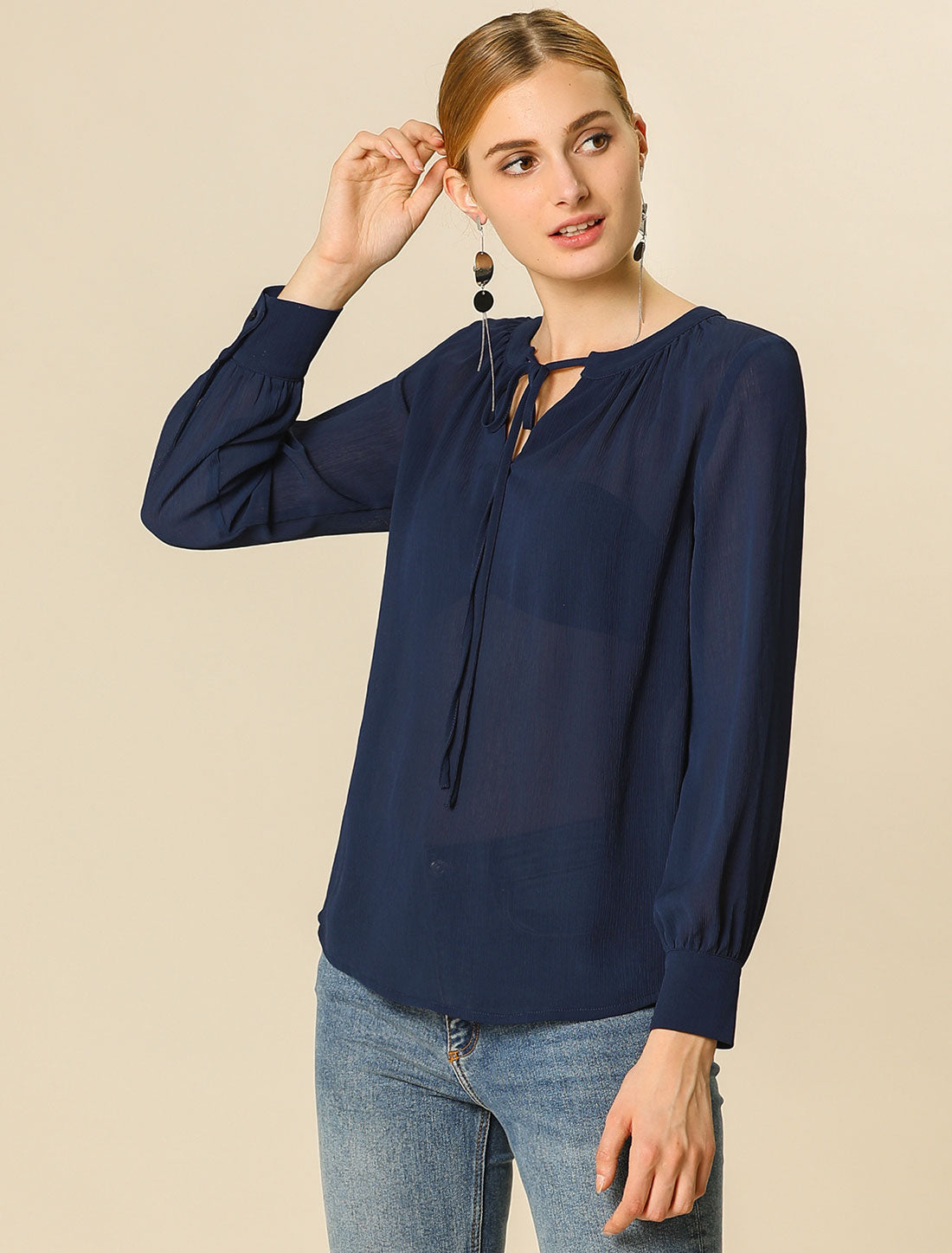 Women's Semi Sheer Blouse Long Sleeve Tie Neck Chiffon Top