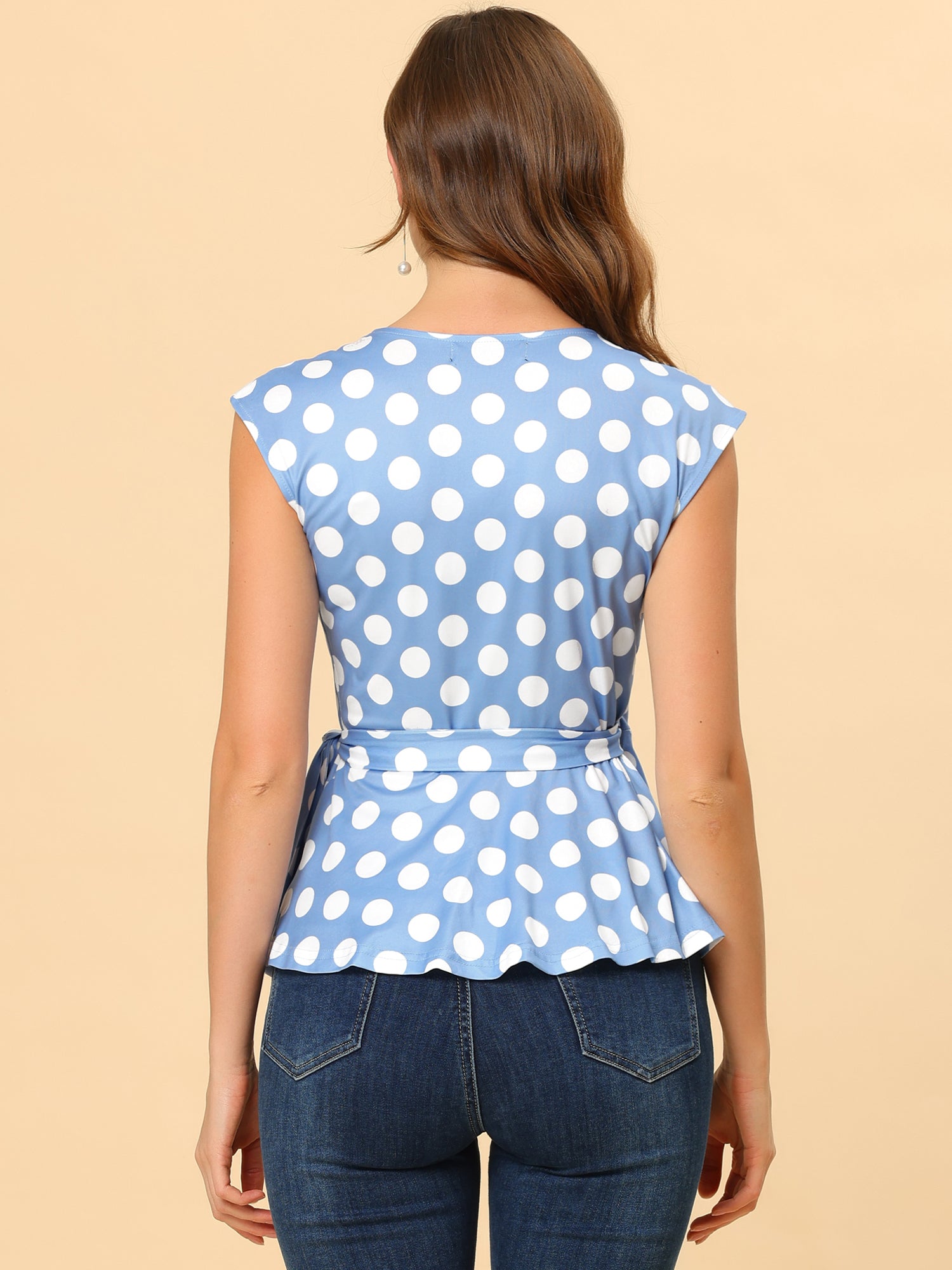 Women's Sleeveless Blouse Elegant Deep V Neck Self Tie Front Polka Dots Wrap Top