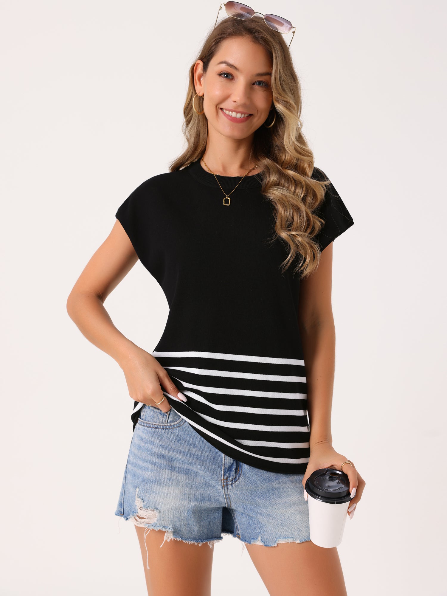 Women's Sleeveless Round Neck Striped Sweater Vest Casual Cap Sleeve Ribbed Knit Pullover Tank Top