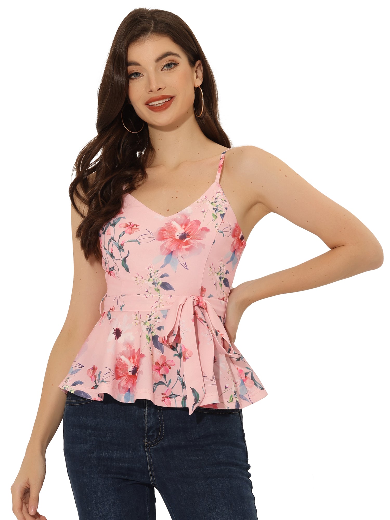 Women's Tank Top V Neck Tie Waist Peplum Floral Sleeveless Cami