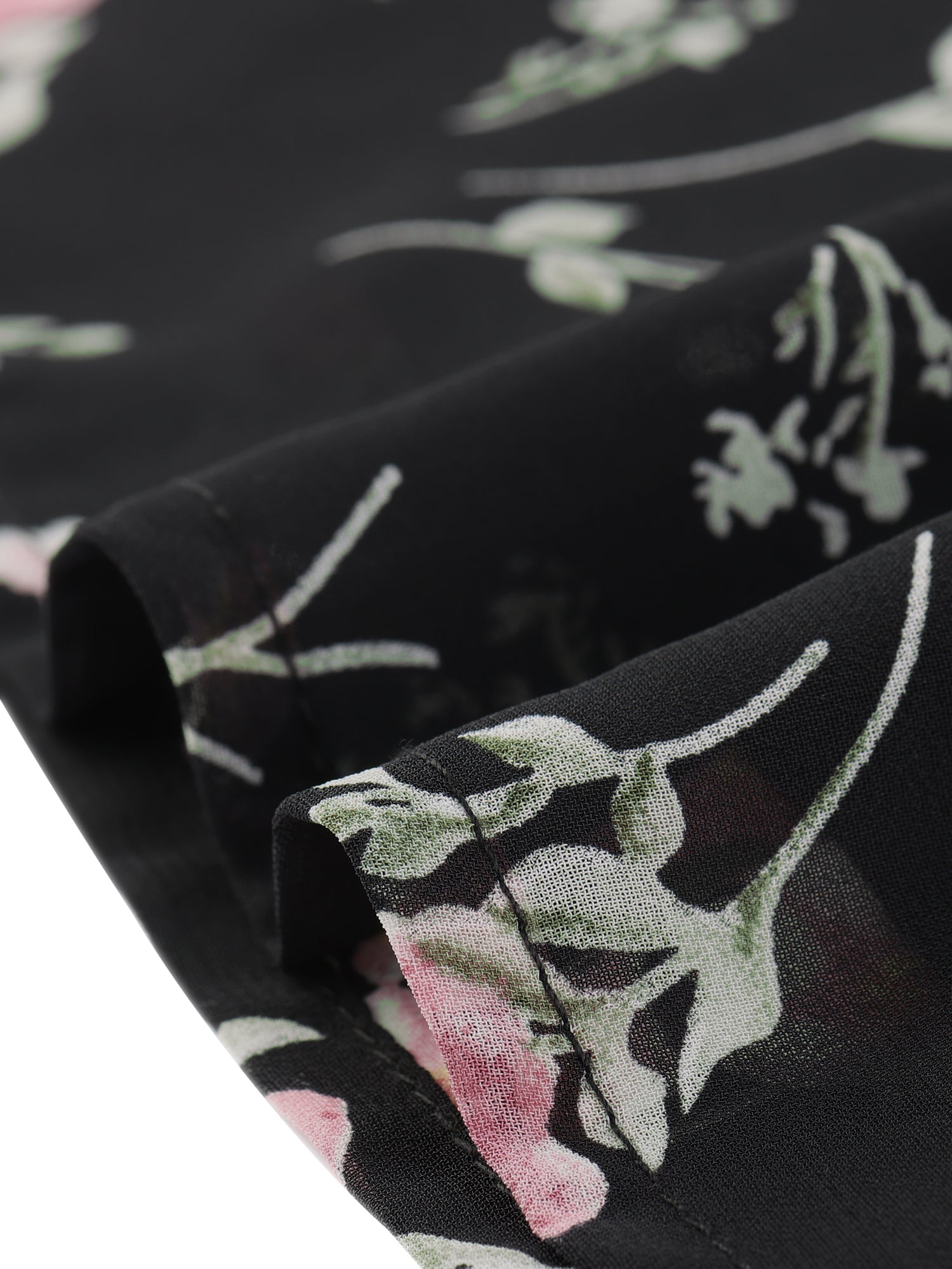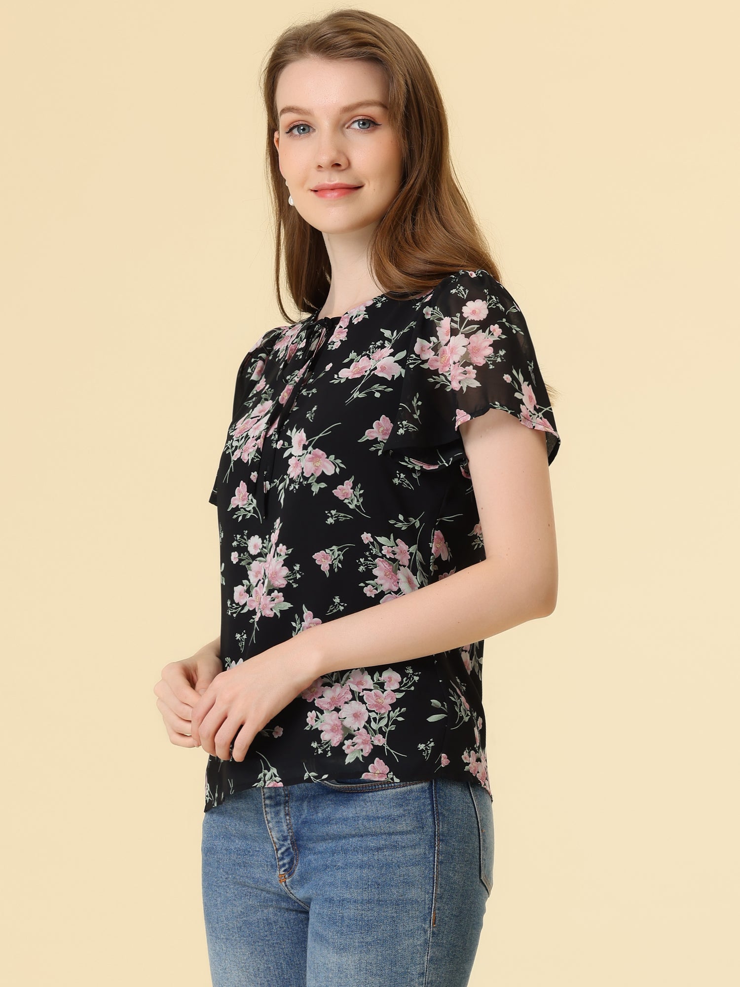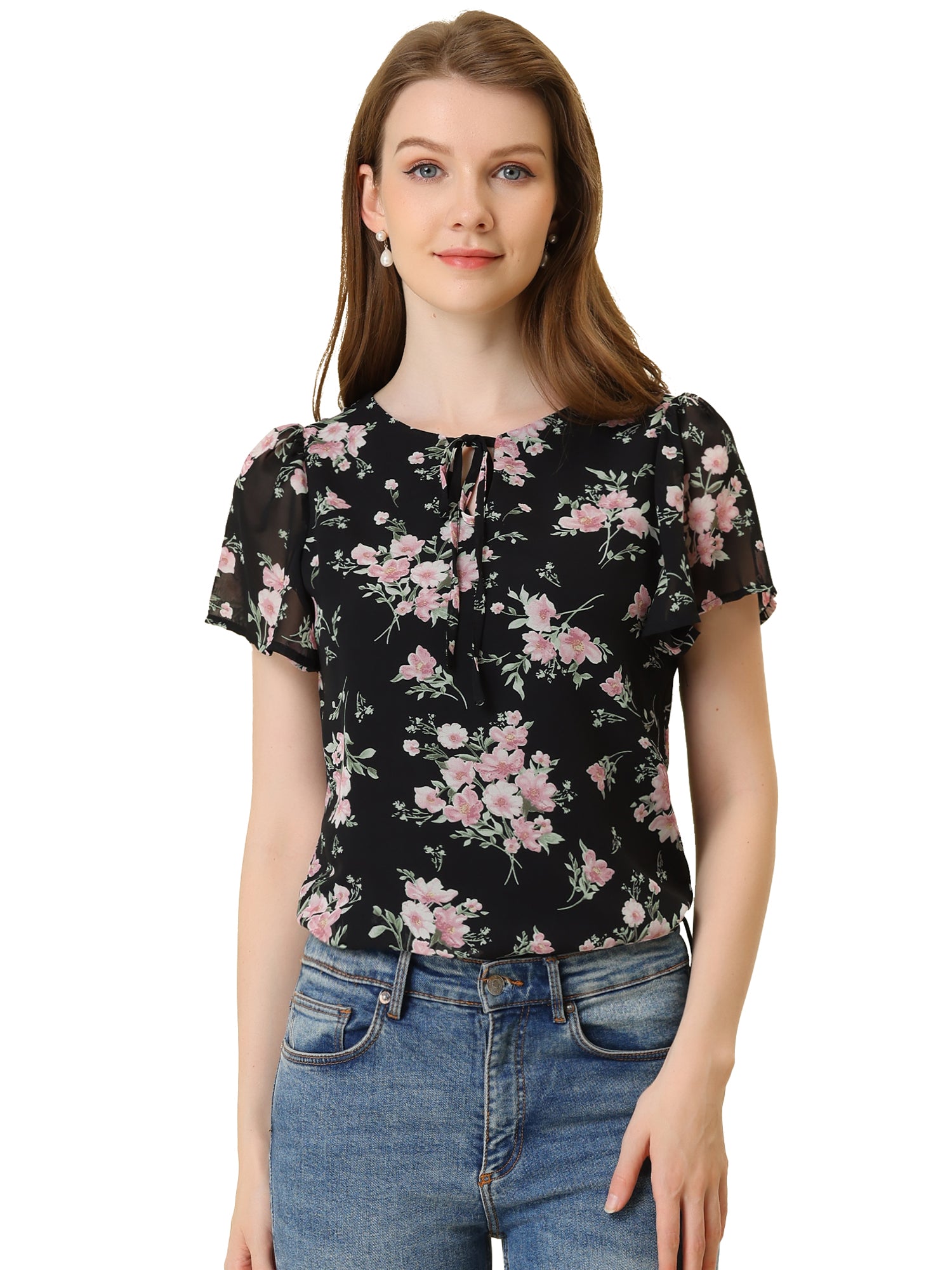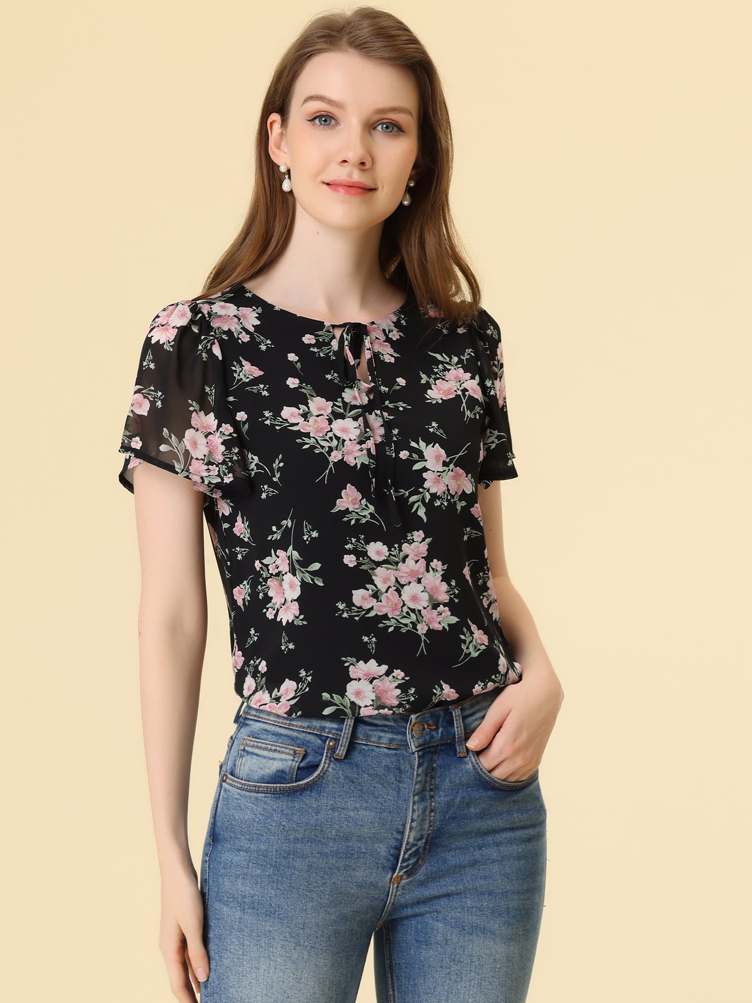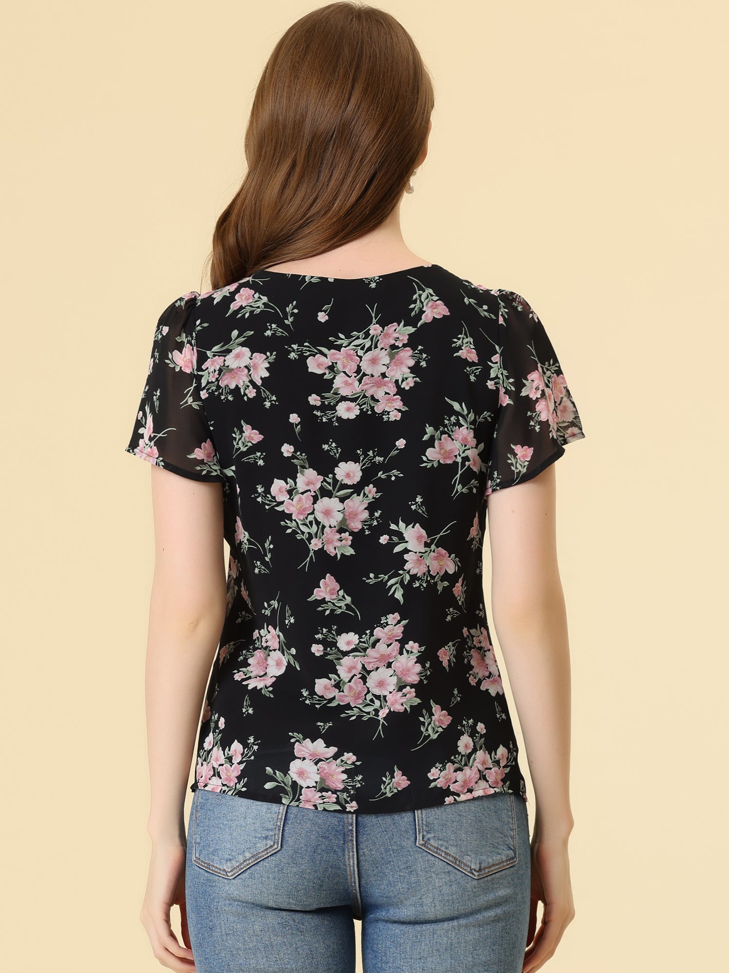 Women's Tie V Neck Flutter Sleeves Elegant Top Floral Blouse