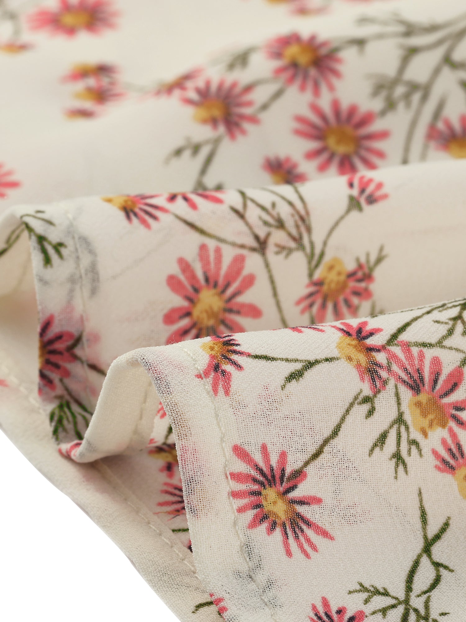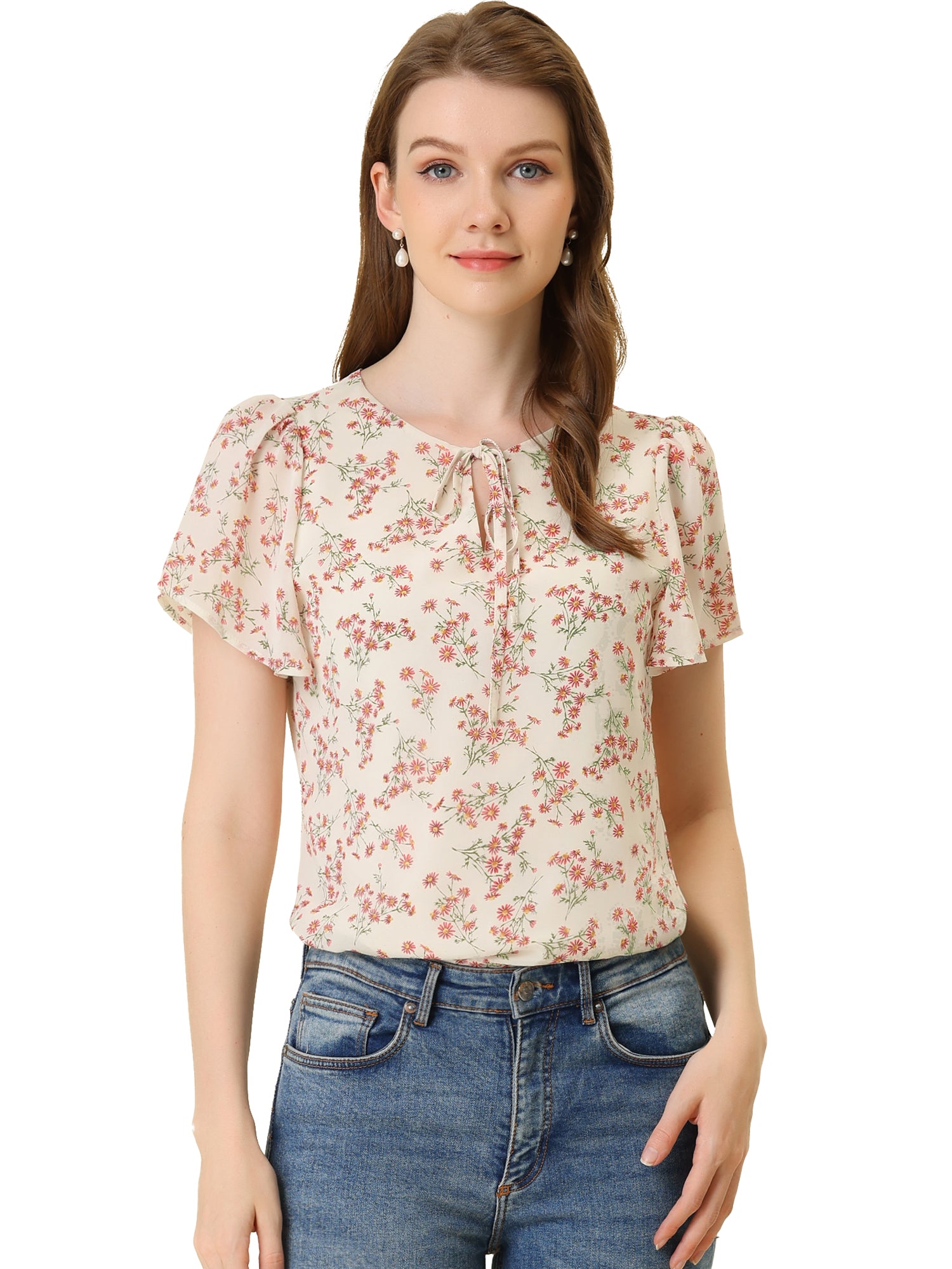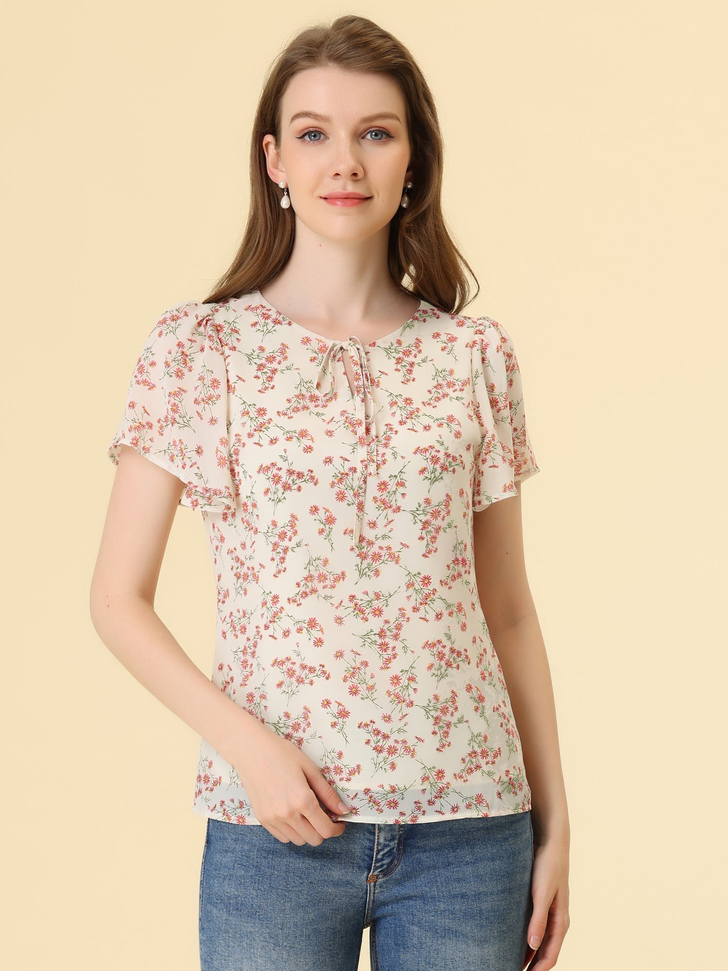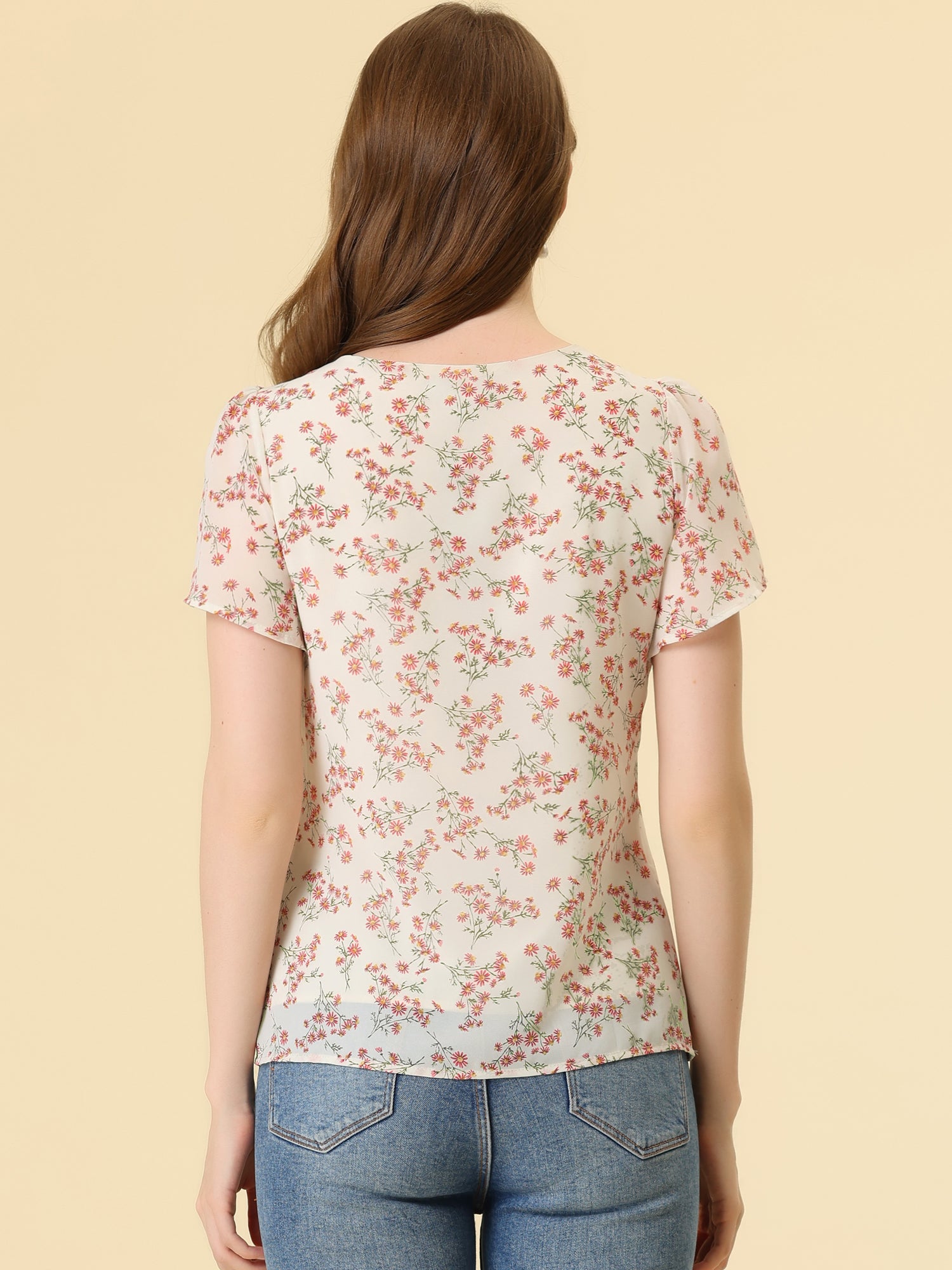 Women's Tie V Neck Flutter Sleeves Elegant Top Floral Blouse