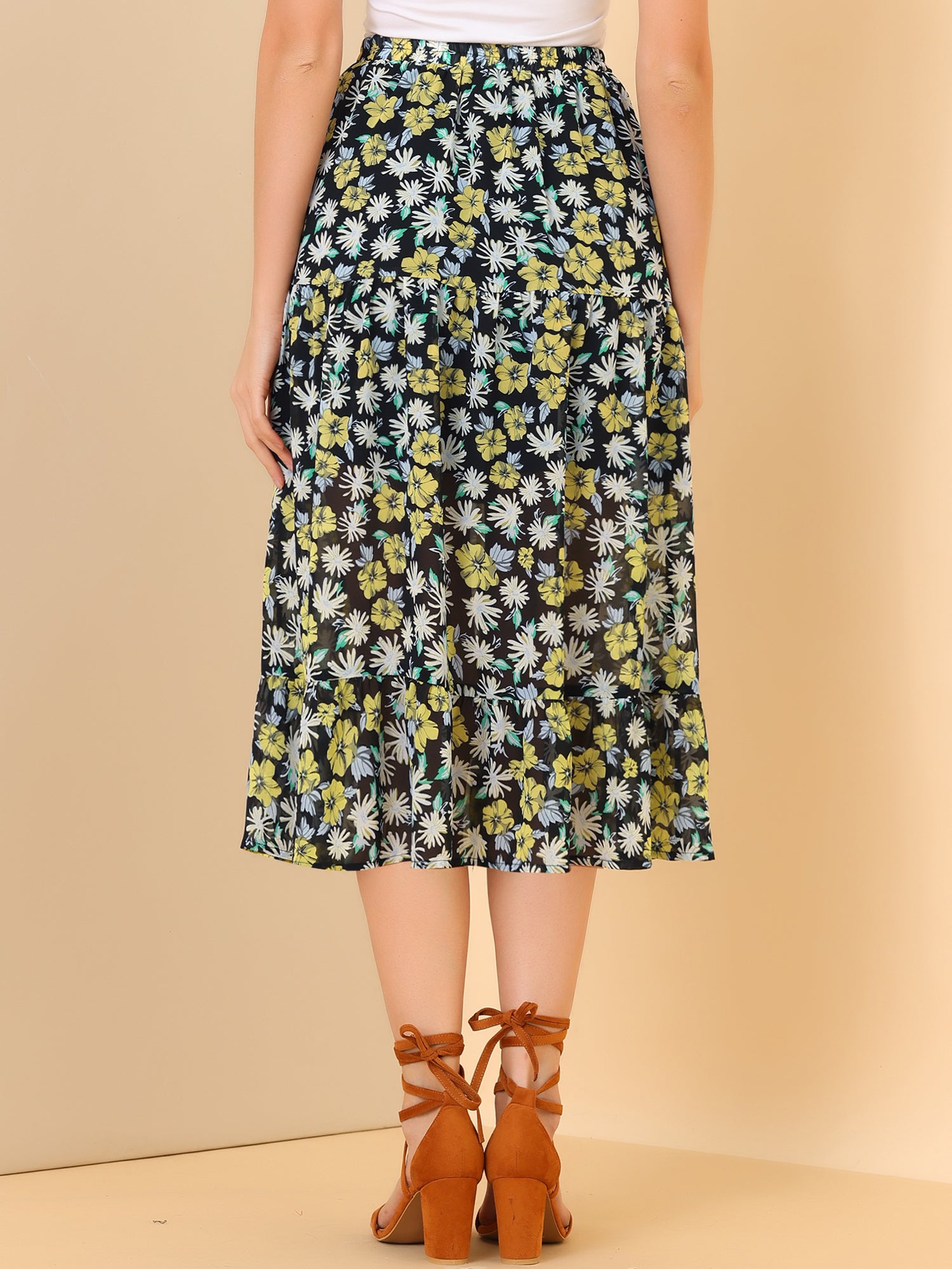 Women's Tiered A-line Flare Swing Elastic Waist Ruffle Floral Skirt