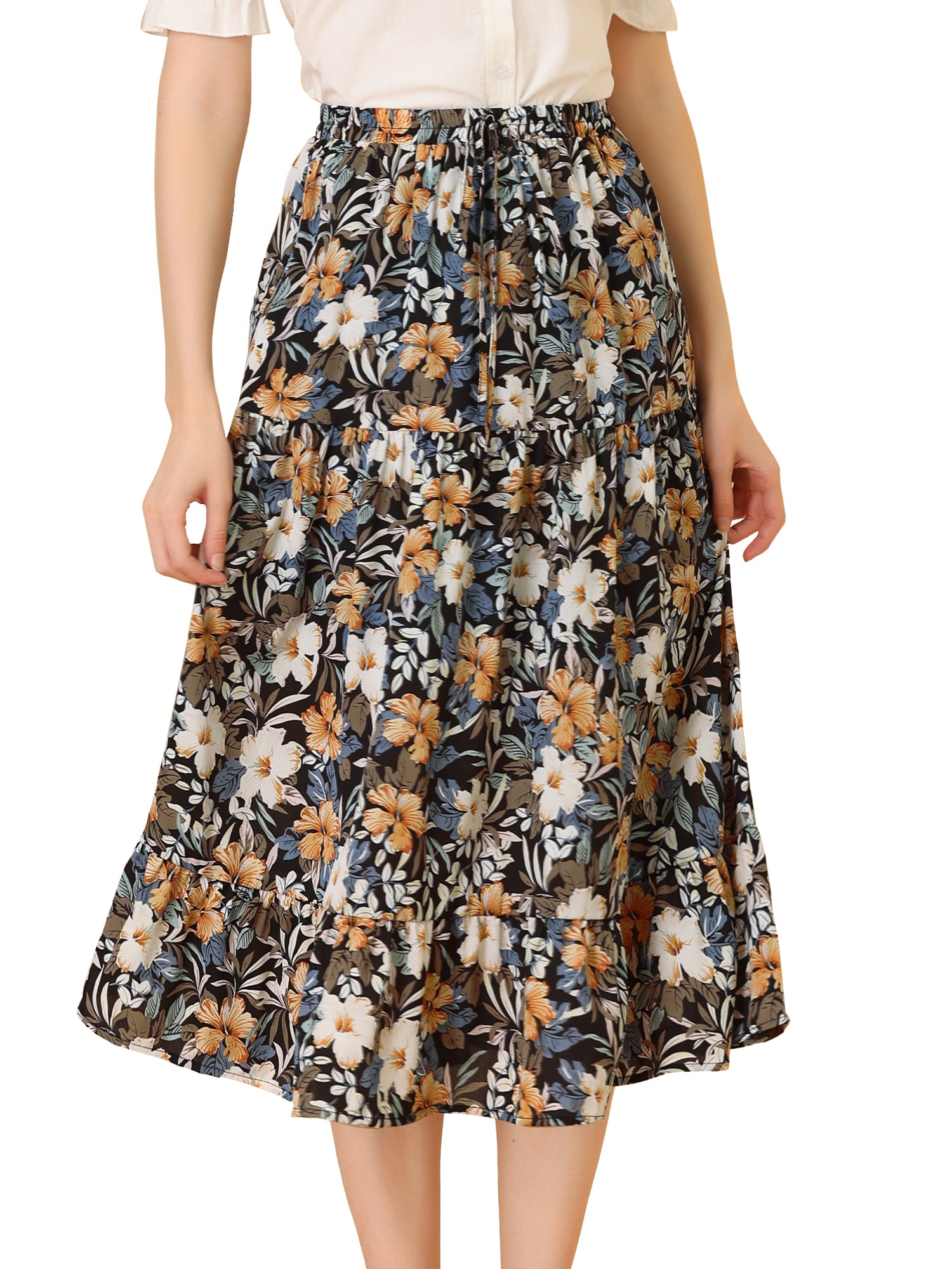 Women's Tiered A-line Flare Swing Elastic Waist Ruffle Floral Skirt