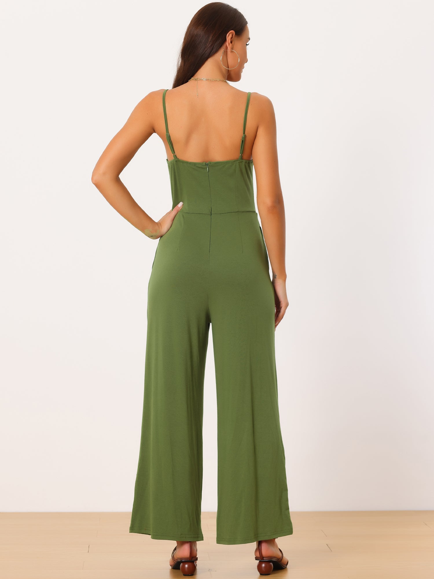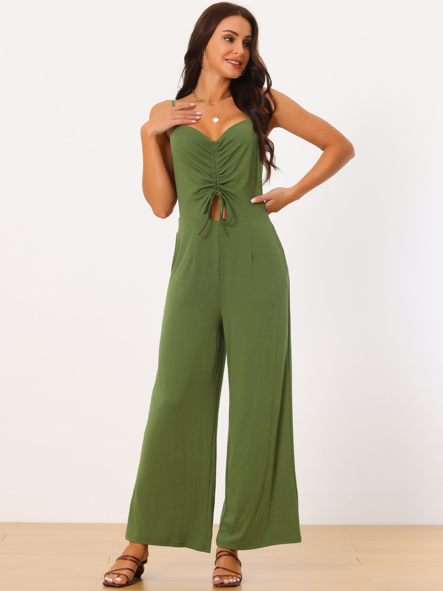 Women's V Neck Ruched Drawstring Front Sleeveless Spaghetti Straps Wide Leg Long Jumpsuits