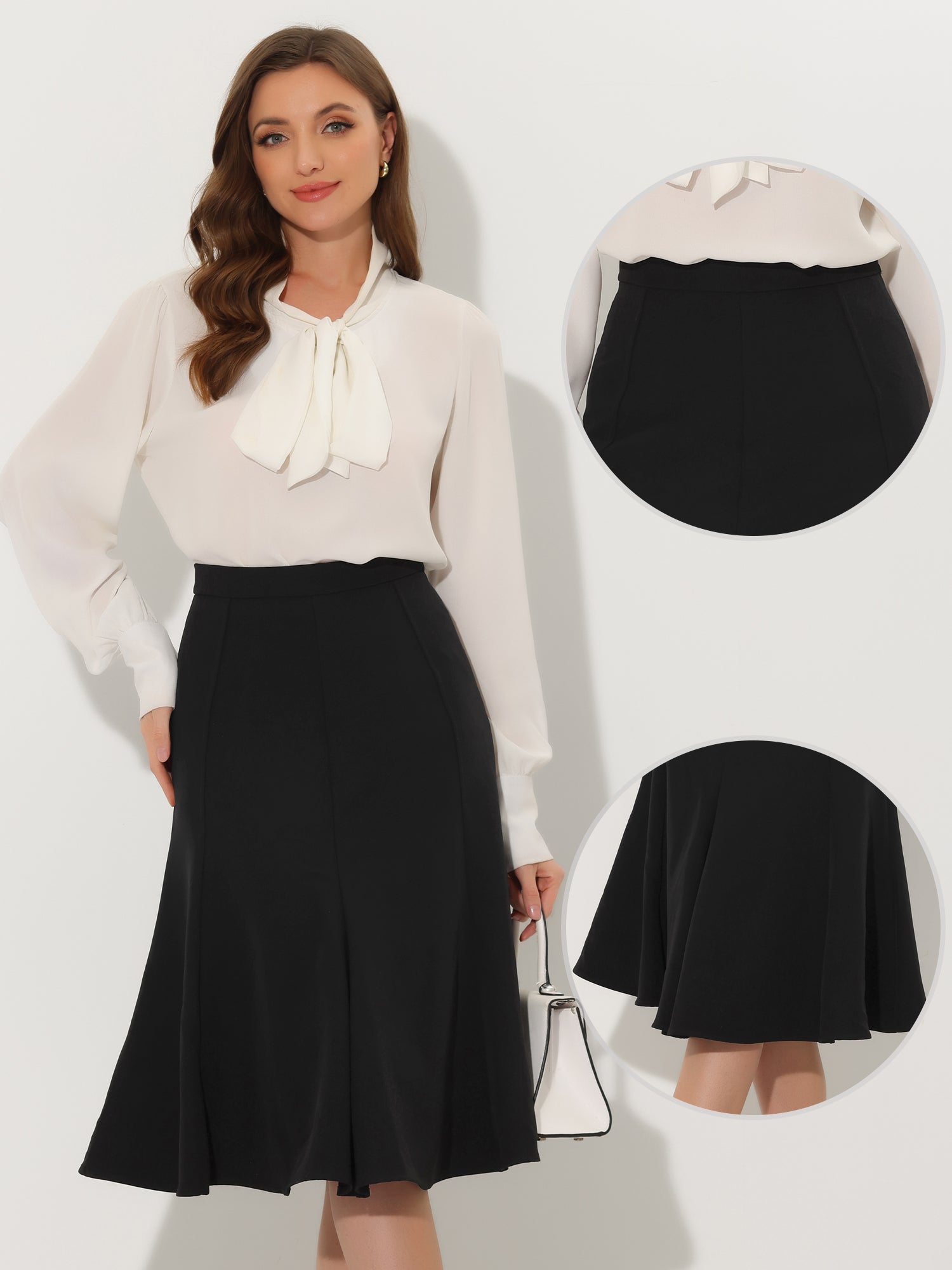 Women Side Zipper High Waist Elegant Flared Flowy A Line Work Midi Skirt