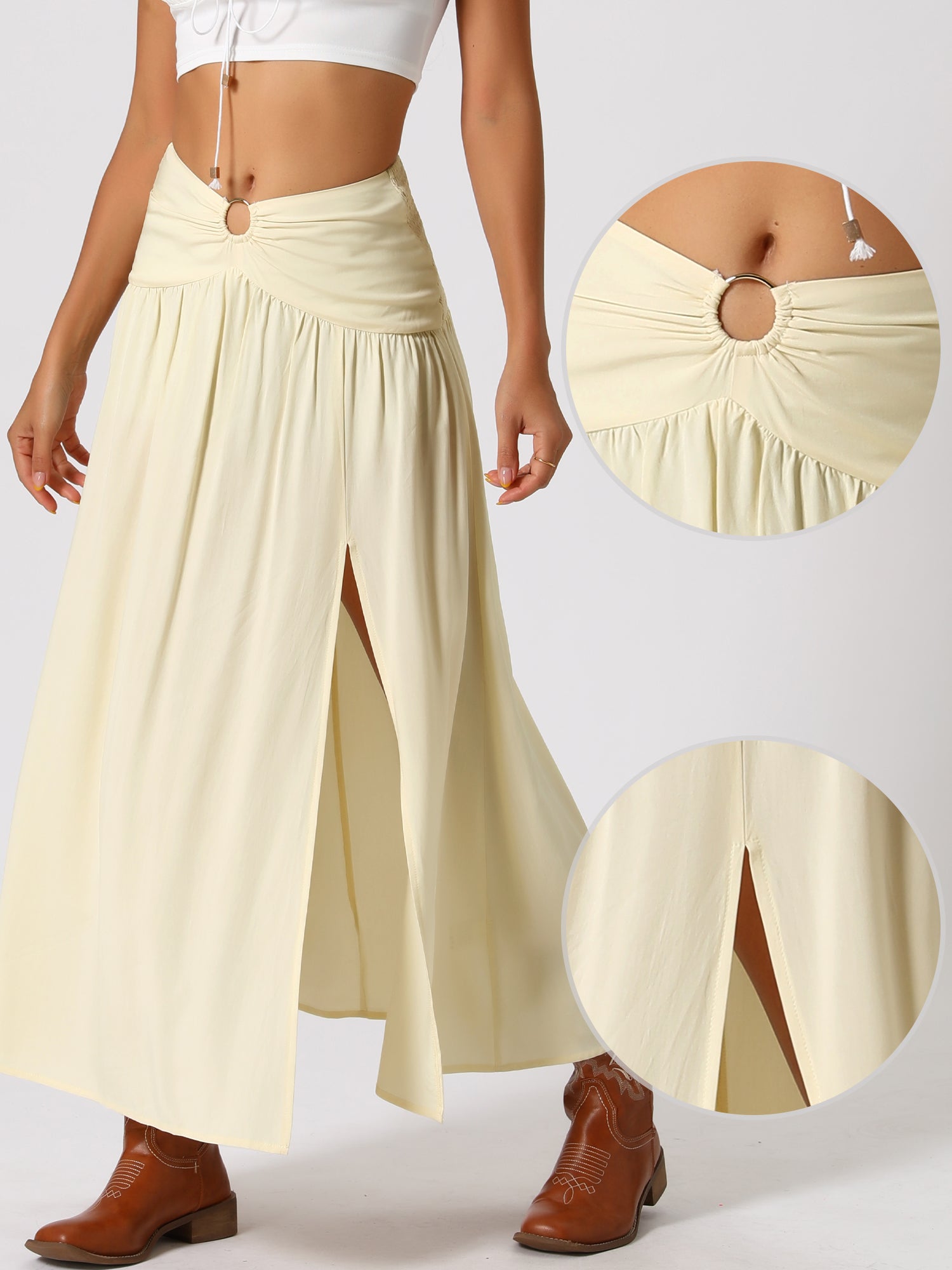 Women's Bohemian Keyhole Smocked Split High Waist Summer Midi Beach Skrit