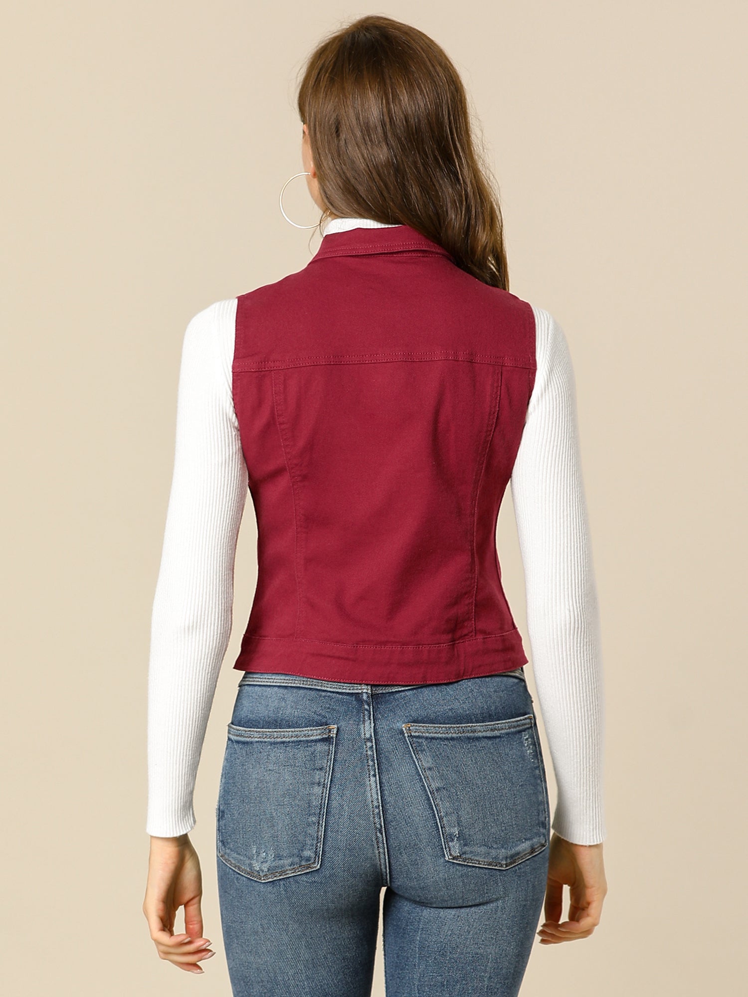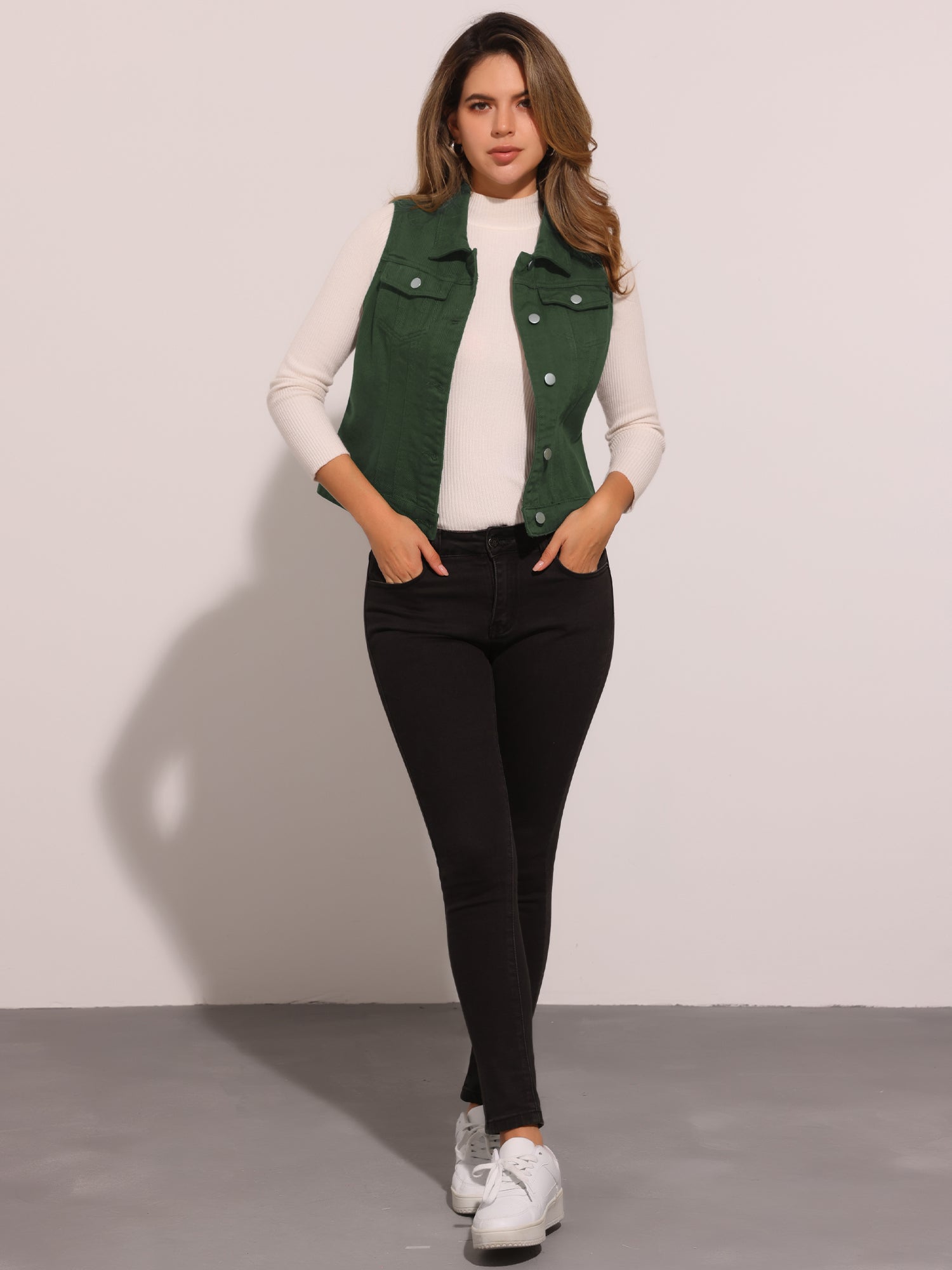 Women's Buttoned Washed Denim Vest Jacket W Chest Flap Pockets (Available in Plus Size)