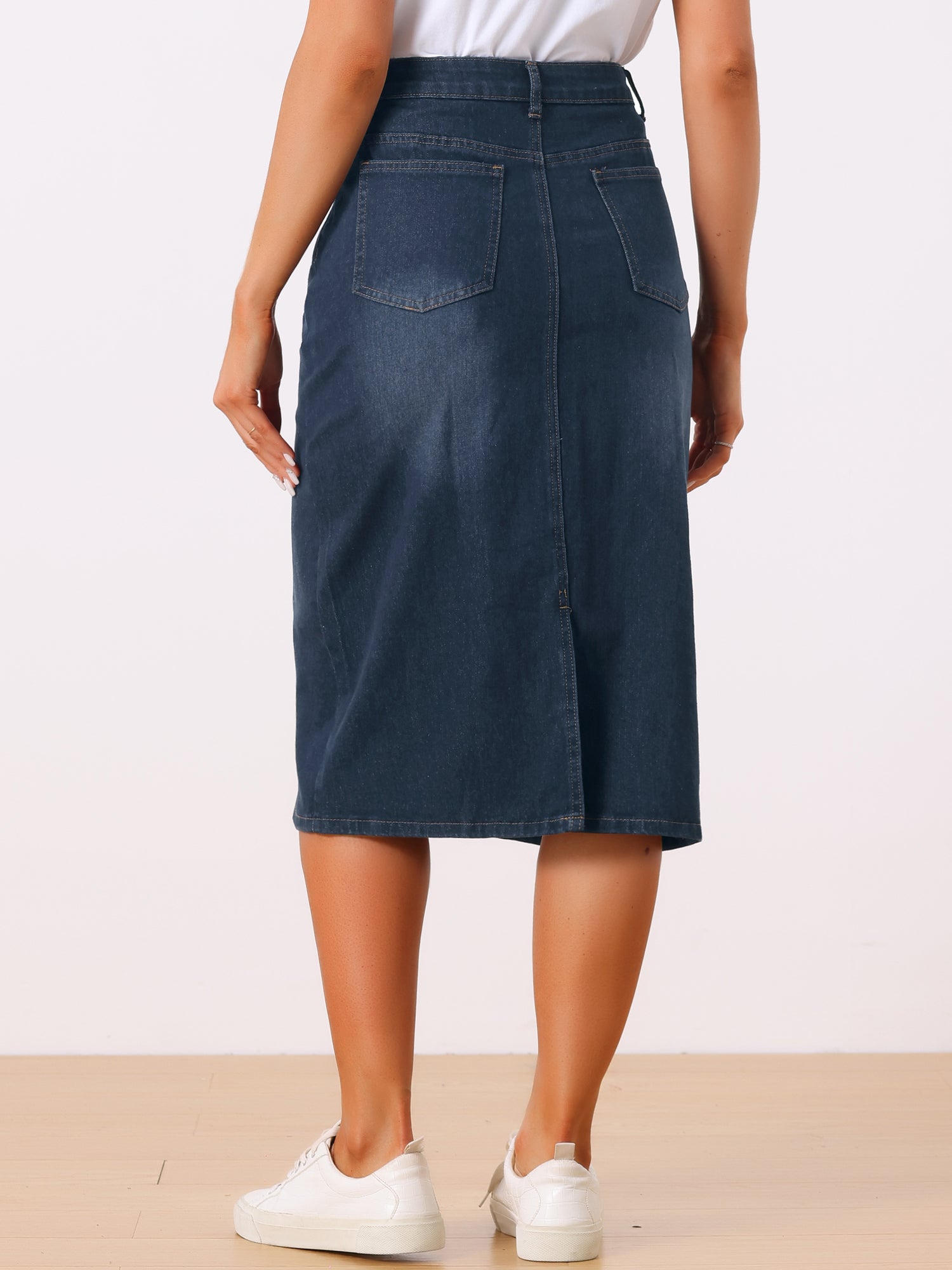Women's Casual Denim Skirt High Waist Split Back Pockets Midi Jean Skirt