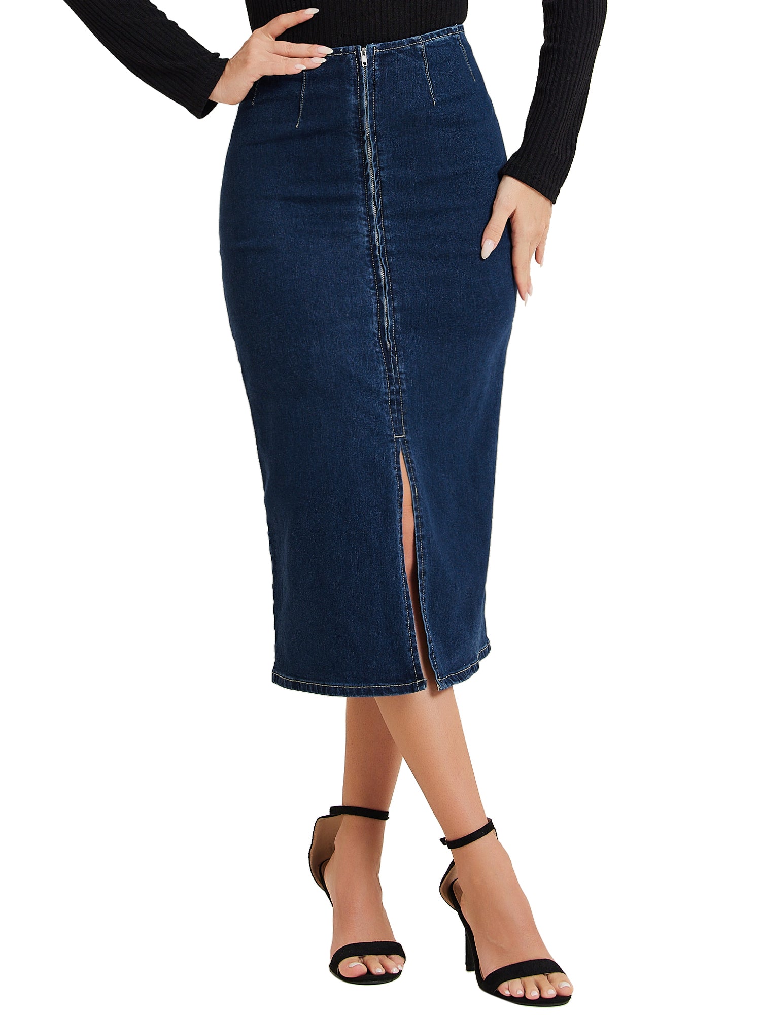 Women's Denim Skirt Front Slit Zipper High Waist Bodycon Midi Jean Skirt