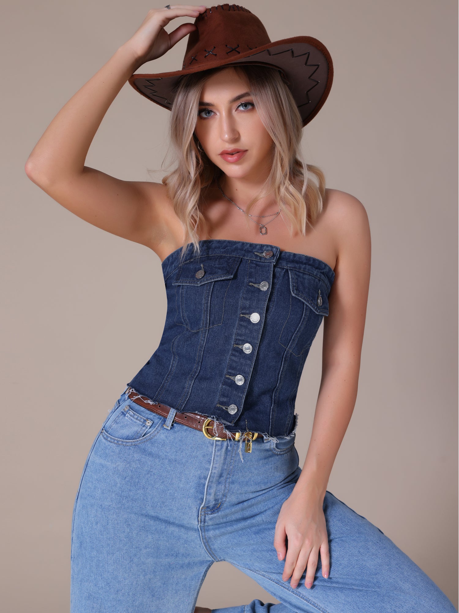 Women's Denim Tube Tops Button Front Raw Hem Smocked Back Crop Strapless Bandeau Top