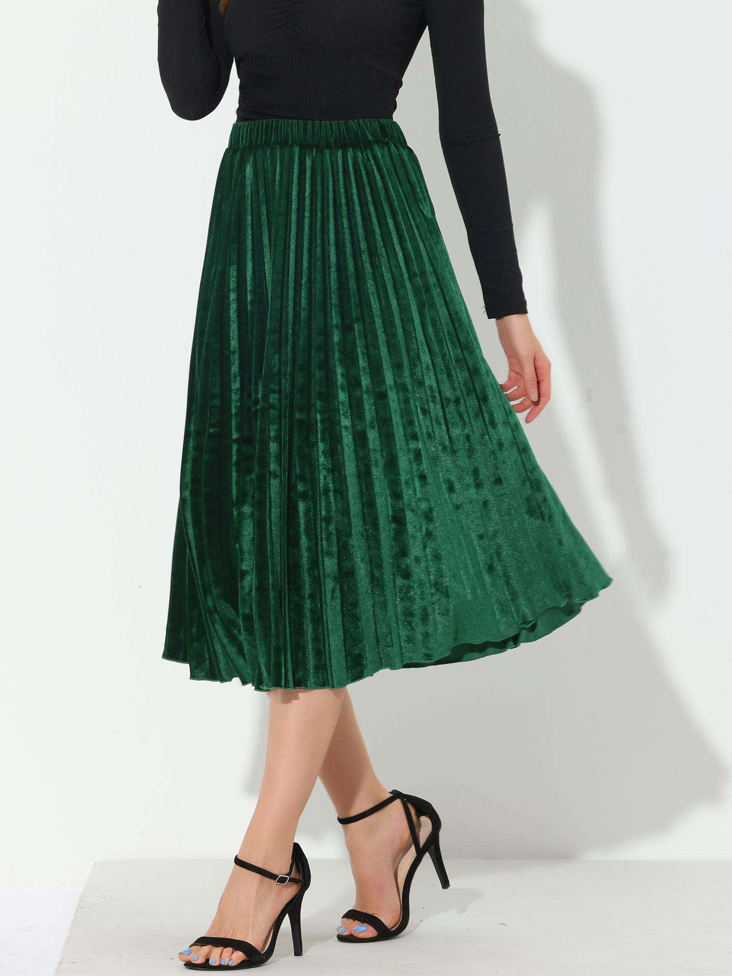 Women's Fall Winter Elastic High Waist Flowy Swing Holiday Velvet Pleated Midi Skirt
