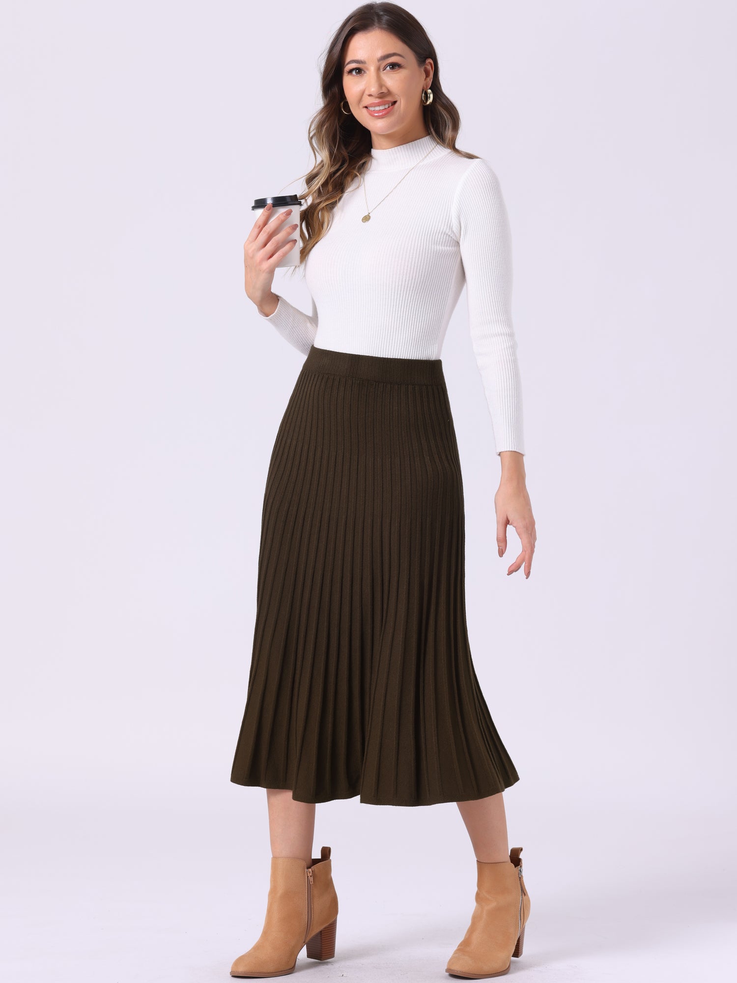 Women's High Waist A-Line Pleated Knitted Skirt Sweater Midi Skirt