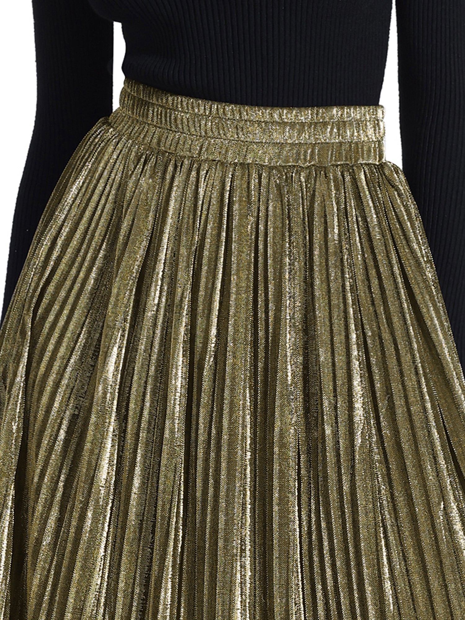 Women's Metallic Shiny Glitter Party High Waist Flared Plaeted Midi Skirt