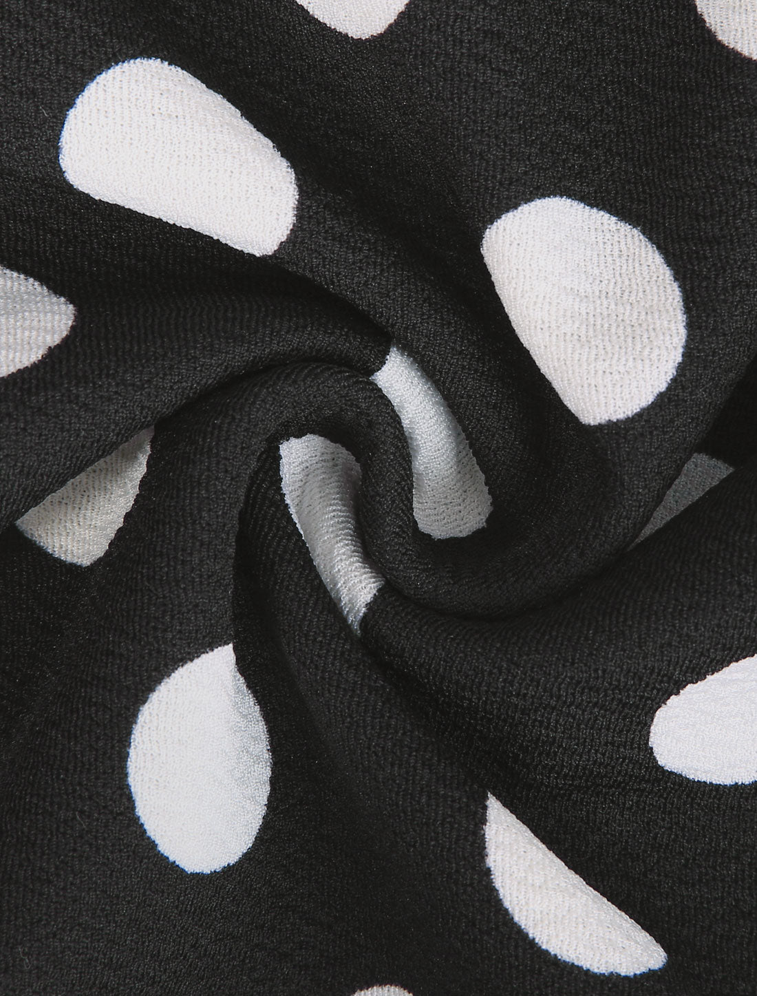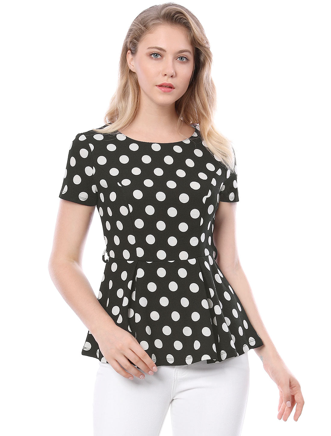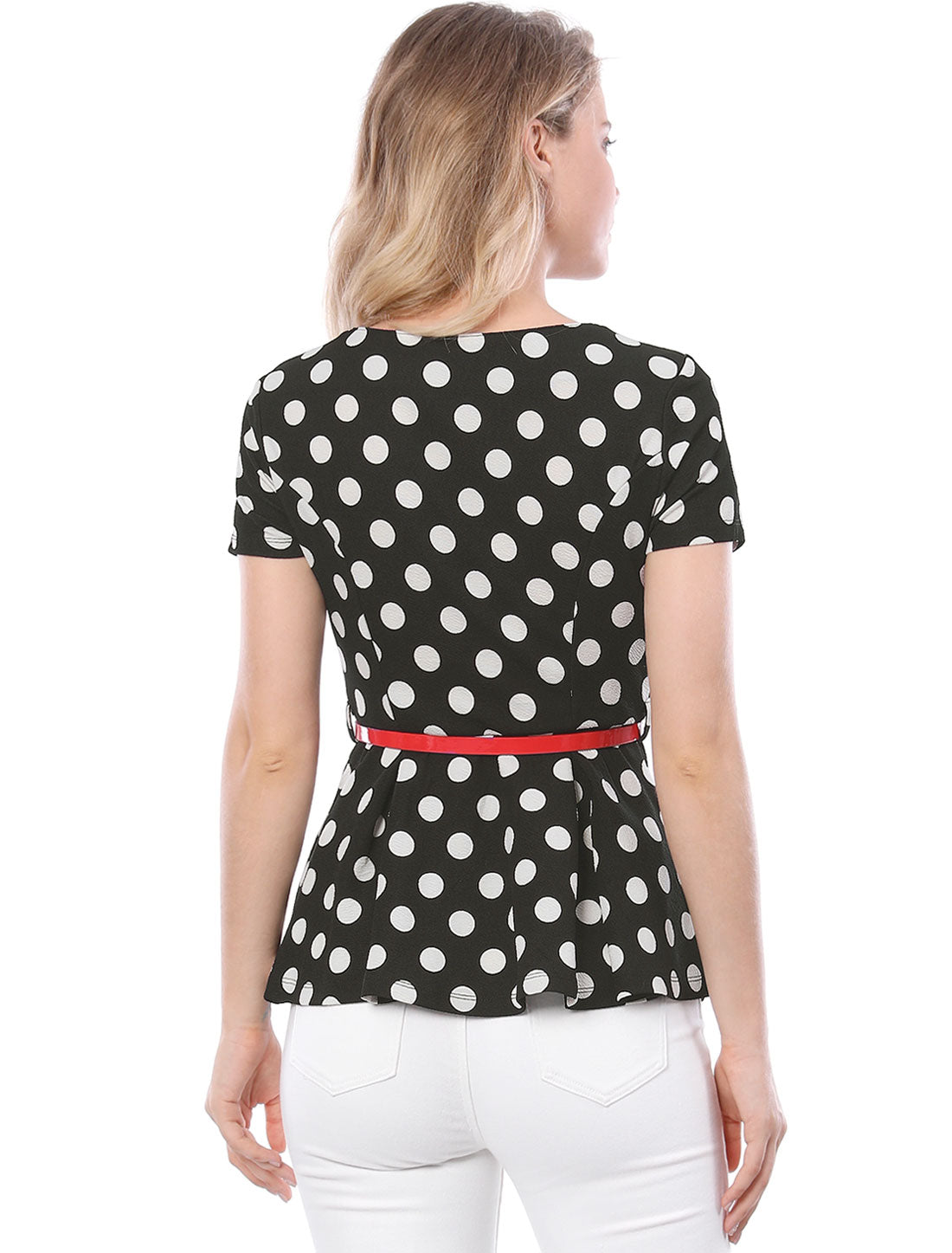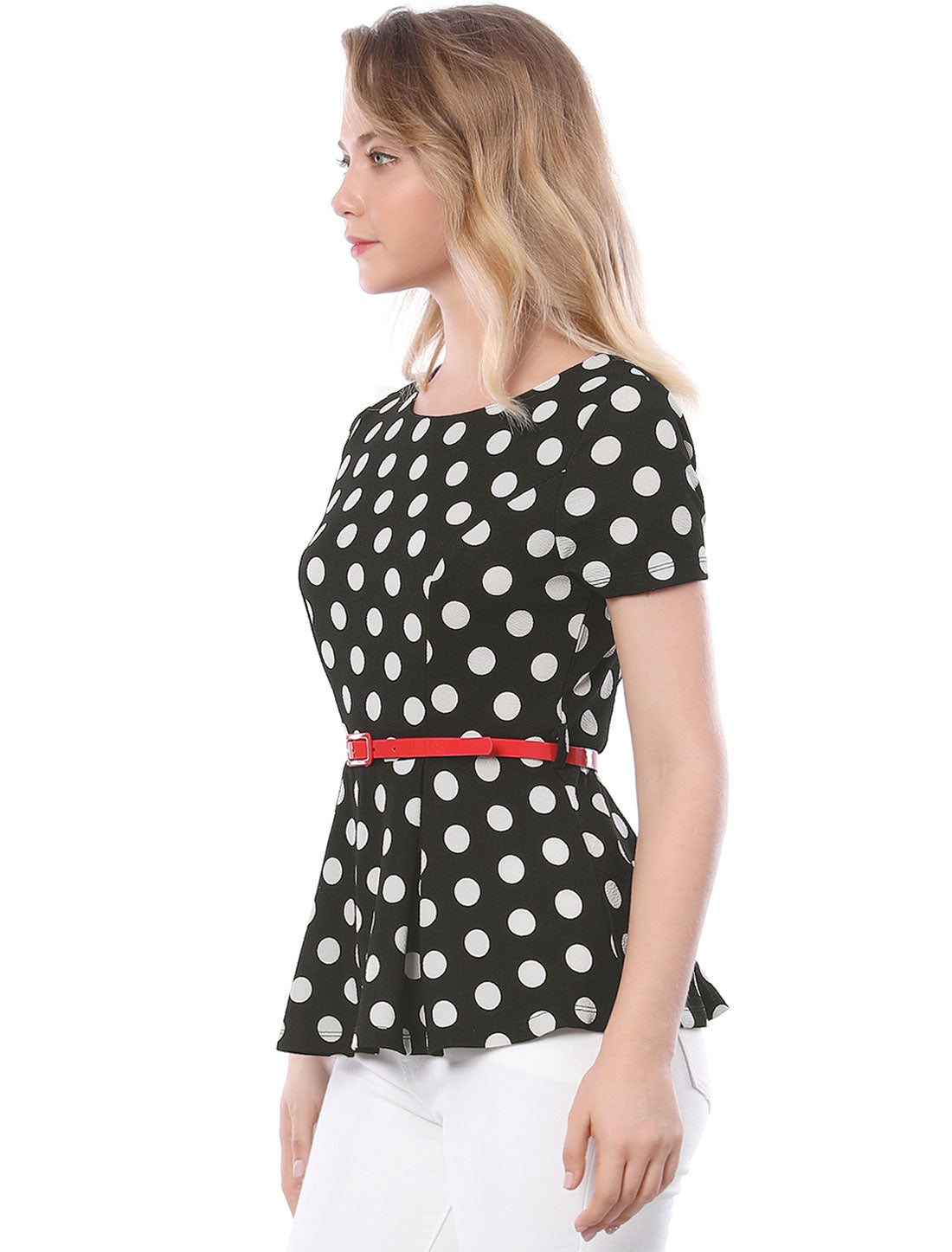 Women's Peplum Top Belted Round Neck Contrast Polka Dots Blouse